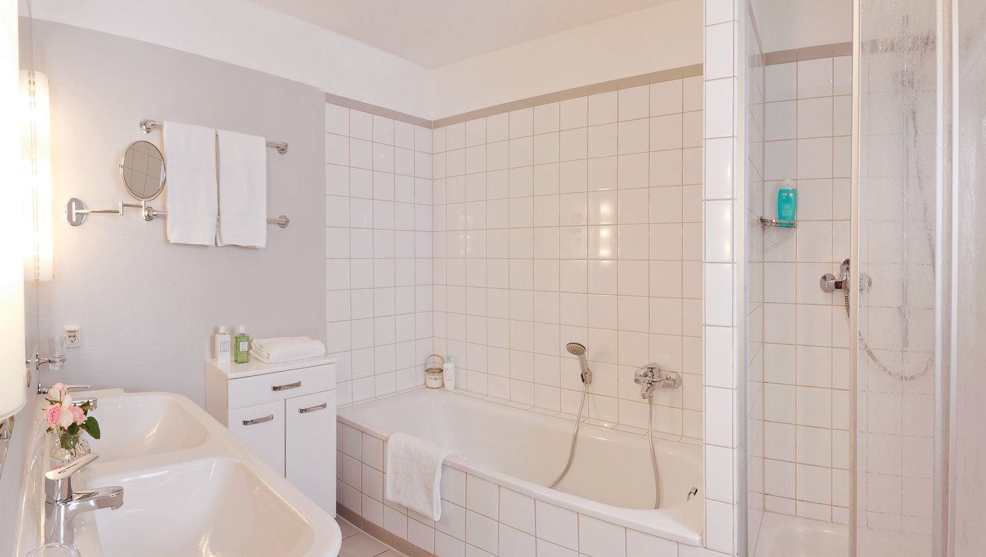 Damit Sie Ihre wohlverdiente Urlaubszeit bereits am Anreisetag in vollen Zügen genießen können, haben wir das Bett für Sie und das für Ihre lieben Mitreisenden bereits bezogen und ein Duschtuch sowie ein kleines Handtuch bereitgelegt. Das Badzimmer ist mit Badewanne, Dusche, WC und einem Haartrockner ausgestattet.