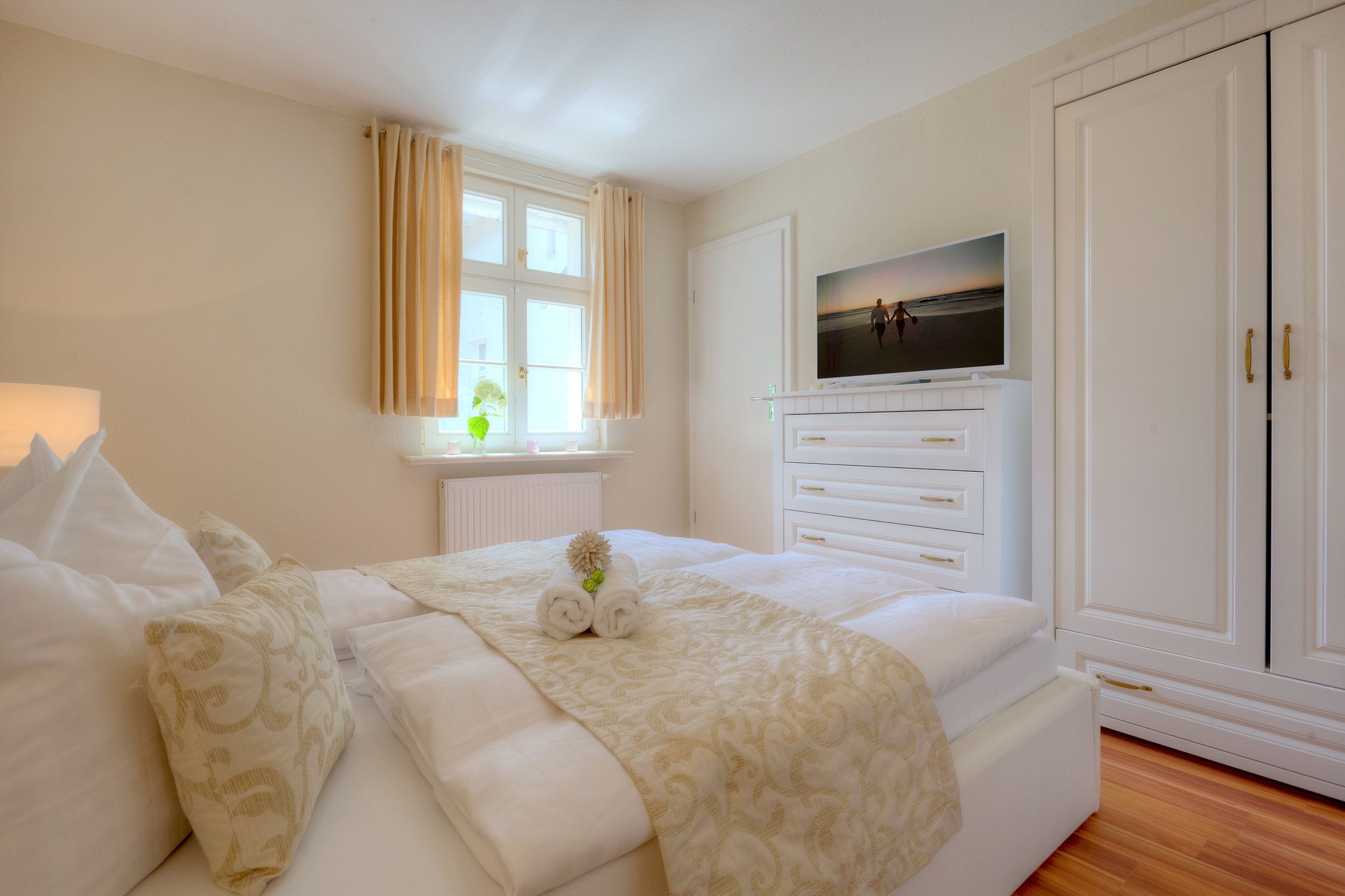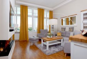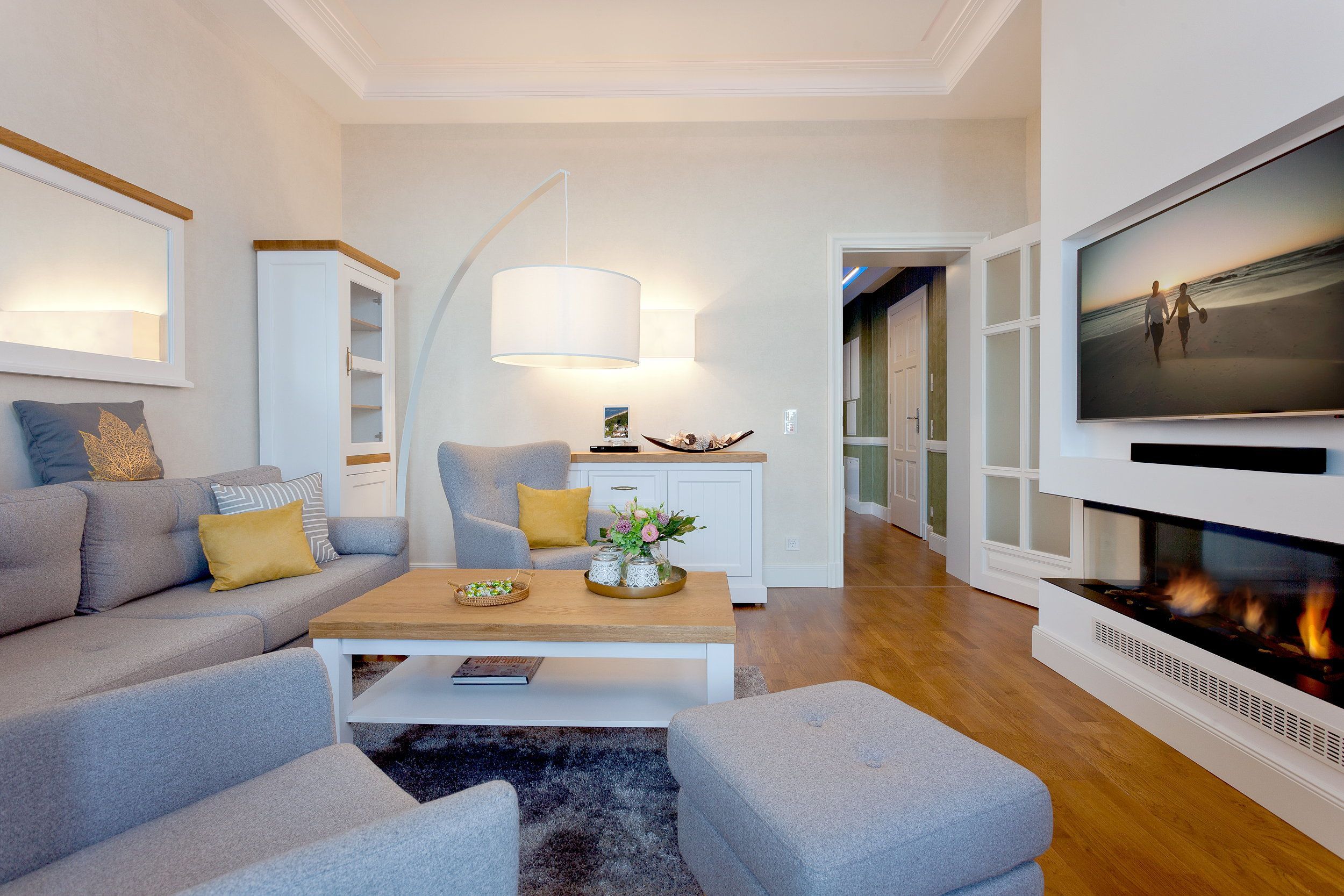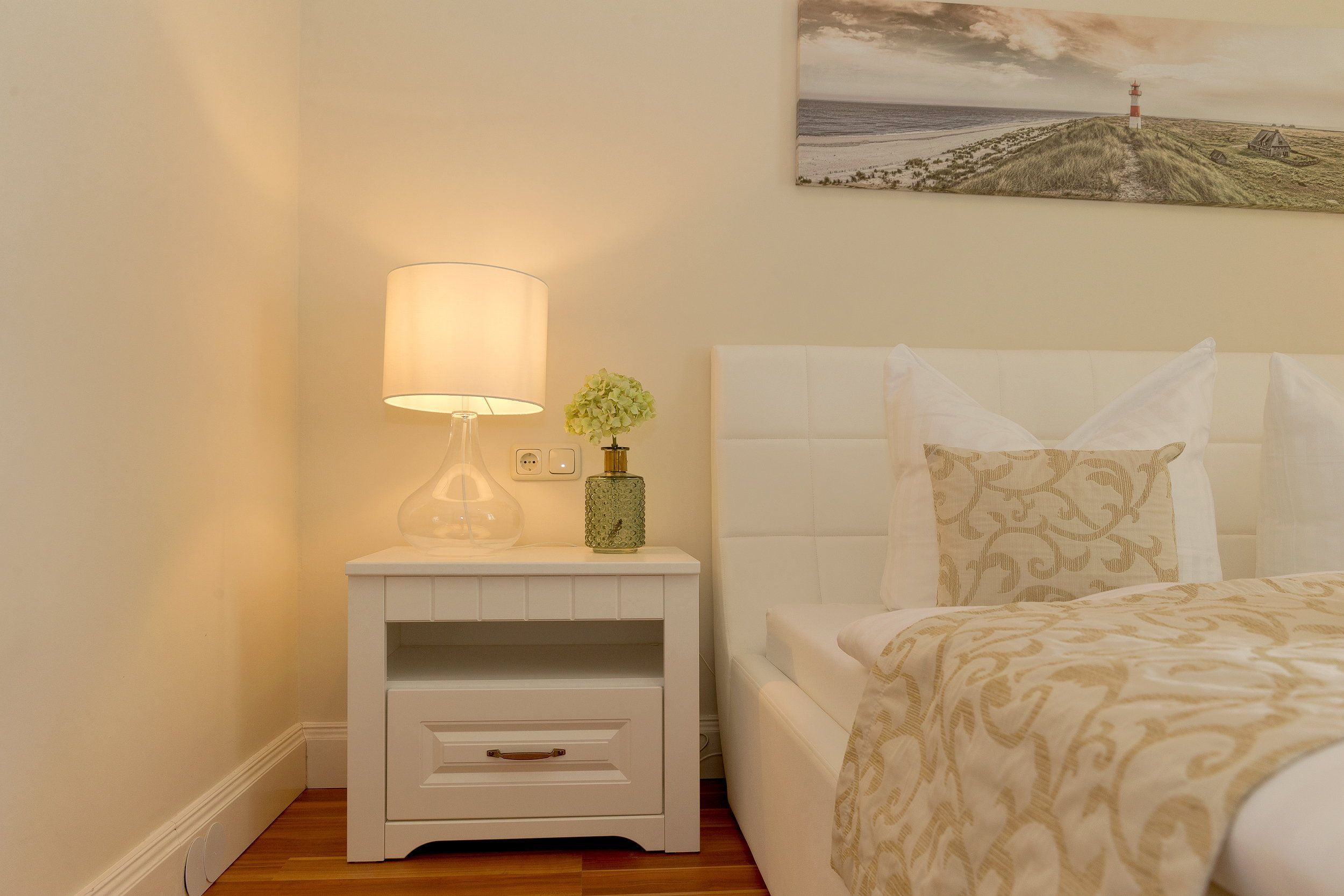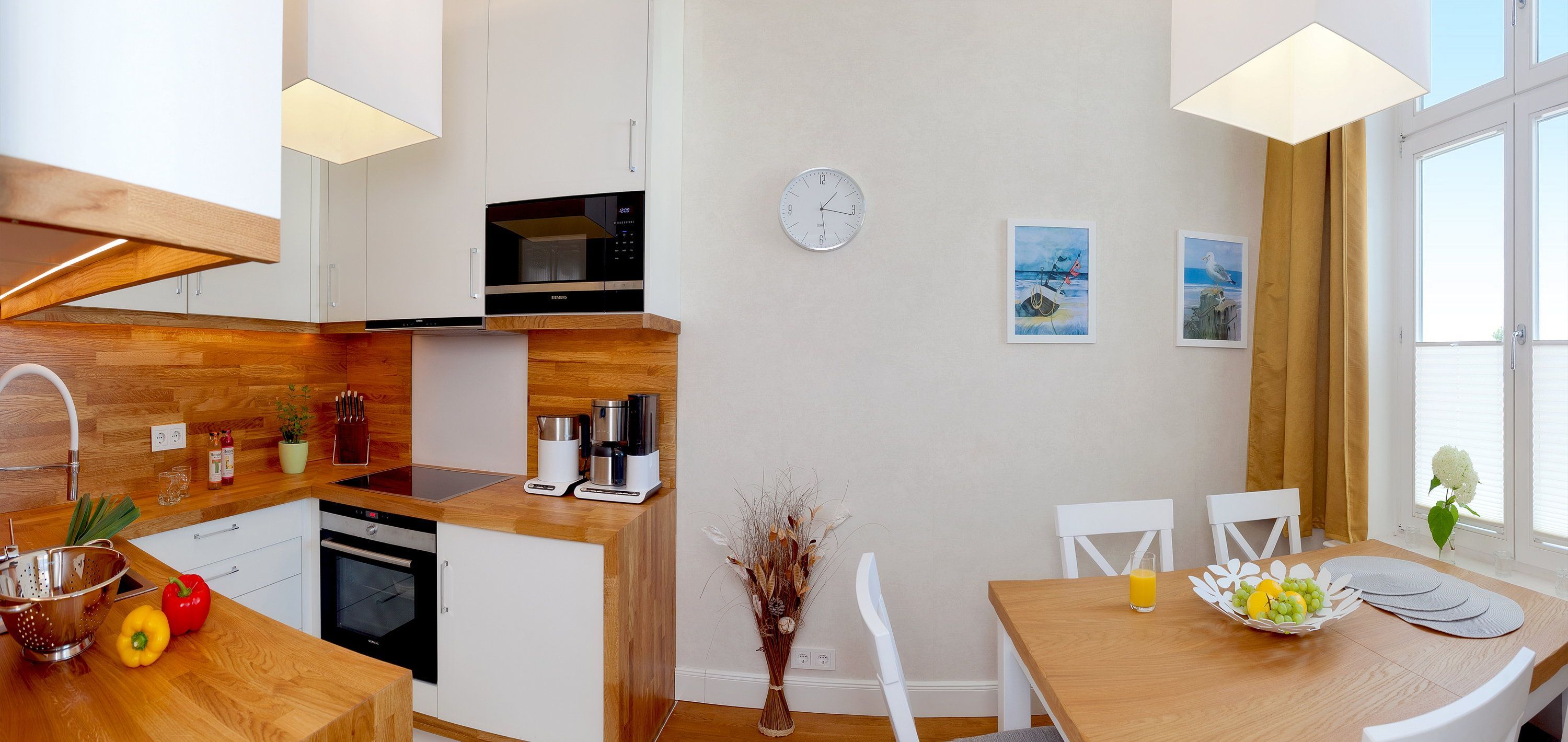 Auf 85 Quadratmetern begrüßen wir Sie in dem 3-Raum-Appartement im modernen und gemütlichen Landhausstil zu sonnigen und erholsamen Urlaubstagen. Dank der Großzügigkeit und der idealen Raumaufteilung ist das Appartement im 1. Obergeschoss des Hauses das ideale Urlaubsdomizil für bis zu 5 Personen. In dem großzügigen Wohnbereich wartet eine einladende Sitzecke mit Couch und zwei Sesseln, Flat-TV u.v.m. zum Entspannen auf Sie. Zur Gemütlichkeit trägt der integrierte Gaskamin zu jeder Jahreszeit bei. Auf dem angrenzenden Süd-West-Balkon, können Sie einen erlebnisreichen Urlaubstag bei einem Glas Wein und dem Rauschen des Meeres ausklingen lassen und den Hauch von Ostseeblick in vollen Zügen genießen. Die separate vollausgestattete Küche ergänzt die Annehmlichkeiten dieses neuen Appartements mit allen Raffinessen: Backofen, Mikrowelle, Kühlschrank mit Gefrierfach, Toaster, Wasserkocher, Kaffeemaschine sowie einem Essplatz für 5 Personen von dem Sie einen herrlichen Blick über die Dächer von Heringsdorf haben. Die fünf Schlafplätze verteilen sich auf zwei Schlafzimmer: beide Schlafzimmer sind jeweils mit einem bequemen Doppelbett (160 x 200cm / zwei getrennte Matratzen und 180 x 200cm / durchgehende Matratze) ausgestattet, und der Schlafcouch im Wohnbereich. Beide Zimmer verfügen zusätzlich über einen Flat TV und über einen Kleiderschrank bzw. Kommode zum Verstauen Ihrer Habseligkeiten während Ihrer Urlaubszeit.