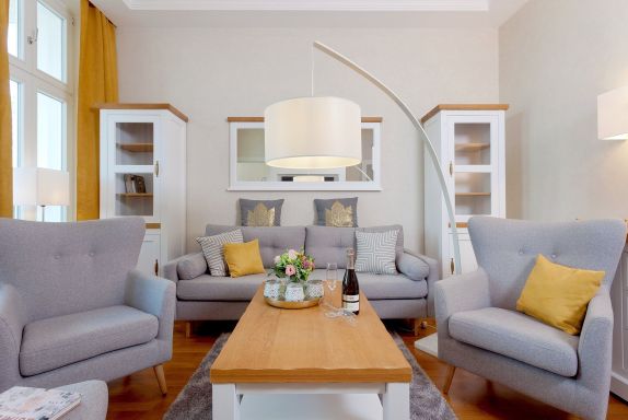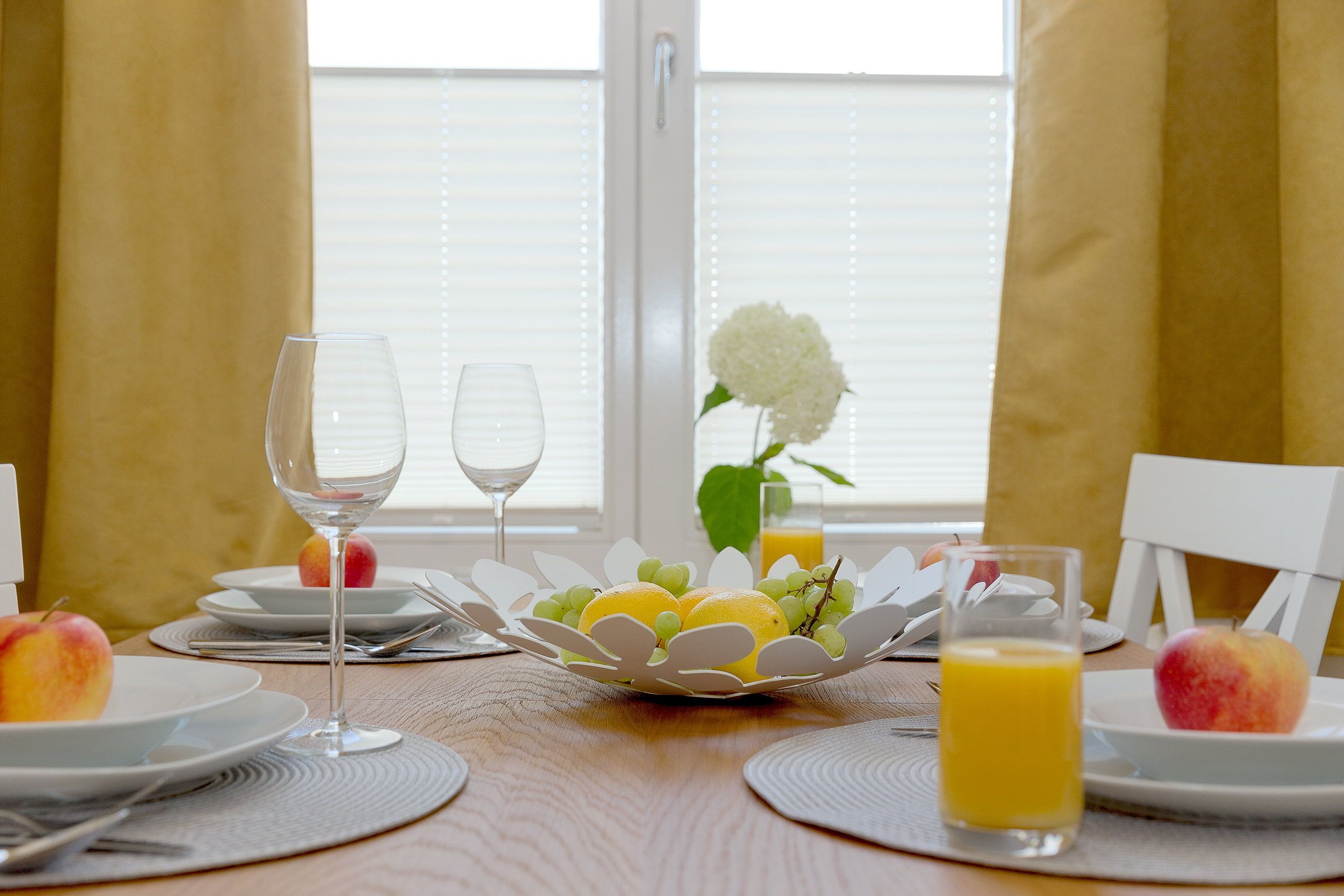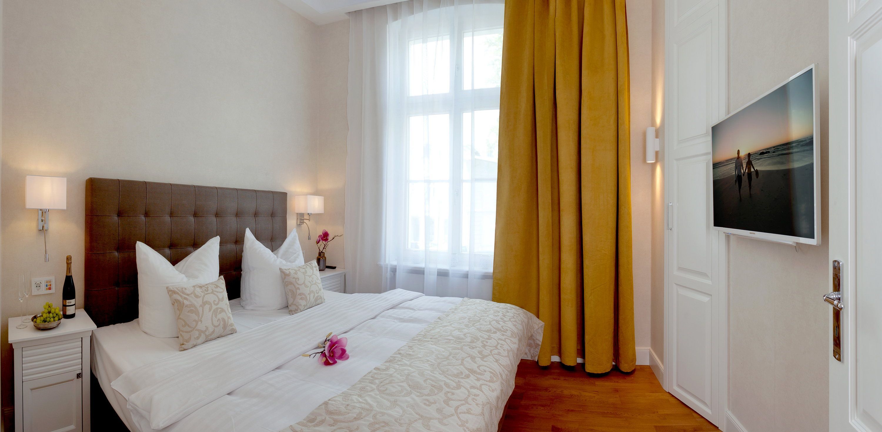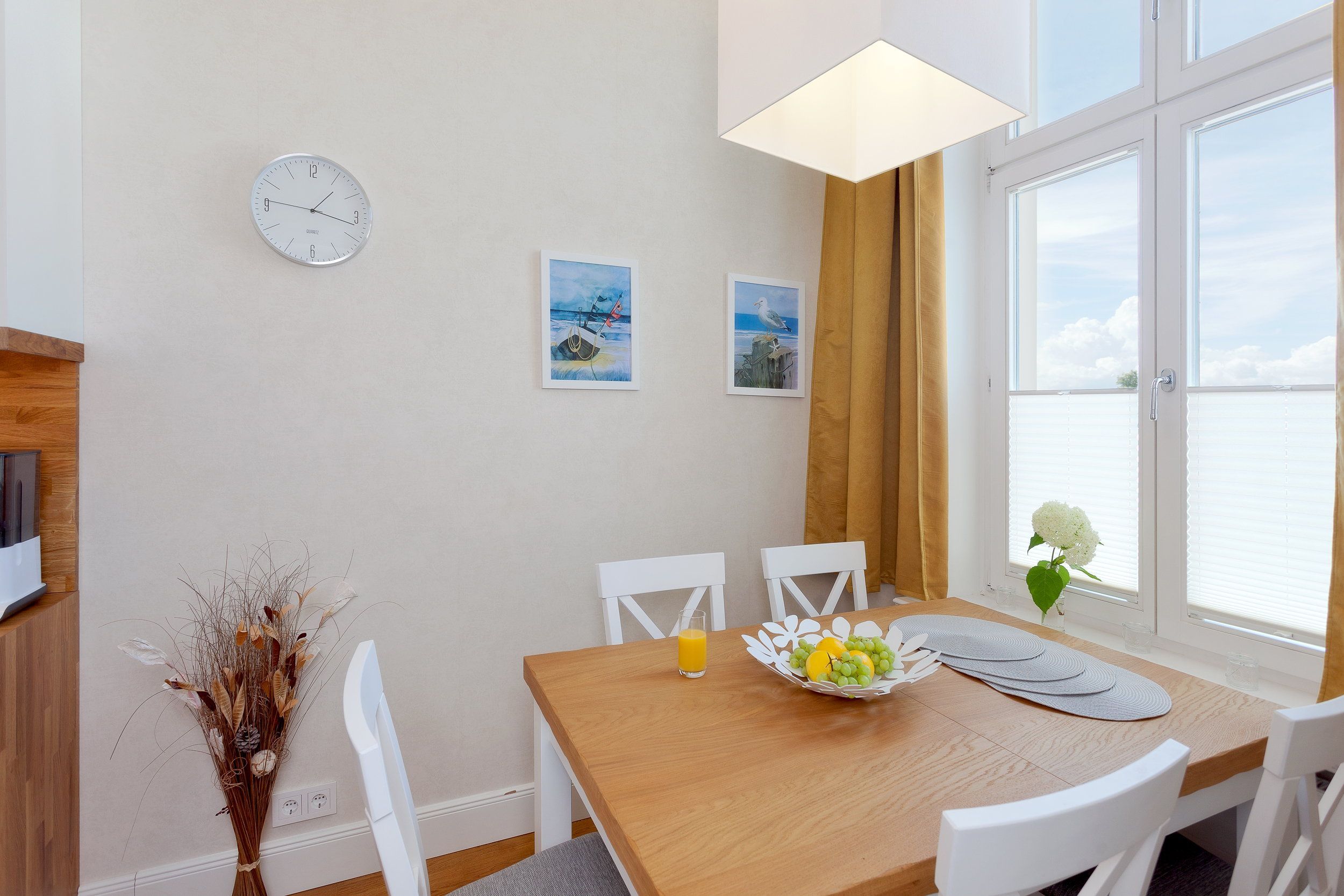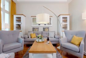 Auf 85 Quadratmetern begrüßen wir Sie in dem 3-Raum-Appartement im modernen und gemütlichen Landhausstil zu sonnigen und erholsamen Urlaubstagen. Dank der Großzügigkeit und der idealen Raumaufteilung ist das Appartement im 1. Obergeschoss des Hauses das ideale Urlaubsdomizil für bis zu 5 Personen. In dem großzügigen Wohnbereich wartet eine einladende Sitzecke mit Couch und zwei Sesseln, Flat-TV u.v.m. zum Entspannen auf Sie. Zur Gemütlichkeit trägt der integrierte Gaskamin zu jeder Jahreszeit bei. Auf dem angrenzenden Süd-West-Balkon, können Sie einen erlebnisreichen Urlaubstag bei einem Glas Wein und dem Rauschen des Meeres ausklingen lassen und den Hauch von Ostseeblick in vollen Zügen genießen. Die separate vollausgestattete Küche ergänzt die Annehmlichkeiten dieses neuen Appartements mit allen Raffinessen: Backofen, Mikrowelle, Kühlschrank mit Gefrierfach, Toaster, Wasserkocher, Kaffeemaschine sowie einem Essplatz für 5 Personen von dem Sie einen herrlichen Blick über die Dächer von Heringsdorf haben. Die fünf Schlafplätze verteilen sich auf zwei Schlafzimmer: beide Schlafzimmer sind jeweils mit einem bequemen Doppelbett (160 x 200cm / zwei getrennte Matratzen und 180 x 200cm / durchgehende Matratze) ausgestattet, und der Schlafcouch im Wohnbereich. Beide Zimmer verfügen zusätzlich über einen Flat TV und über einen Kleiderschrank bzw. Kommode zum Verstauen Ihrer Habseligkeiten während Ihrer Urlaubszeit.