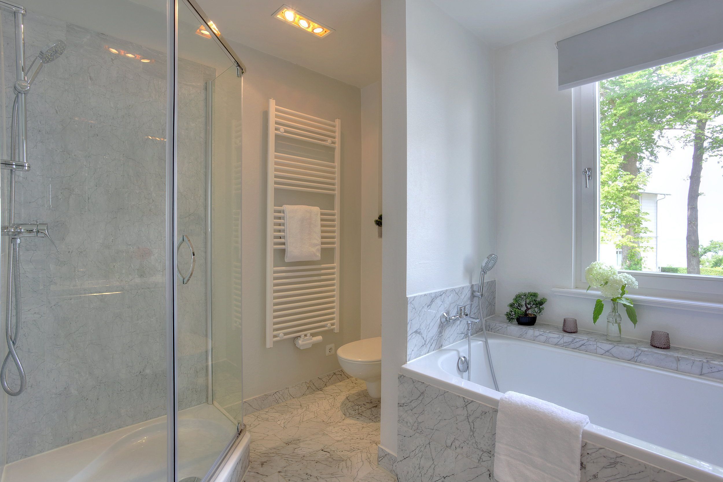 Die angenehme Helle zieht sich durch alle Räume. Dank eines Fensters auch im Badezimmer. Komfortabel gestaltet erwartet Sie dort eine Dusche, Badewanne, WC, Haartrockner, und ein Doppelwaschtisch sowie ein Handtuchheizkörper. Highlight des Appartements ist die Aussicht des Appartements, die einen tollen Blick über die Dächer von Heringsdorf bis nach Bansin gewährt. Ihnen steht während Ihres Urlaubes ein kostenfreier Parkplatz, nur ca. 300 Meter von der Villa entfernt, zur Verfügung. Direkt vor der Villa befindet sich für unsere Gäste ein Parkplatz zum Be- und Entladen.