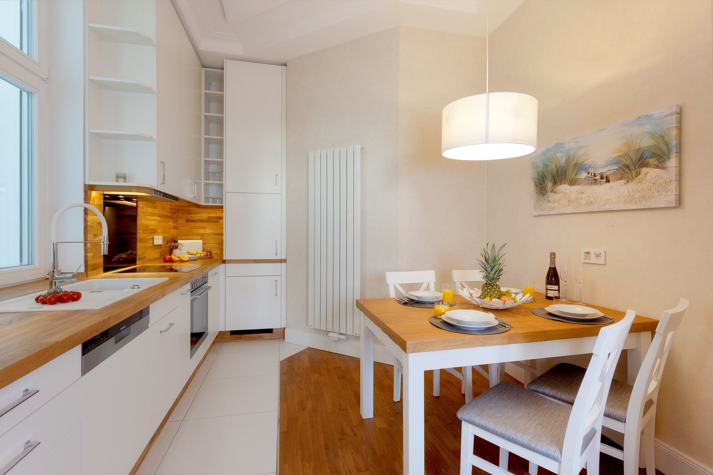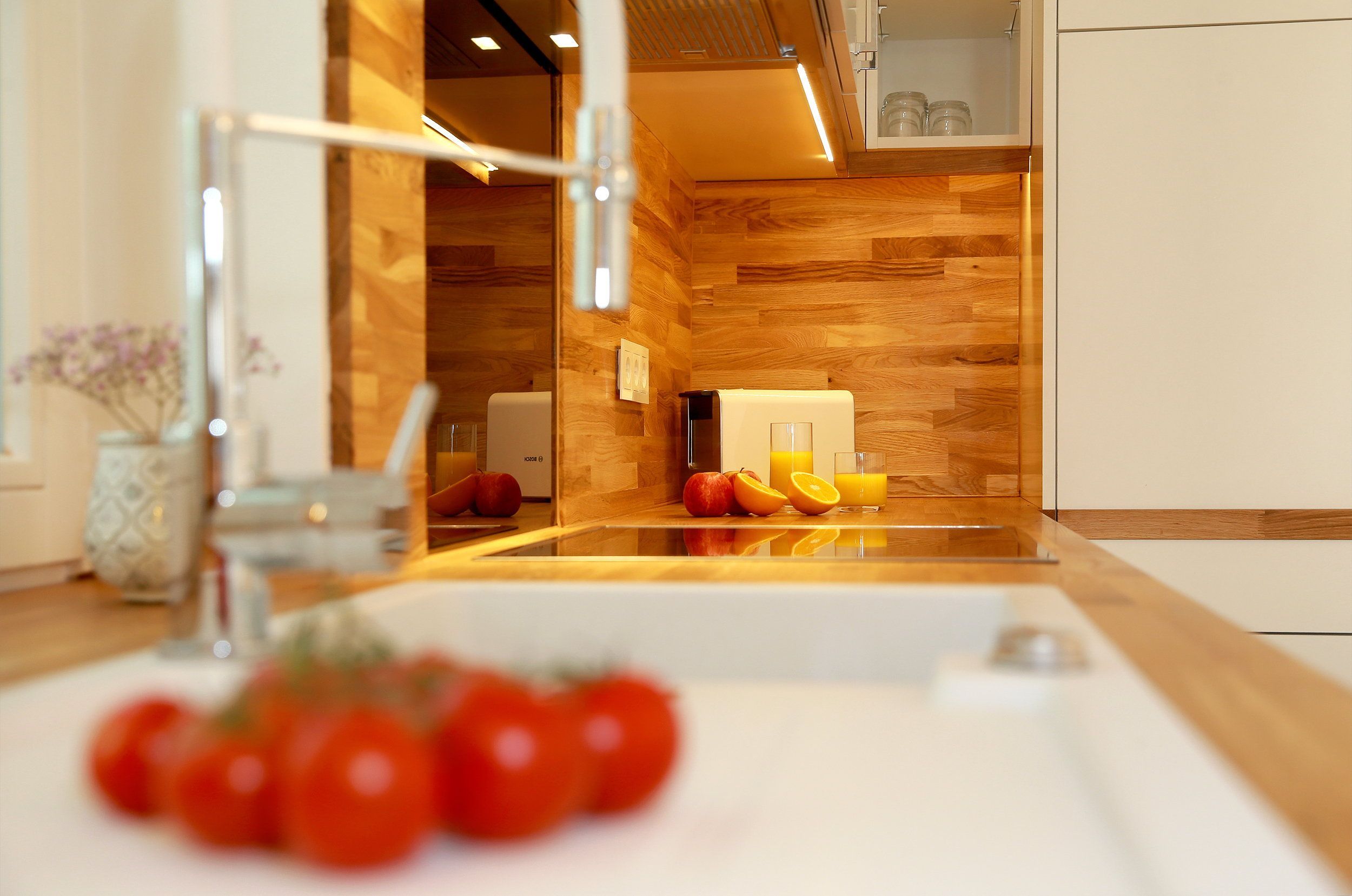 Die vollausgestattete Küche ergänzt die Annehmlichkeiten dieses neuen Appartements mit allen Raffinessen: Backofen, Mikrowelle, Kühlschrank mit Gefrierfach, Toaster, Wasserkocher, Kaffeemaschine sowie einem Essplatz für 4 Personen.