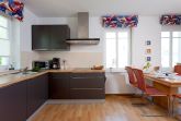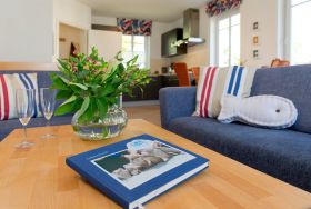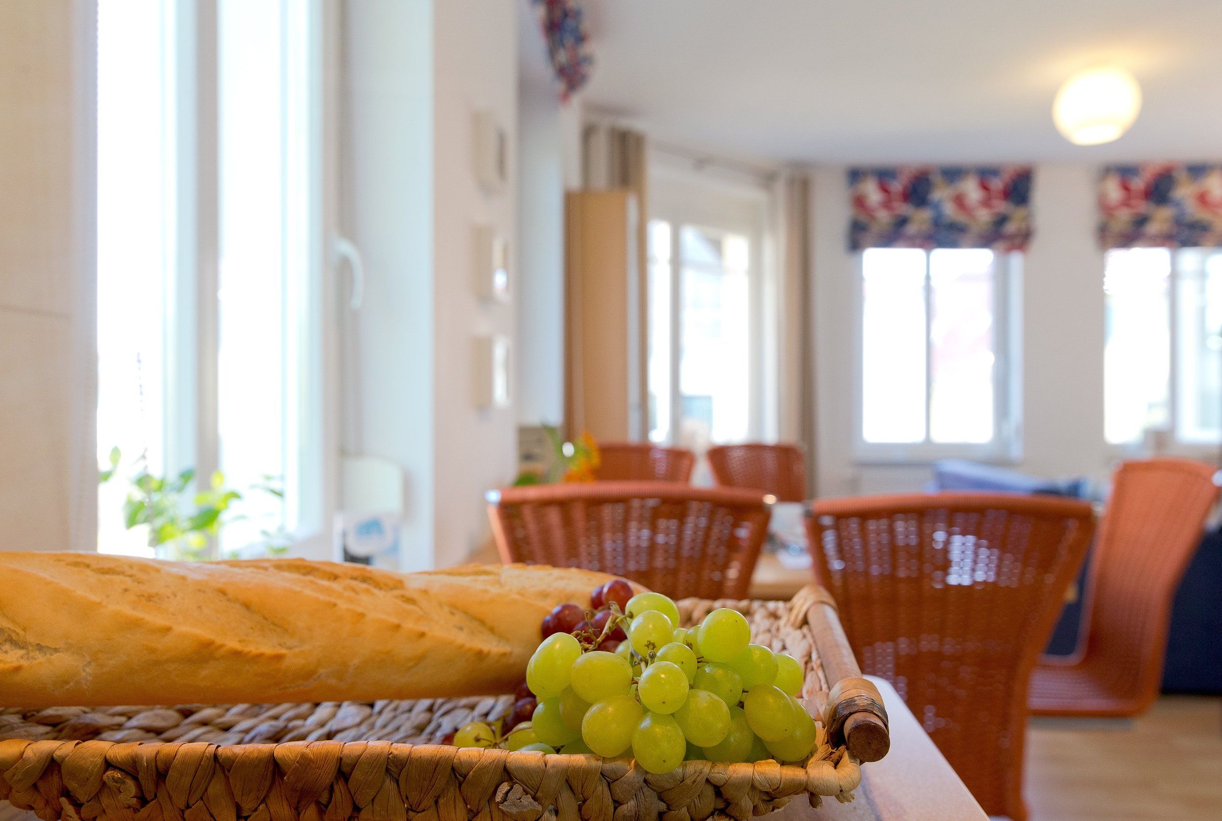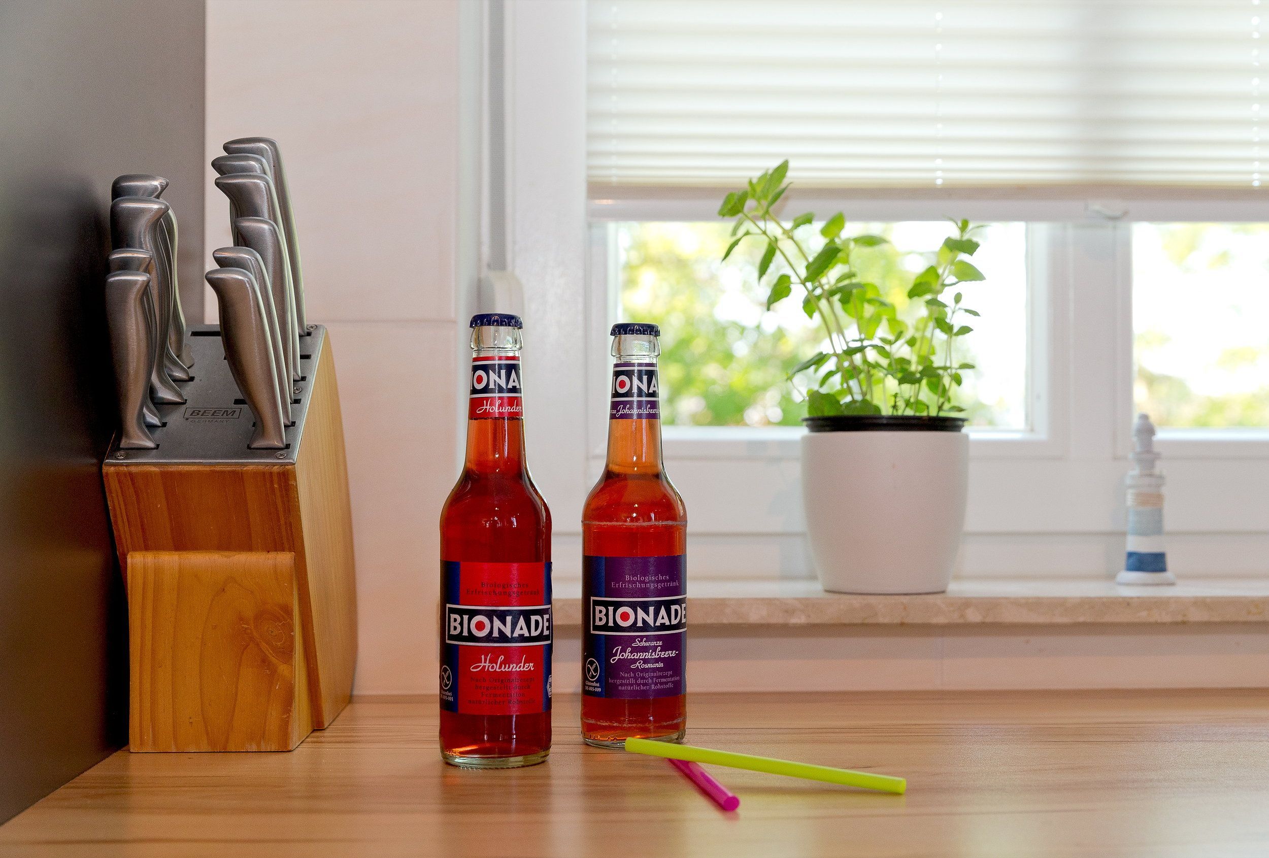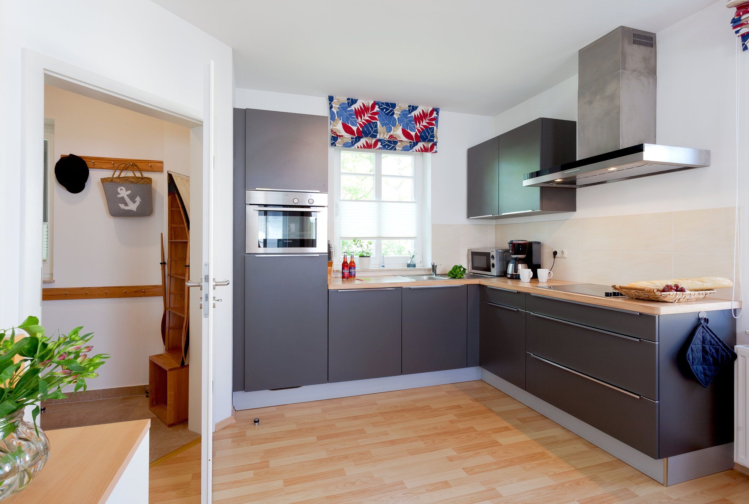 Der Wohnbereich verfügt über eine gemütliche Couch (mit Ausziehfunktion für Aufbettung) mit Leselampe, Flachbild-TV (32 Zoll), CD / DVD / Bluray 2.1 Dolby System sowie einen Esstisch mit Schwingstühlen. Vom Wohnbereich gelangen Sie auf Ihren Balkon mit Zugang zum Garten. Die im Wohnbereich integrierte komplett ausgestattete Einbauküche verfügt zudem über Kühlschrank, Mikrowelle, Cerankochfeld (4 Platten), Backofen, Spülmaschine, Wasserkocher, Toaster, Kaffeemaschine (4er Filter), Messerblock.
