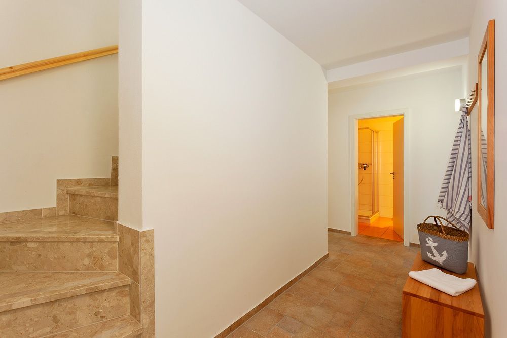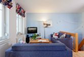 Über eine Treppe gelangen Sie vom Erdgeschoss in den Souterrain-Bereich. Dort befinden sich die beiden Schlafzimmer. Das eine Schlafzimmer ist mit einem hochwertigen Boxspringbett (160 x 200 cm) und Leselampe ausgestattet.