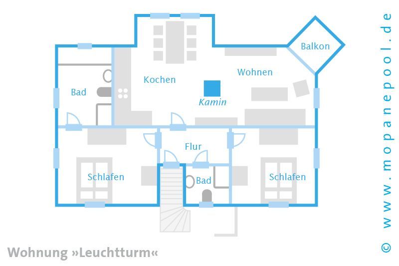Der Wohnbereich verfügt über eine gemütliche Couch (mit Ausziehfunktion für Aufbettung) mit Leselampe, Flachbild-TV (32 Zoll), CD / DVD / Bluray 2.1 Dolby System sowie einem großen Esstisch mit Schwingstühlen. Ein Echtholz-Kamin rundet den Komfort hervorragend ab. Vom Wohnbereich gelangen Sie auf Ihren Balkon. Die im Wohnbereich integrierte komplett ausgestattete Einbauküche verfügt zudem über Kühlschrank, Mikrowelle, Ceran-Kochfeld (4 Platten), Backofen, Spülmaschine, Wasserkocher, Toaster, Kaffeemaschine (4er Filter), Messerblock. Zwei Schlafzimmer mit je einem hochwertigen Boxspringbett (180 x 200 cm) bieten unseren Gästen einen entspannten Schlafkomfort im Urlaub.