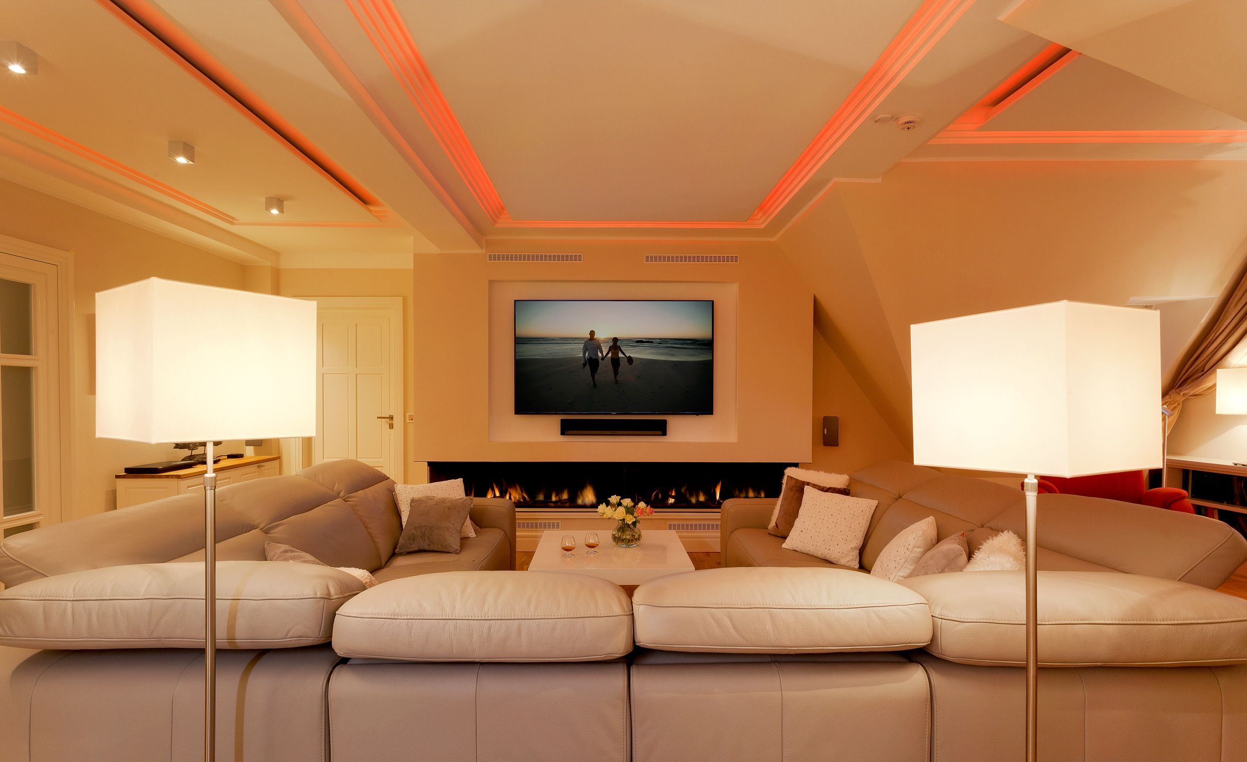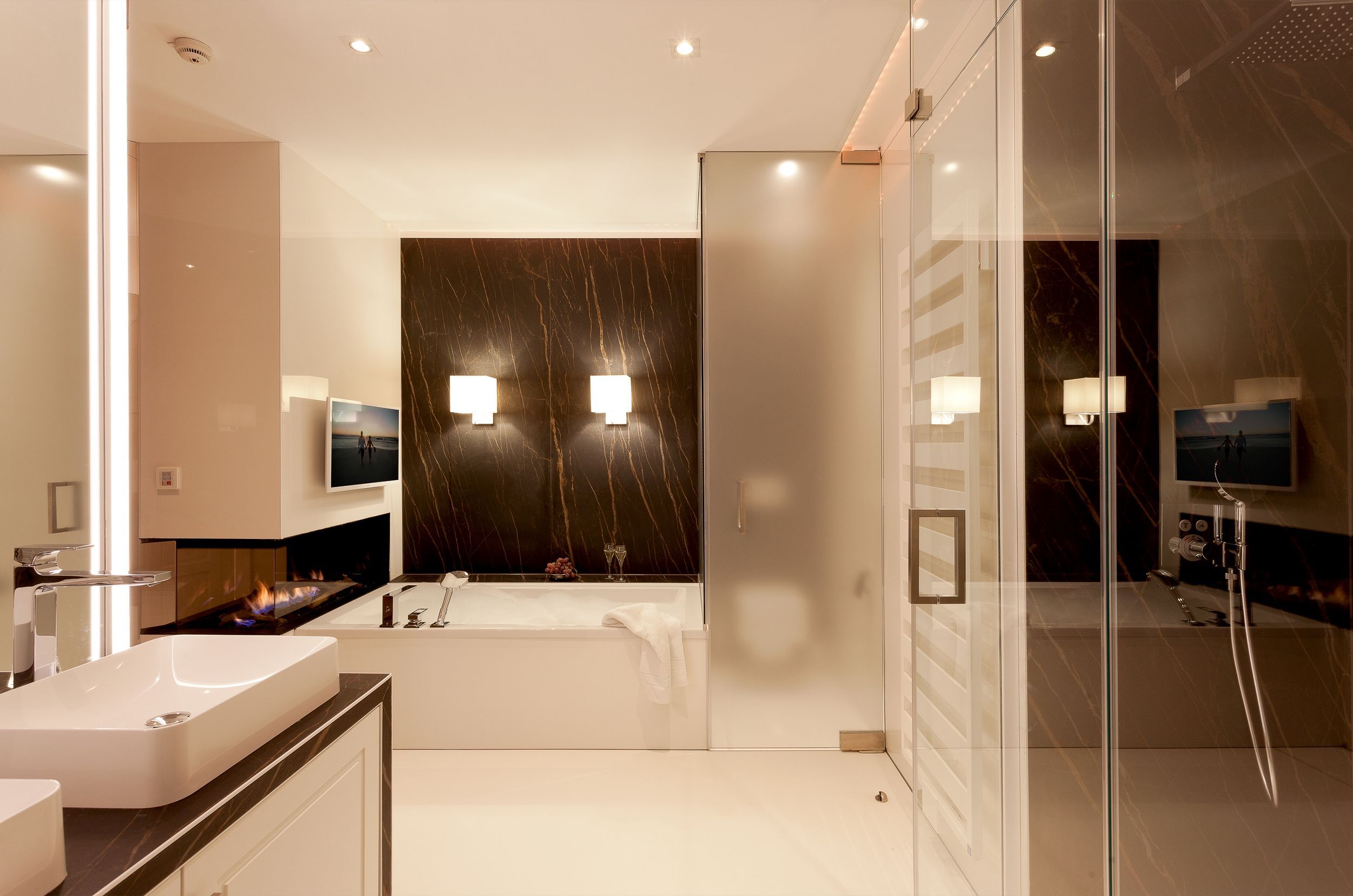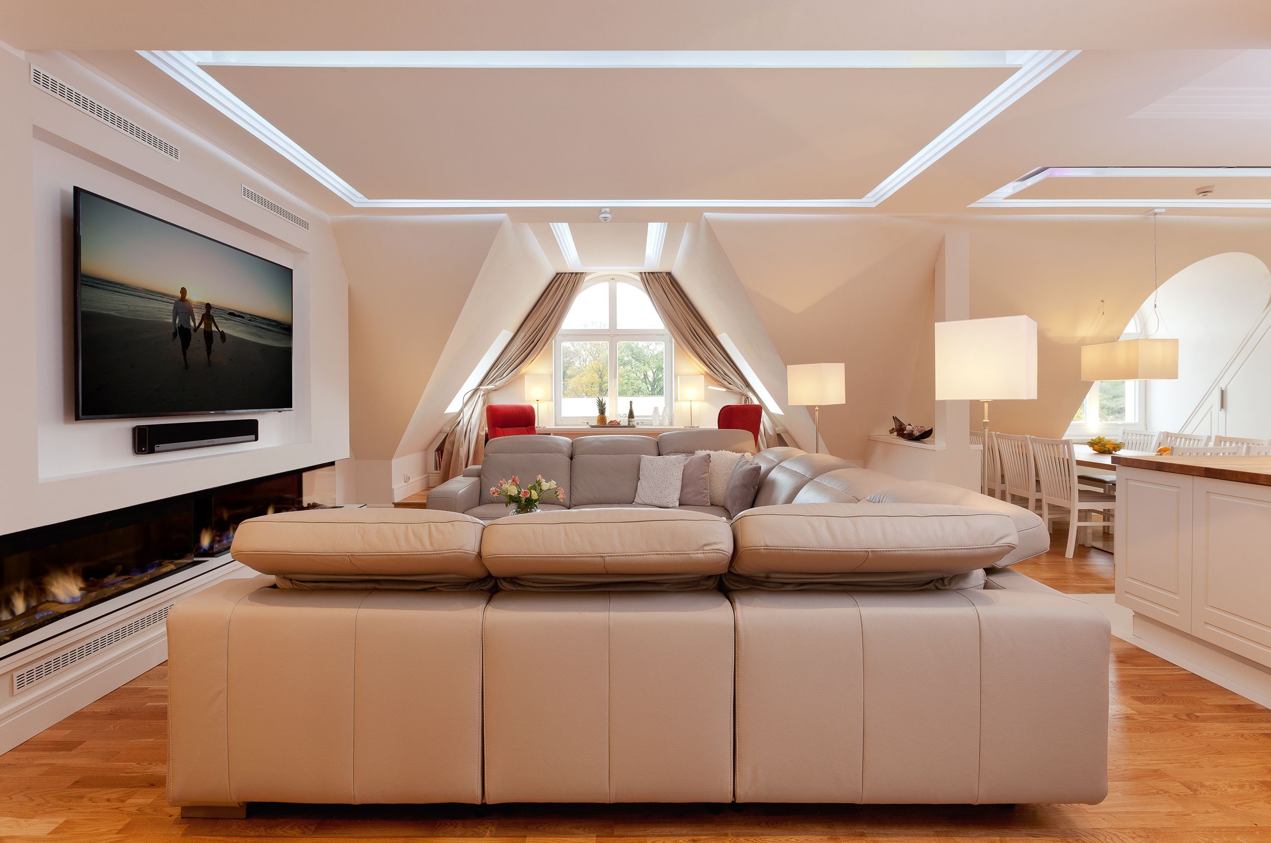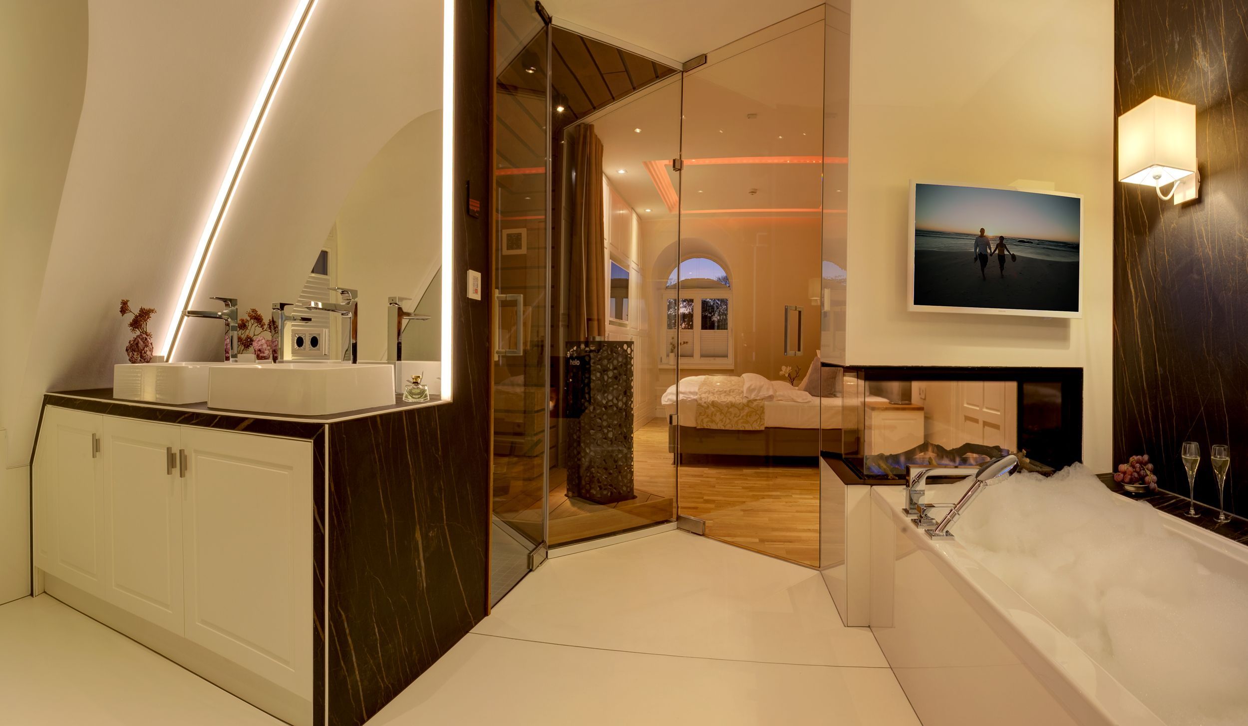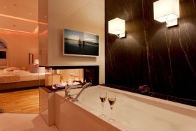 Die Suite verfügt über raffinierte Stuckelemente soweit das Auge reicht sowie über ein einzigartiges Lichtspiel. So lässt sich per Knopfdruck die Lichtszene Ihrer Wahl einstellen. Der Wohnbereich ist mit einem XXL-Relaxsofa, einem großen Flat-TV sowie einem gigantischen Gaskamin ausgestattet. Die integrierte Küchenzeile lässt mit Kaffeevollautomat, amerikanischem Kühlschrank (inkl. Eiswürfelspender), Induktionskochfeld mit eingelassener Abluft, Backofen, Mikrowelle, Geschirrspüler und Esstisch für 8 Personen keine Wünsche offen.