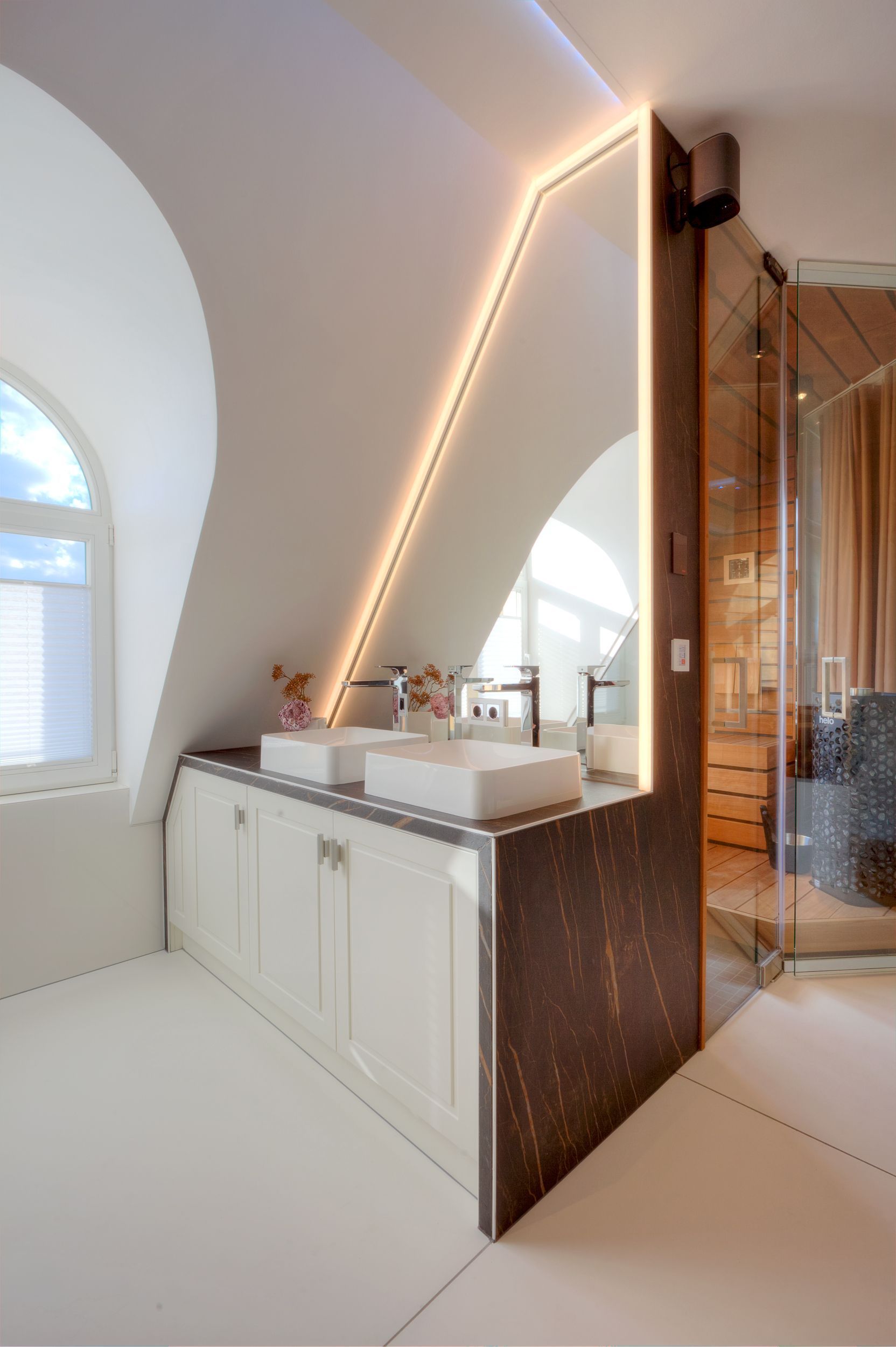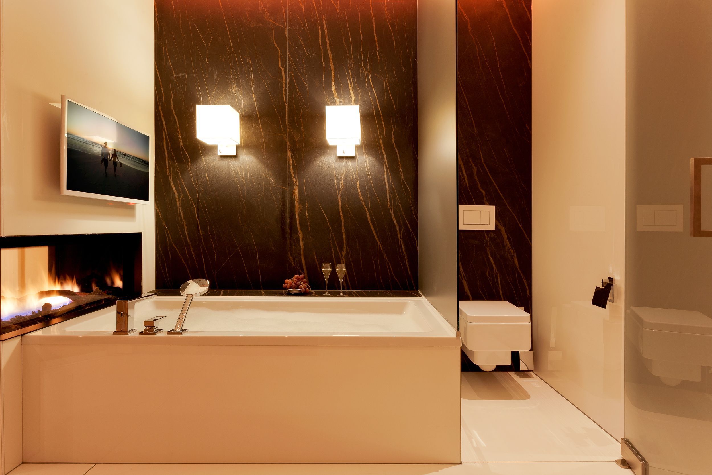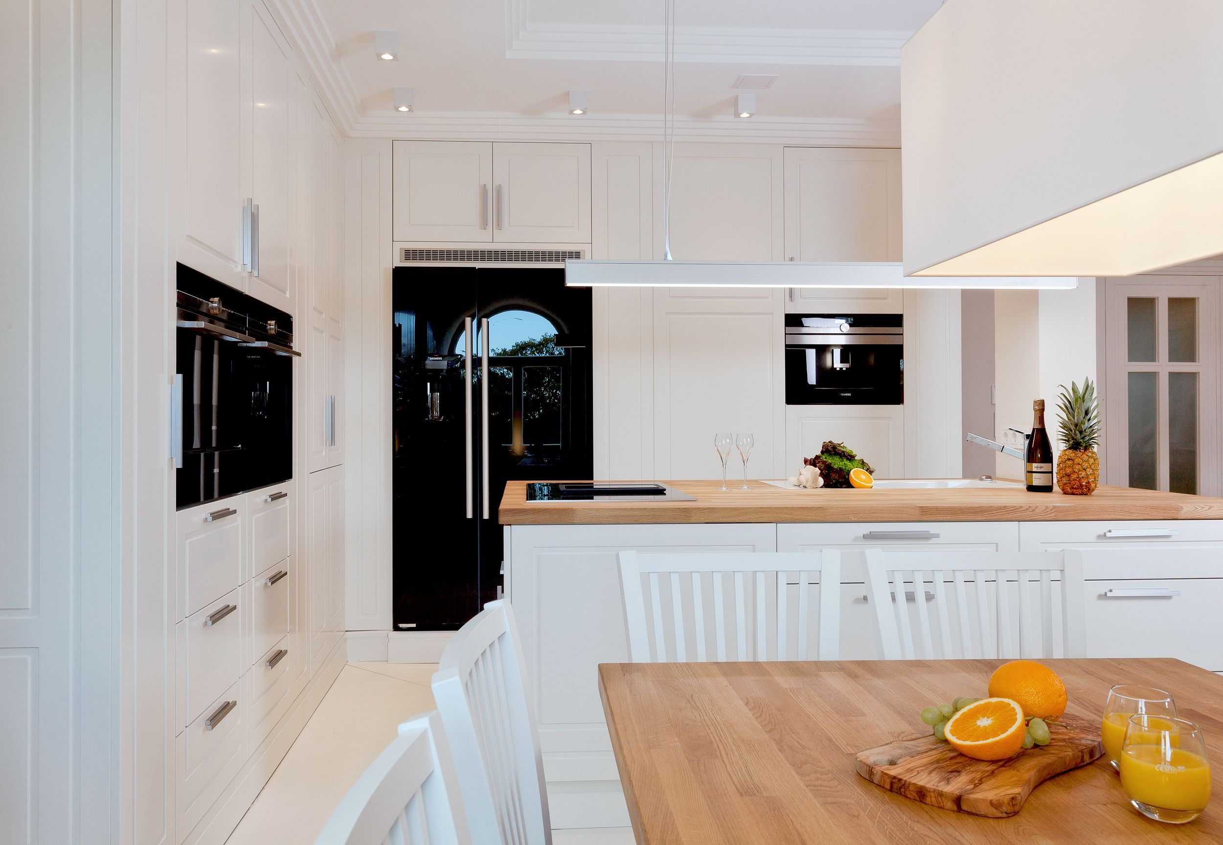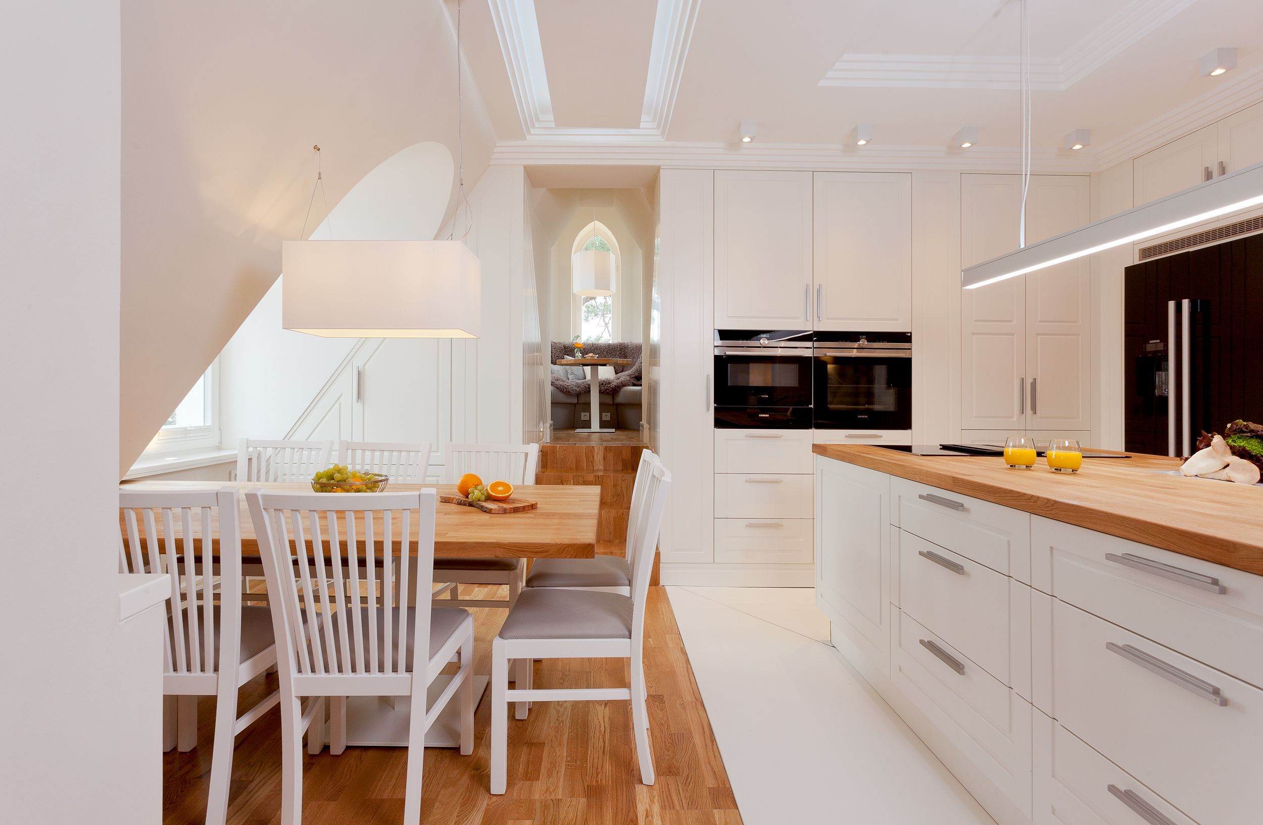 Die Suite verfügt über raffinierte Stuckelemente soweit das Auge reicht sowie über ein einzigartiges Lichtspiel. So lässt sich per Knopfdruck die Lichtszene Ihrer Wahl einstellen. Der Wohnbereich ist mit einem XXL-Relaxsofa, einem großen Flat-TV sowie einem gigantischen Gaskamin ausgestattet. Die integrierte Küchenzeile lässt mit Kaffeevollautomat, amerikanischem Kühlschrank (inkl. Eiswürfelspender), Induktionskochfeld mit eingelassener Abluft, Backofen, Mikrowelle, Geschirrspüler und Esstisch für 8 Personen keine Wünsche offen.