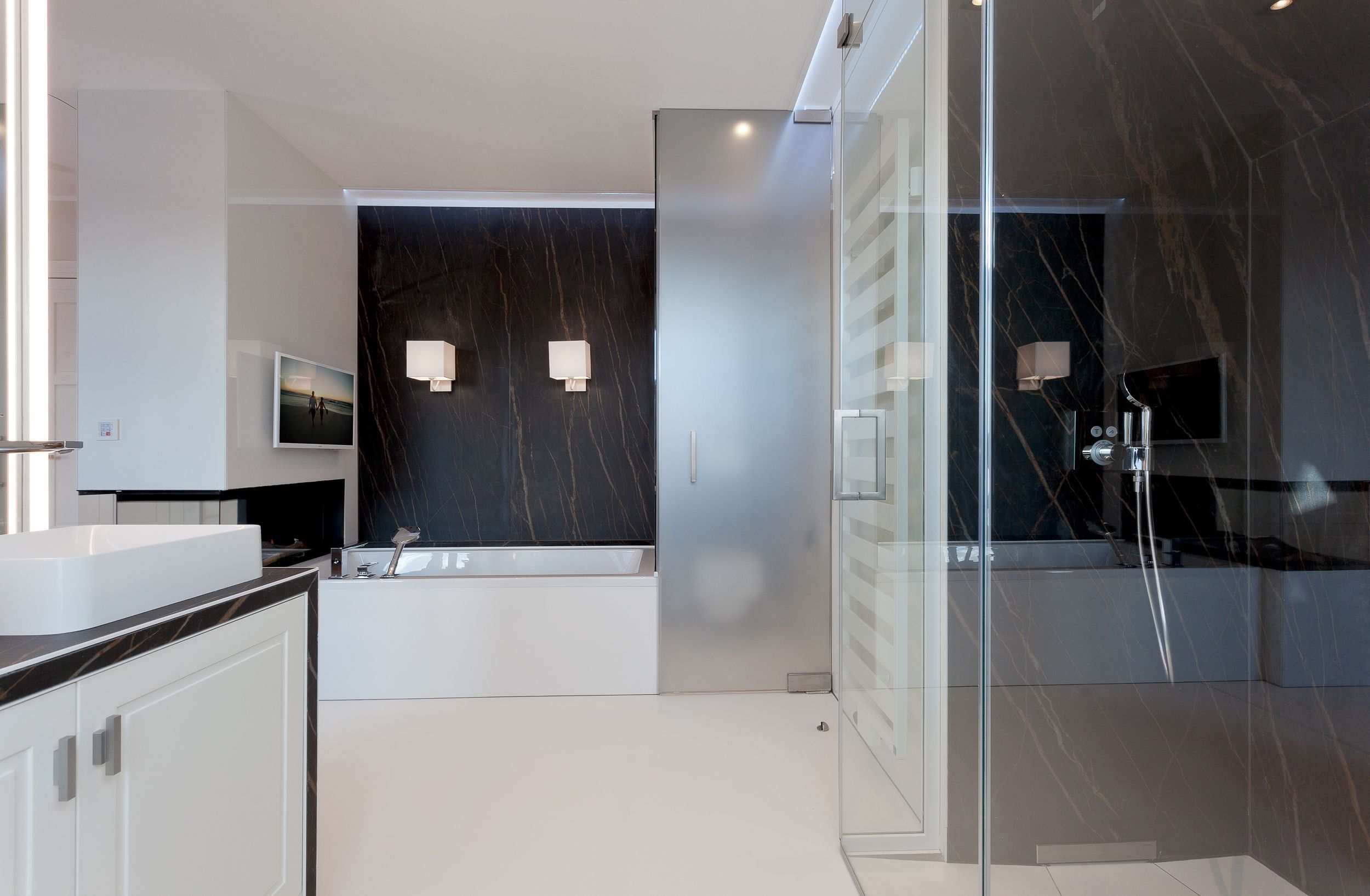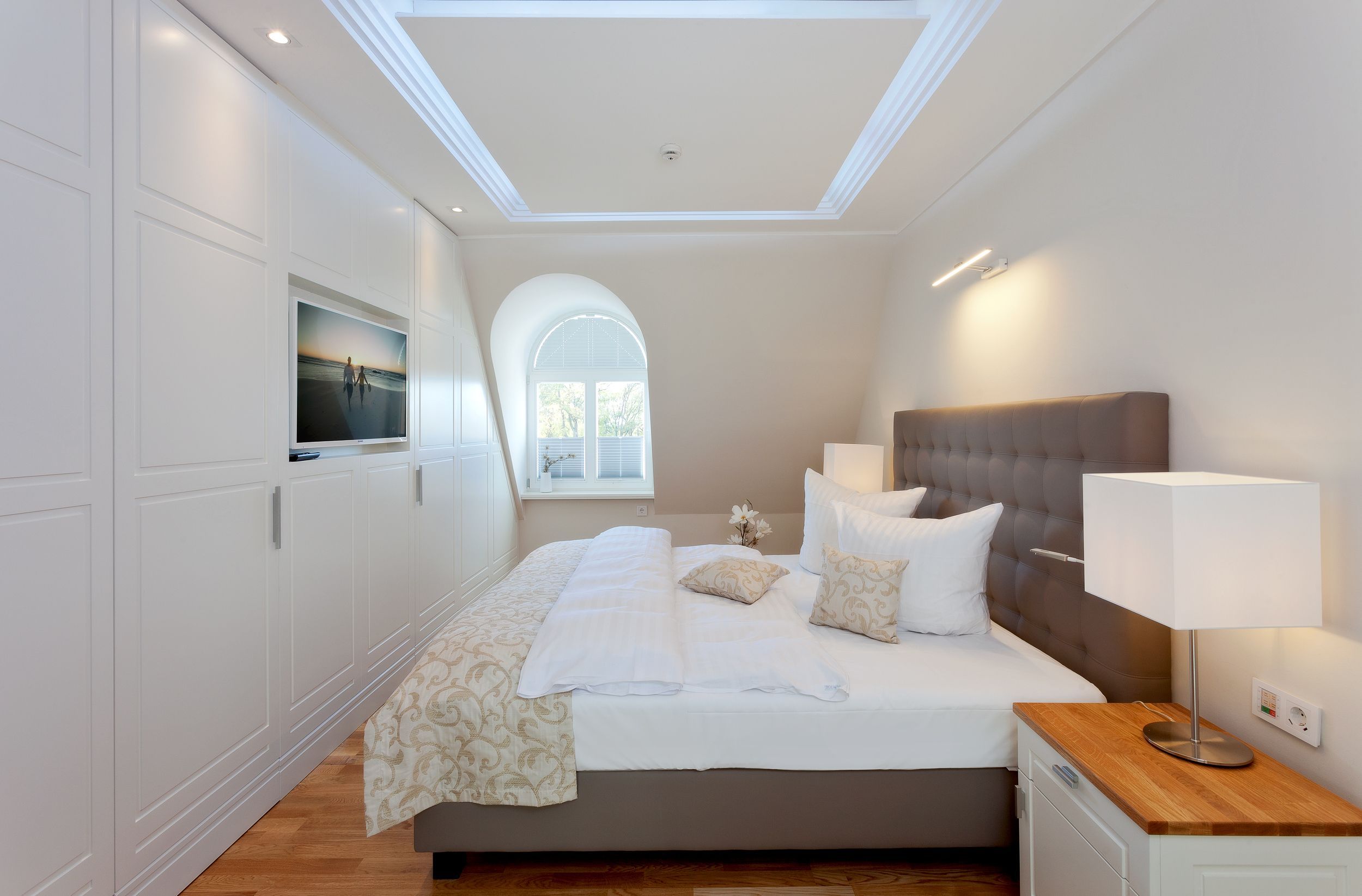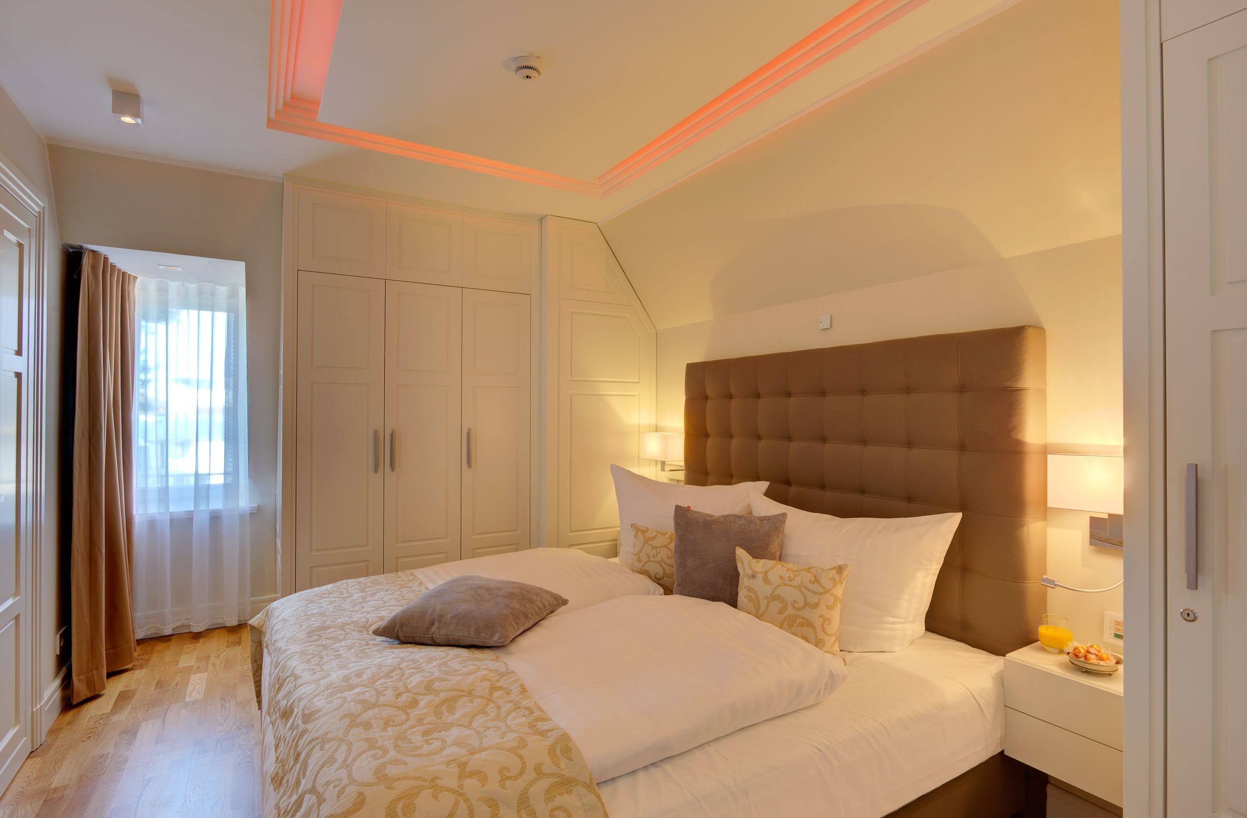 Das erste von vier Schlafzimmern mit Master-Bathroom ist ein Meisterwerk unseres Stylistenteams: Es wartet nicht nur mit einem der vier hochwertigen Boxspringbetten (200x200 cm) auf, sondern überzeugt ebenso mit einem Gaskamin und einer finnischen Sauna. In der Badewanne genießen Sie entweder das Flammenspiel des Gaskamins oder die TV Serie Ihrer Wahl. Komplettiert wird das Badezimmer mit einem Doppelwaschtisch, einer ebenerdigen Dusche sowie einem abgetrennten WC. Die Aufbettung für ein Kind ist im Schlafzimmer im Babyreisebett (max. 3 Jahre) möglich.