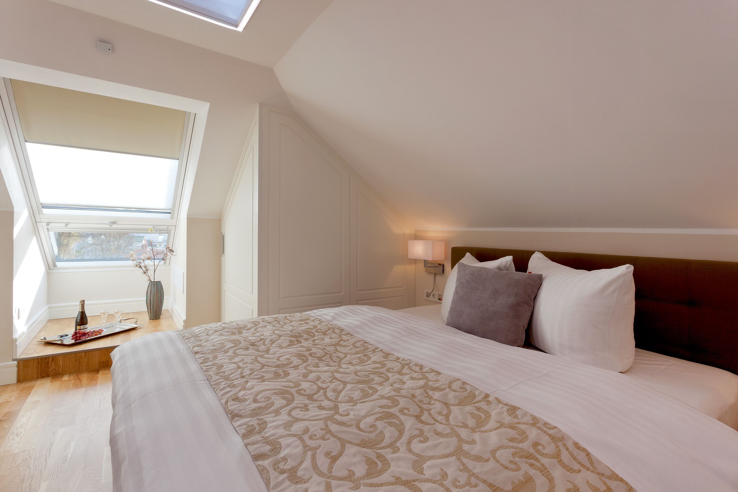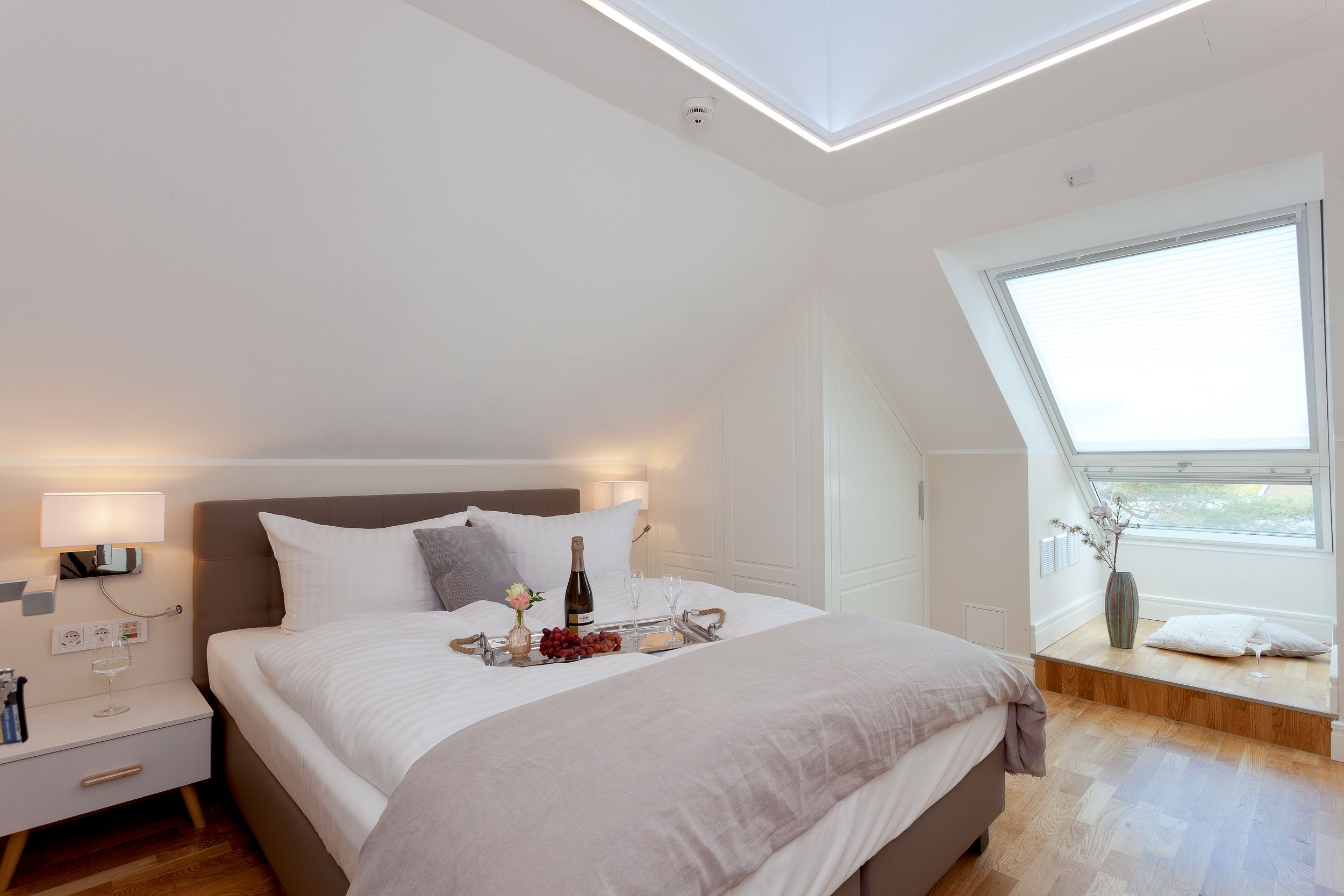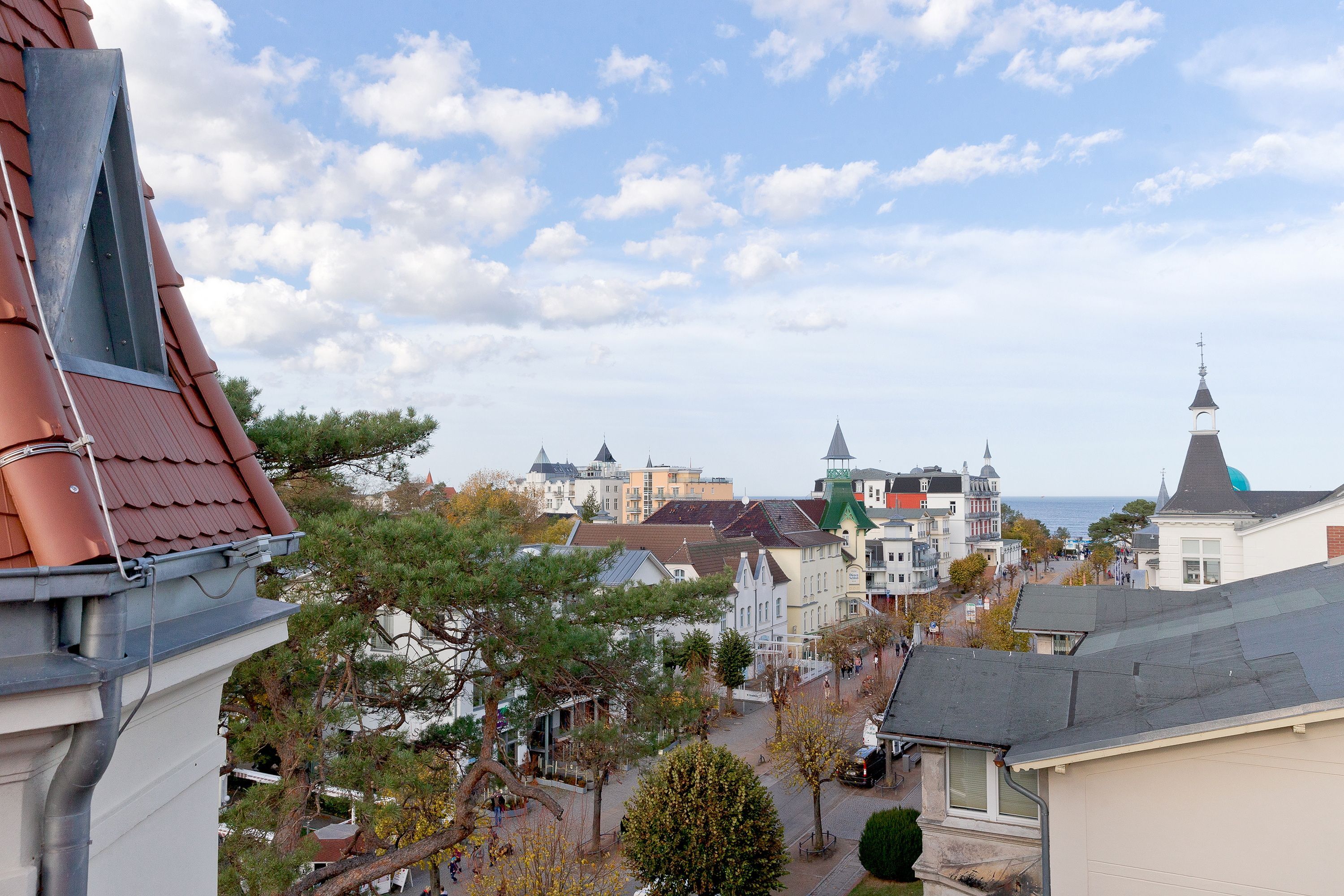 Nun haben Sie den höchsten Punkt der Villa erreicht. Genießen Sie den atemberaubenden Fernblick über Zinnowitzs Dächer bis hin zum Meer. Lassen Sie hier den Abend bei einem gemütlichen Glas Wein ausklingen und fühlen sich wie Gott auf Usedom. Für die wohlige Wärme zu jeder Jahreszeit sorgen Fußbodenheizung und Klimaanlage.