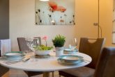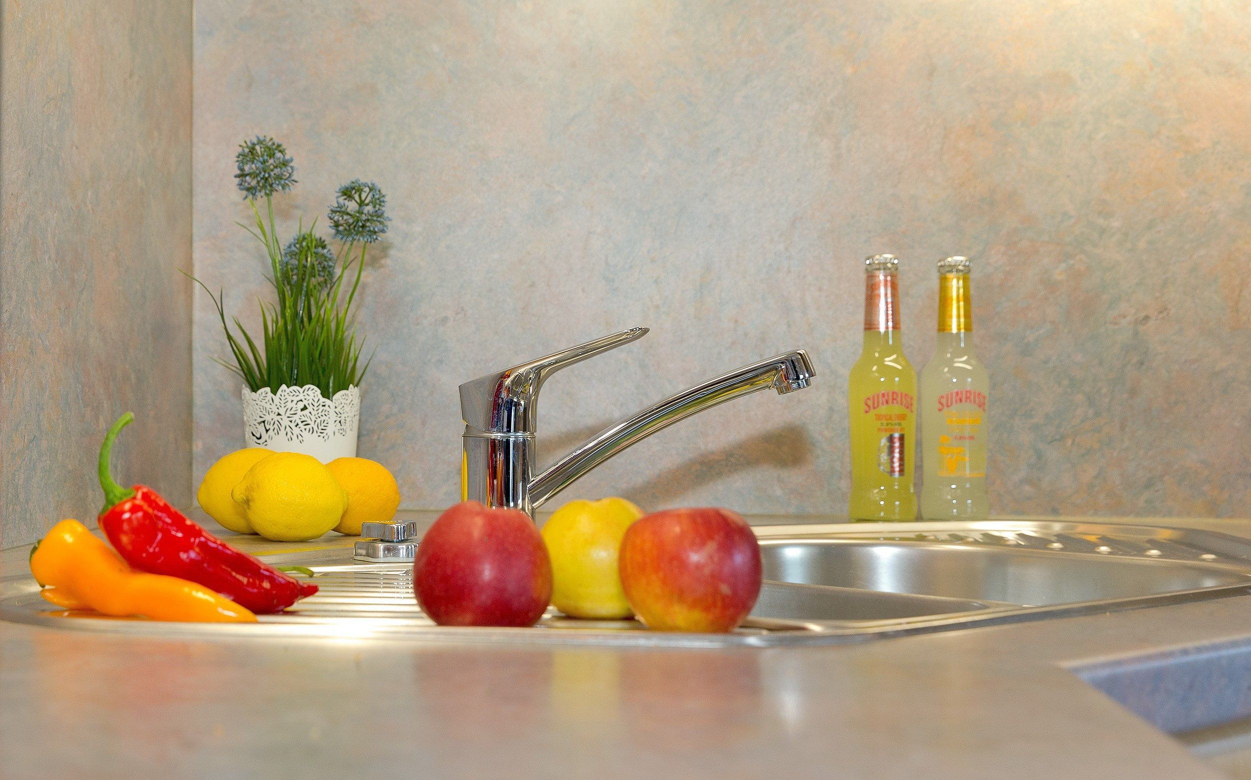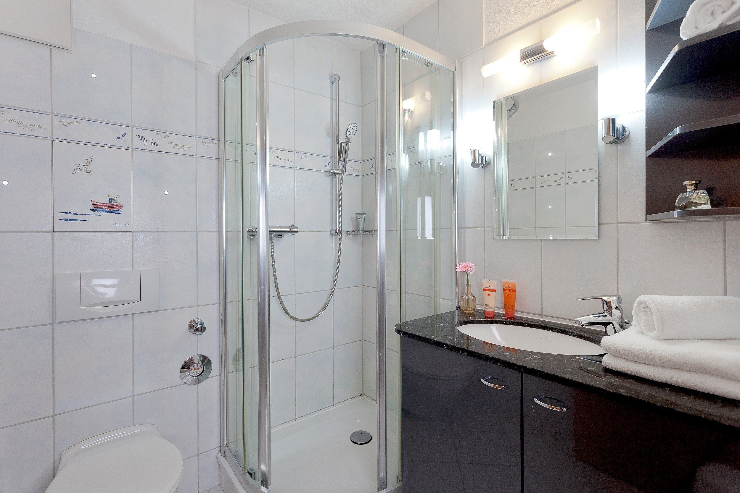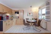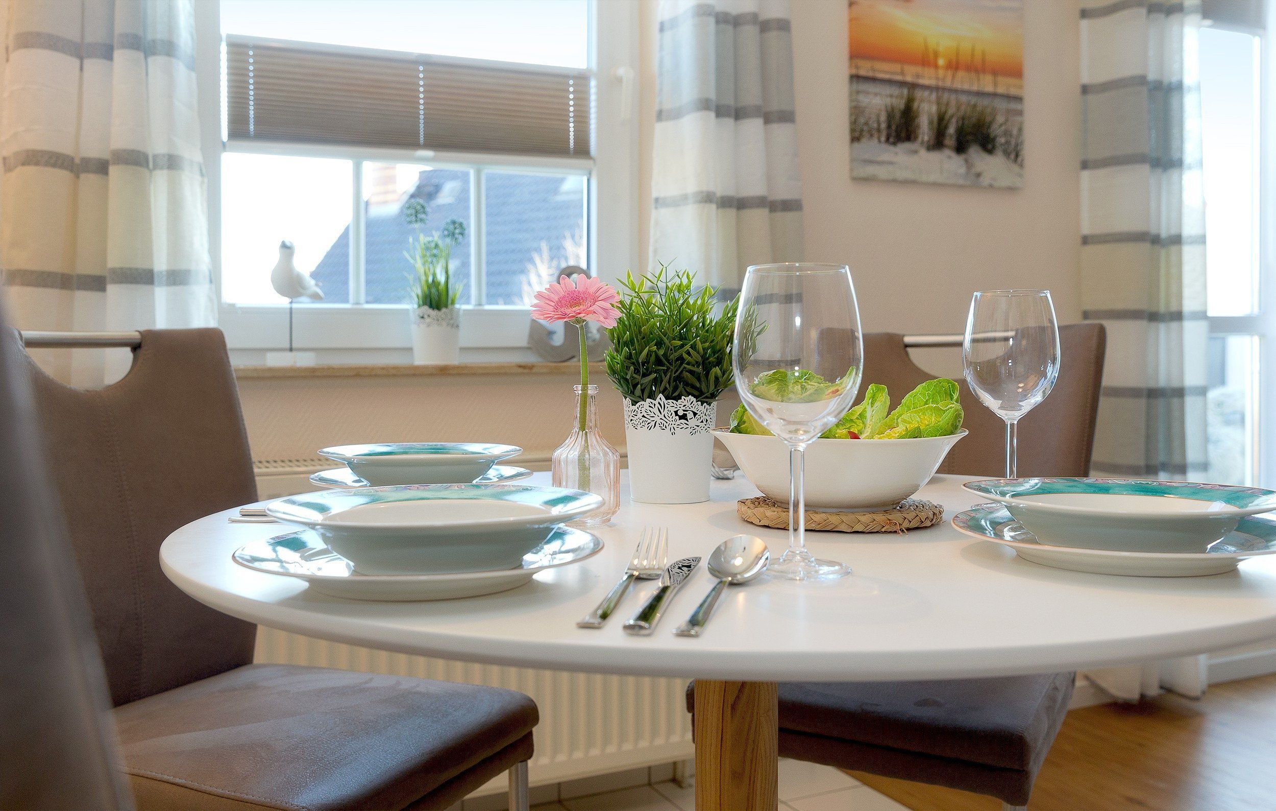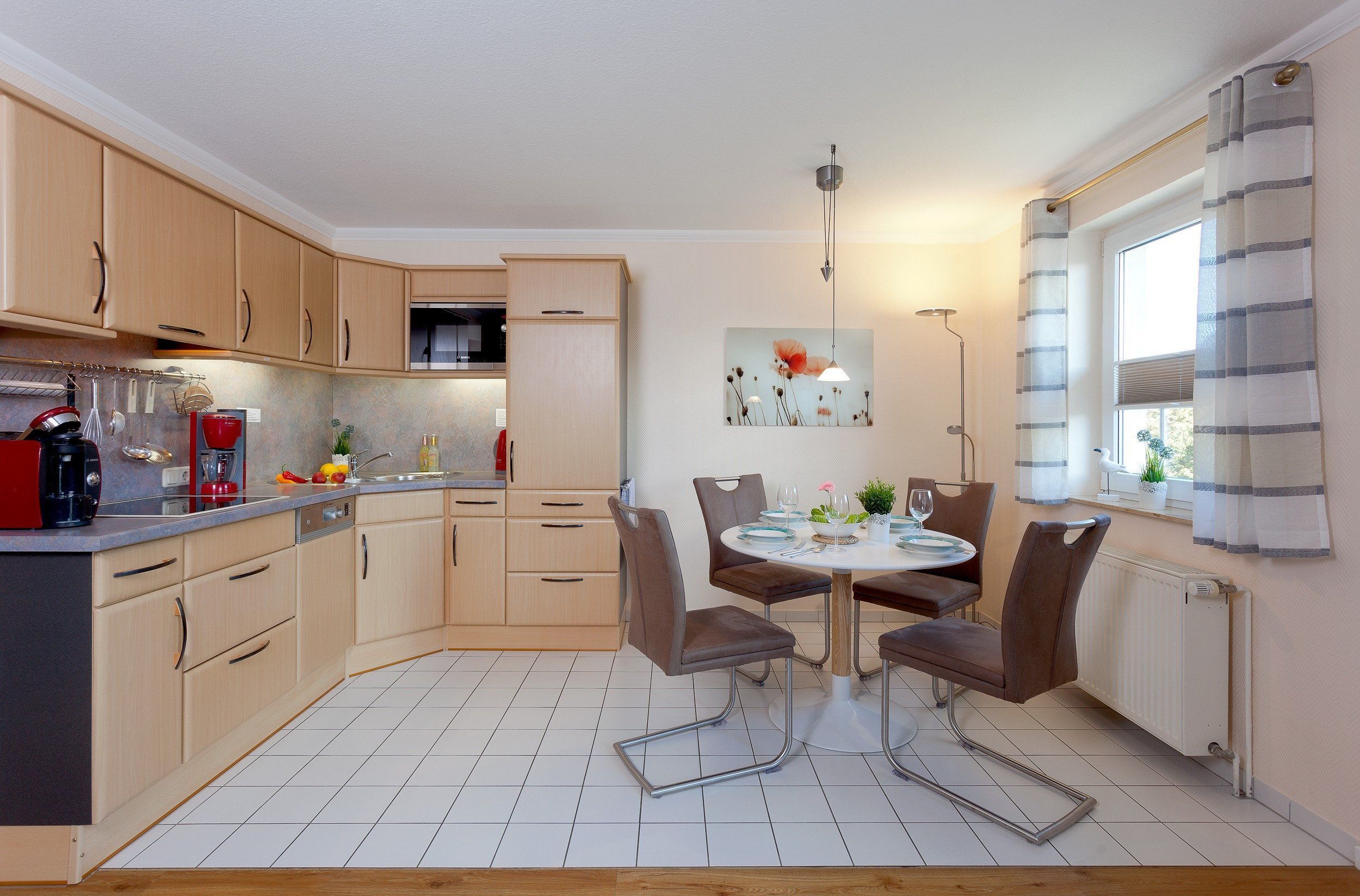Im ersten Obergeschoss des Hauses begrüßen wir Sie, Dank der warmen Farbgebung, in wohliger Atmosphäre auf 45 Quadratmetern zur schönsten Zeit des Jahres, Ihrer Urlaubszeit. Der gemütlich gestaltete Wohn- und Essbereich lädt dank bequemer Couch und zwei Sesseln sowie Esstisch mit Sitzgelegenheit für bis zu vier Personen zum gemütlichen Beisammensein ein. Die gut ausgestattete Küche (Geschirrspüler, Kühlschrank m. Gefrierfach, Wasserkocher, Toaster, Kaffeemaschine, Tassimo-Automat, Mikrowelle, Kochfeld) lässt das Kochherz höher schlagen. So können Sie sich auch im Urlaub jederzeit eine Ihrer Lieblingsspeisen im Nu zubereiten. Lassen Sie den Abend entspannt im Anschluss vor dem Flat TV ausklingen.