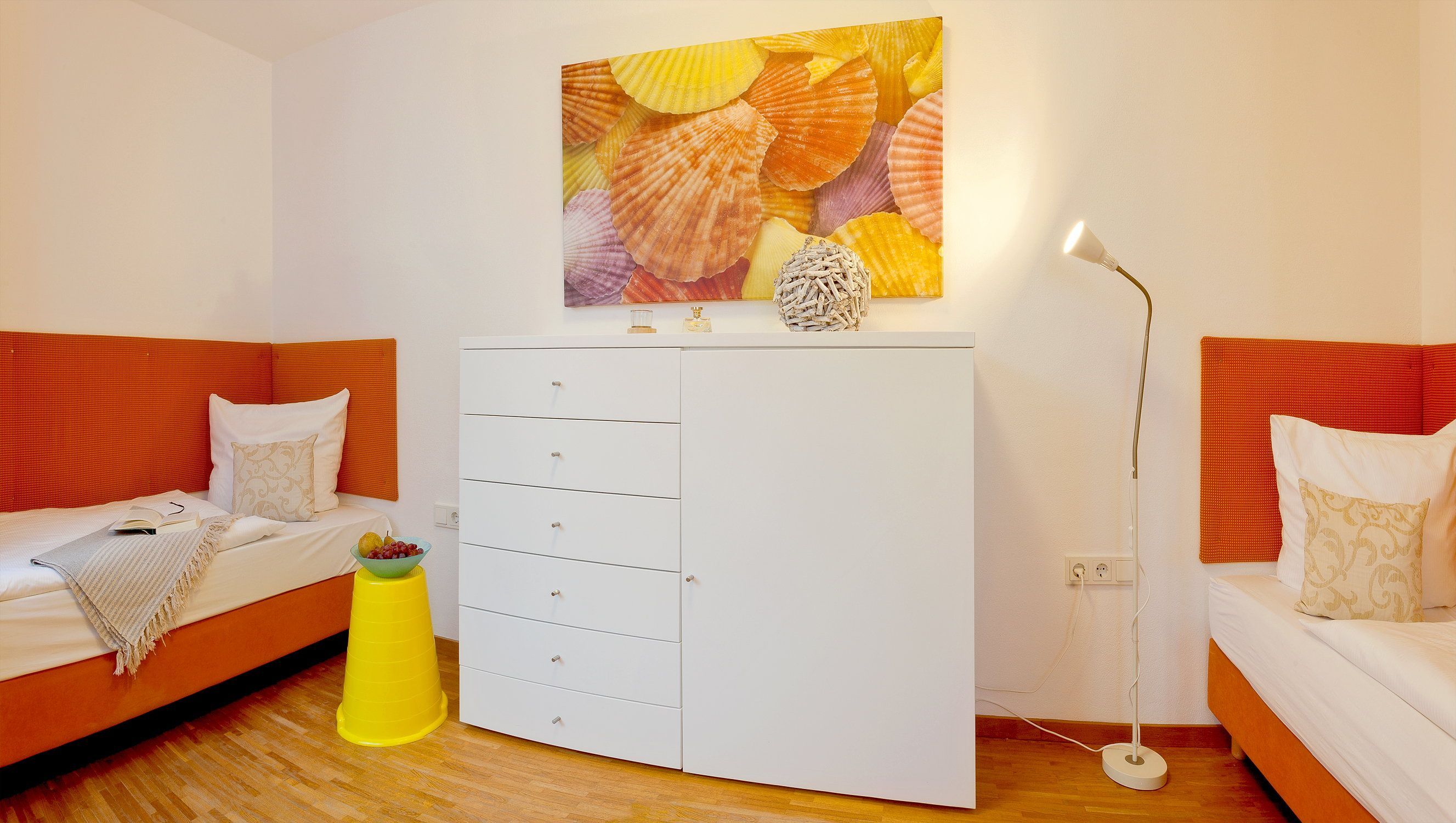 Über eine Treppe gelangen Sie in die obere Etage der Wohnung. Von der Galerie haben Sie Zugang zu den beiden Schlafzimmern, dem Badezimmer und dem Balkon. Das erste Schlafzimmer ist freundlich eingerichetet und mit einem bequemen Doppelbett (180 x 200cm / zwei getrennte Matratzen) und verdunkelnden Gardinen ausgestattet. Für zwei weitere Urlaubsgäste stehen im zweiten Schlafzimmer zwei Einzelbetten (je 90x200cm) für eine erholsame Nachtruhe und einen guten Start in den neuen Urlaubstag bereit.
