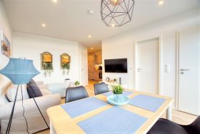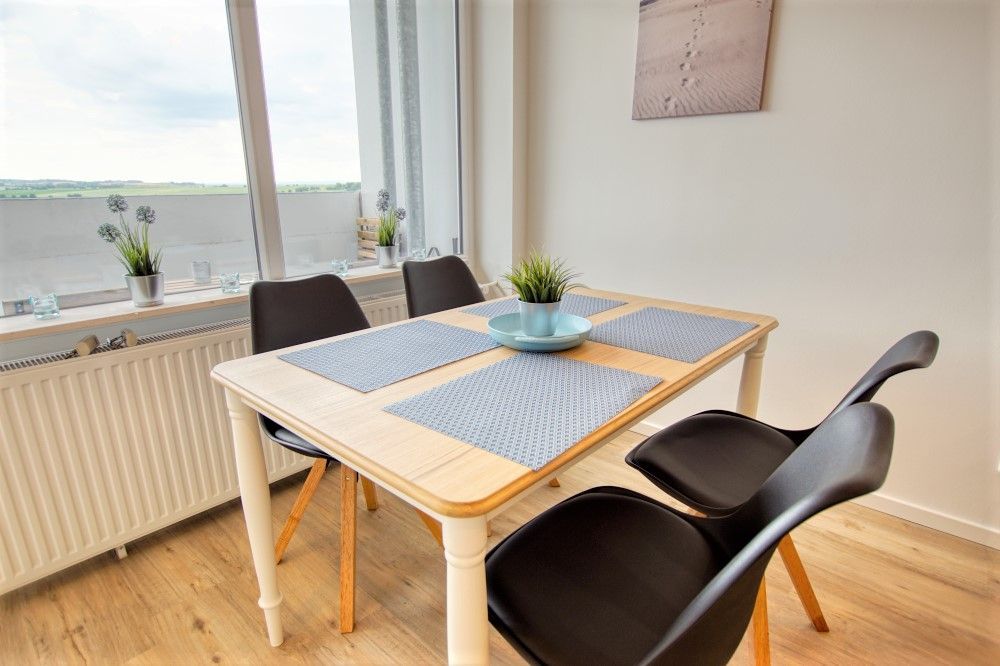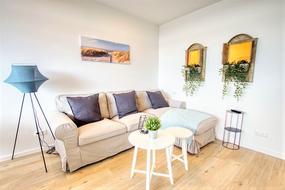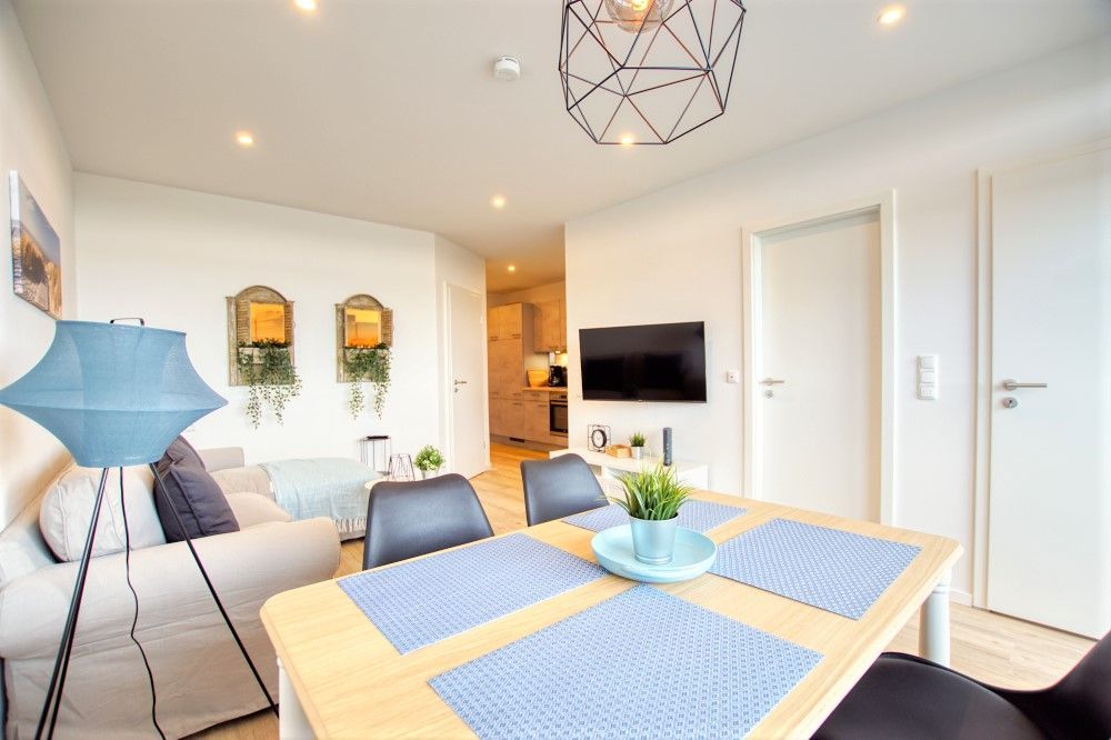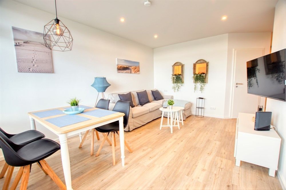 Das Hauptaugenmerk Ihrer Ferienwohnung ist das Wohnzimmer, denn in diesem können Sie so richtig Entspannen! Ein schönes Sofa mit viel Platz lädt zu gemeinsamen Abenden ein, der Essbereich ist im Beachhouse-Stil gestaltet und mit 4 Sitzplätzen bestückt, sodass Sie wunderbar gemeinsam essen können.