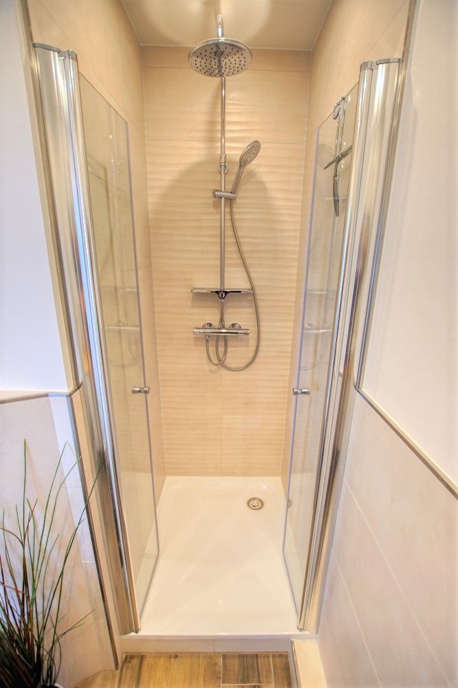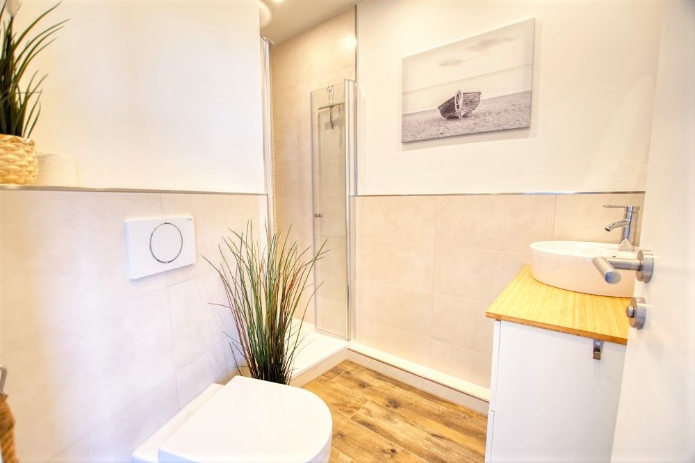 Auf der anderen Seite befindet sich Ihr Bad mit Duschkabine.