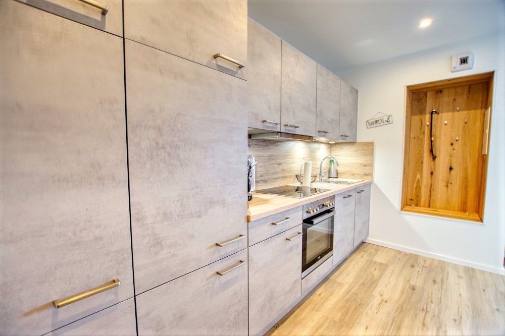 Die geräumige Einbauküche ist mit einem 4-Plattenceranfeld, Kühlschrank mit Gefrierfach sowie Kaffeemaschine und Wasserkocher sowie Geschirrspüler, Backofen und Geschirr für einen Urlaubsaufenthalt ausgestattet.