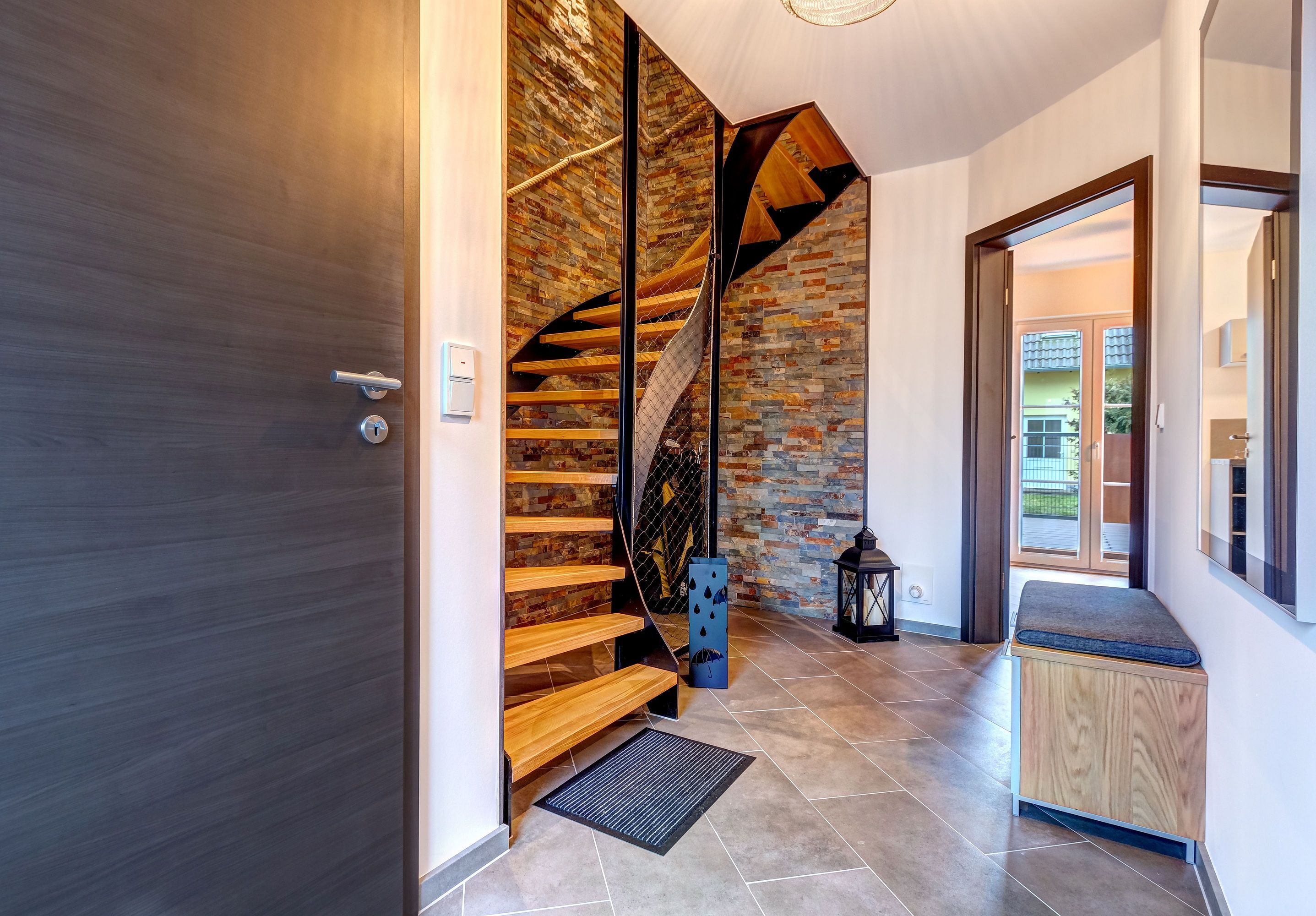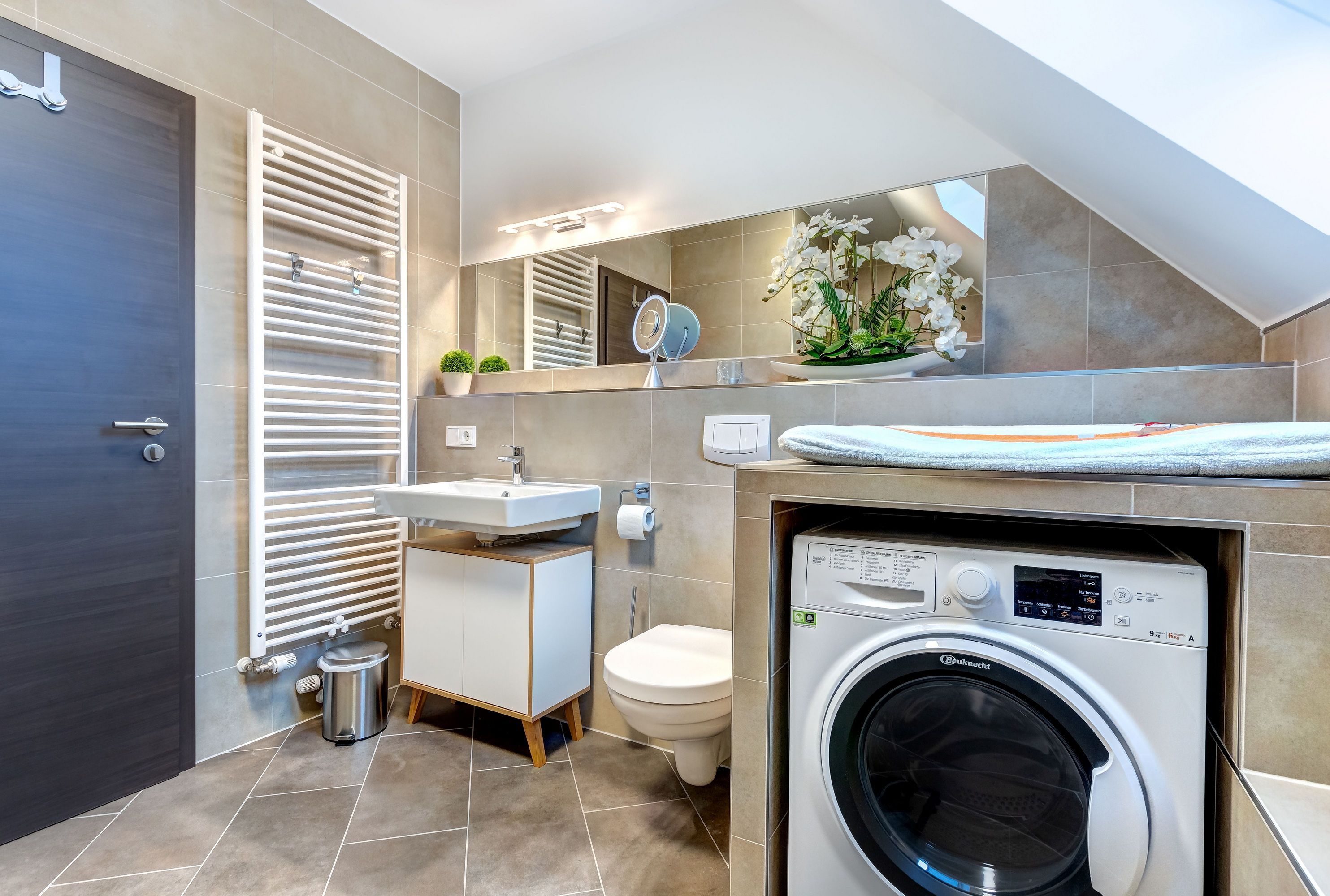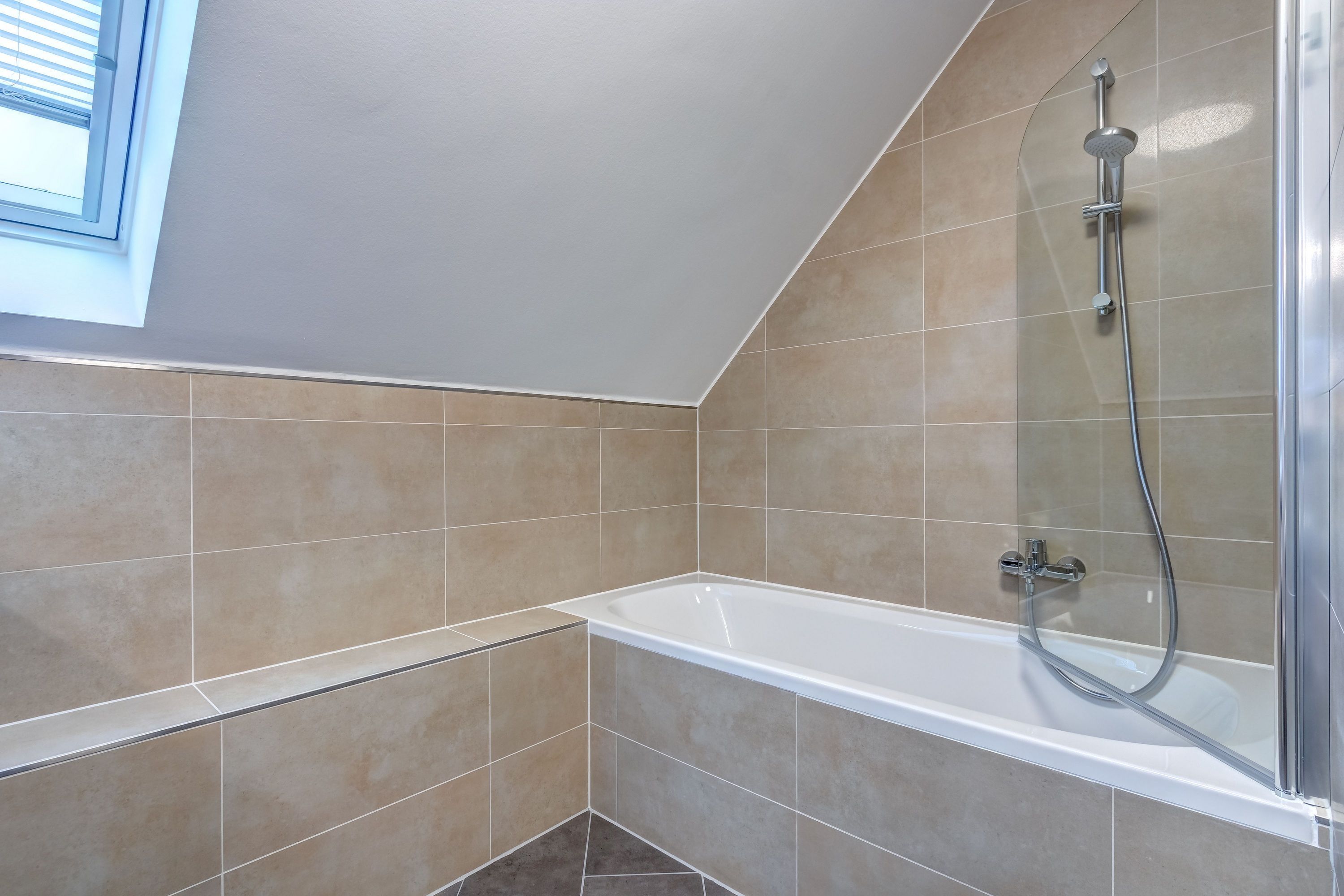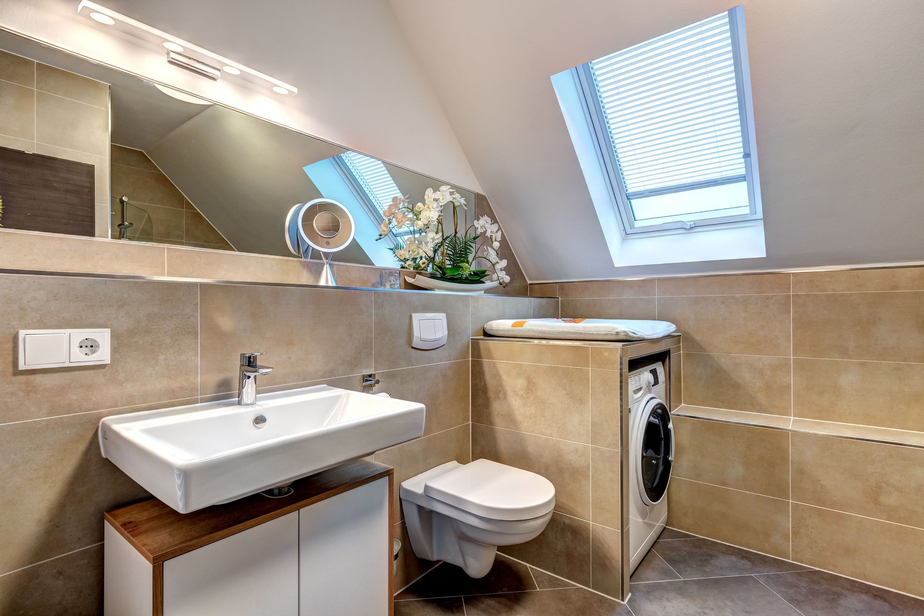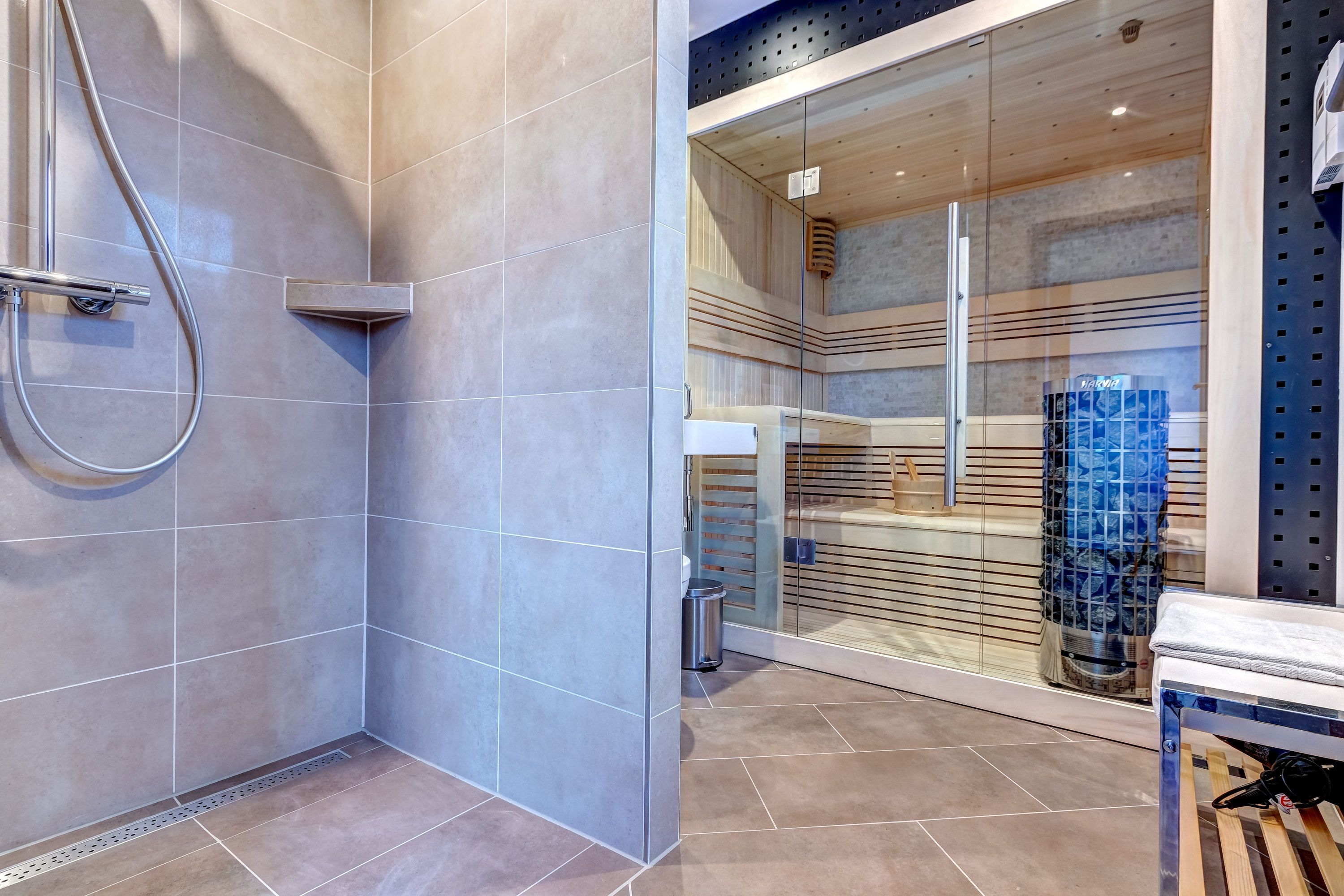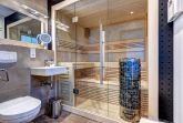 Im Obergeschoss befindet sich eines der beiden Badezimmer. Dieses ist mit einem Waschtisch, Spiegel, WC, Badewanne mit Duschmöglichkeit, Wickelauflage und einem Kombigerät Waschtrockner ausgestattet. Das Badezimmer im Erdgeschoss verfügt über einen Waschtisch, Spiegel, WC, einer bodenebenen Dusche, Erlebnis- Sauna mit Glasfront und LED-Beleuchtung.