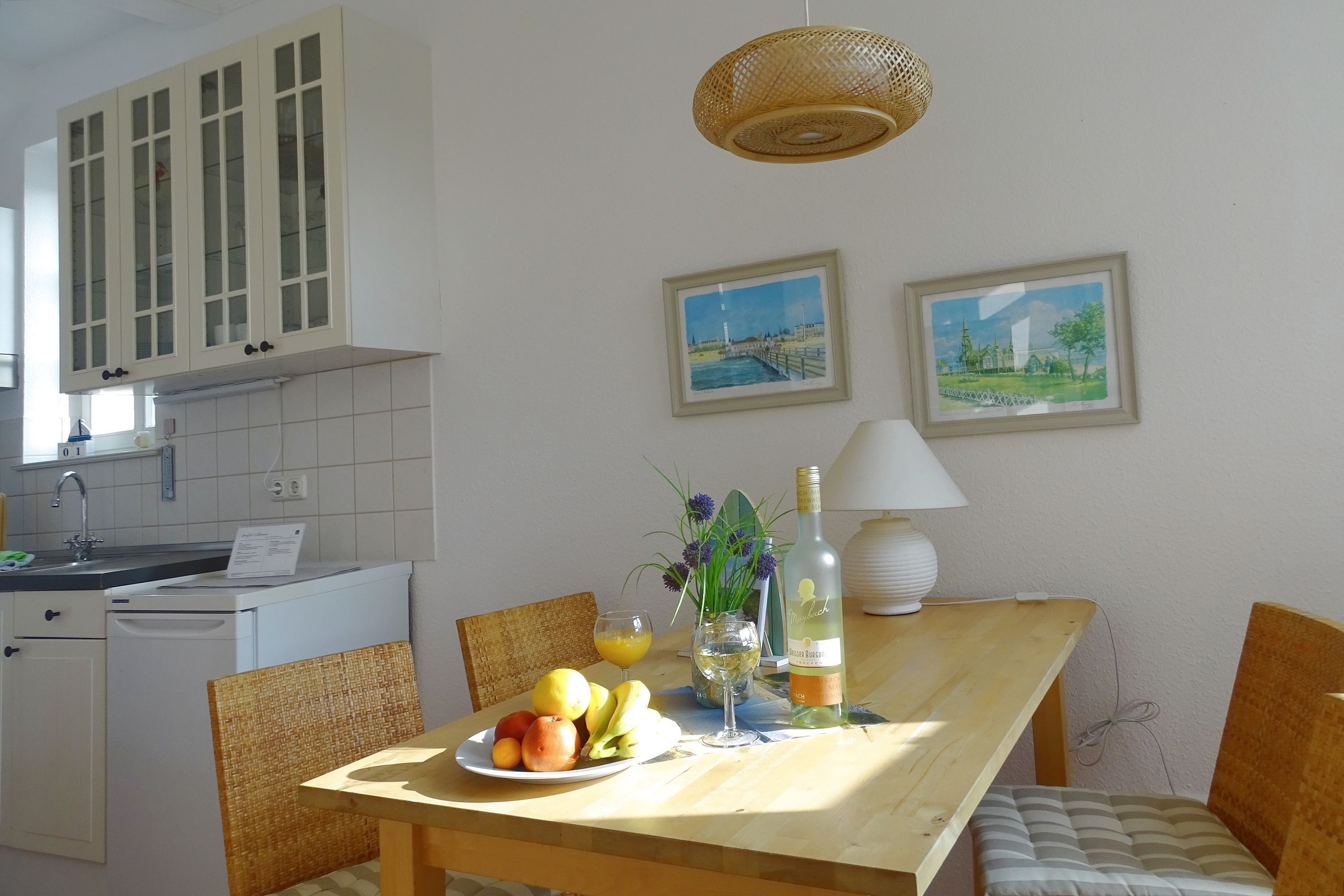 Das Appartement erreichen Sie über einen separaten Eingang. Ein kleiner Flur empfängt Sie und bietet ausreichend Platz für Ihre Garderobe und Schuhe. Linkerhand gelangen Sie in den großzügigen Wohnbereich mit integrierter Küchenzeile. Diese ist komplett ausgestattet unter anderem mit Kühlschrank samt Gefrierfach, 4-Zonen-Kochfeld, Backofen, Geschirrspüler, Mikrowelle, Kaffeemaschine, Wasserkocher und Toaster alles, was Sie für eine entspannte Selbstversorgung benötigen.