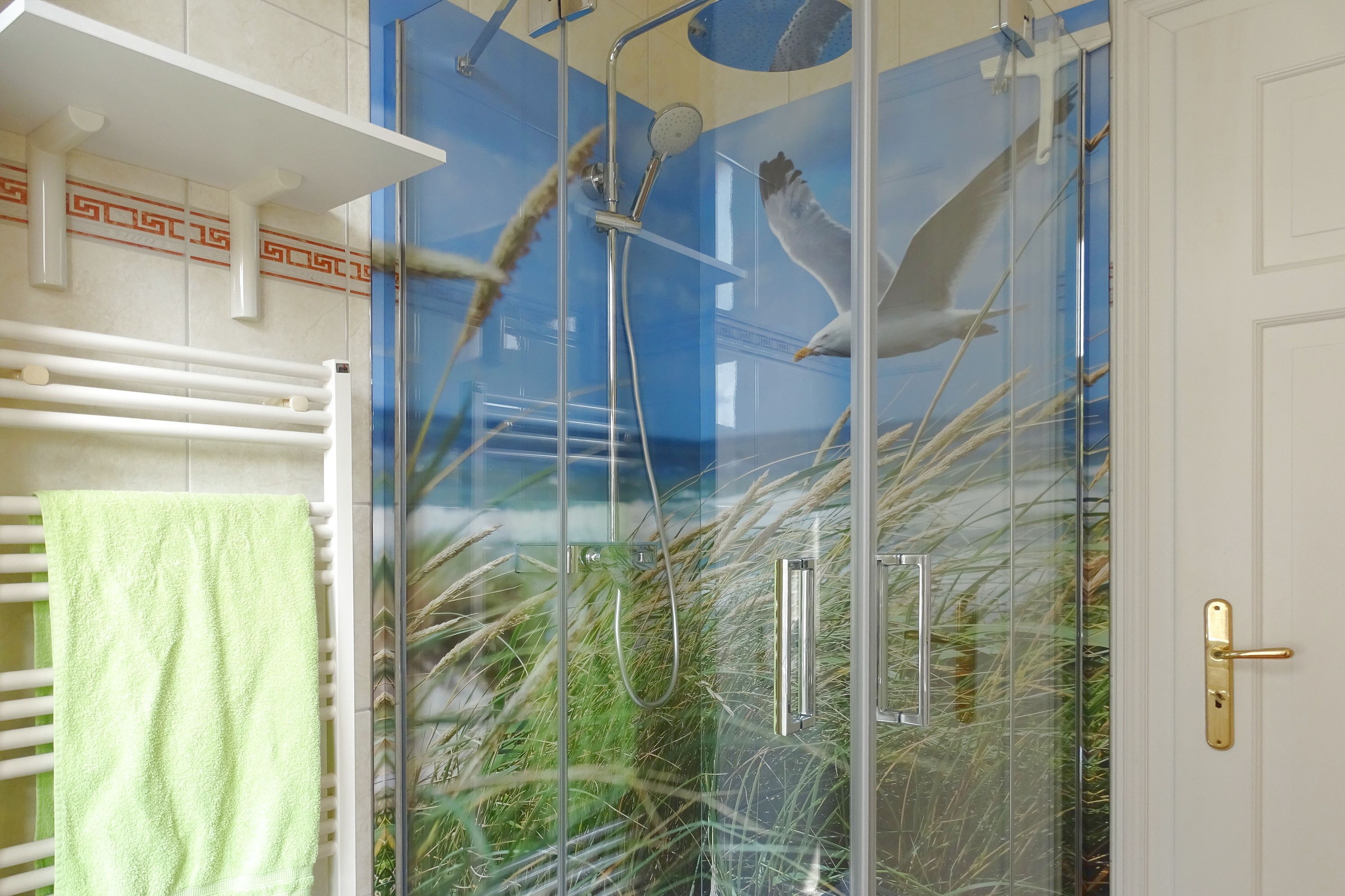 Das Badezimmer mit Fenster ist ausgestattet mit WC, Haartrockner und einer modernen Duschkabine mit Ostseestrand-Motiv so wird selbst das Duschen zu einem kleinen Urlaubserlebnis.