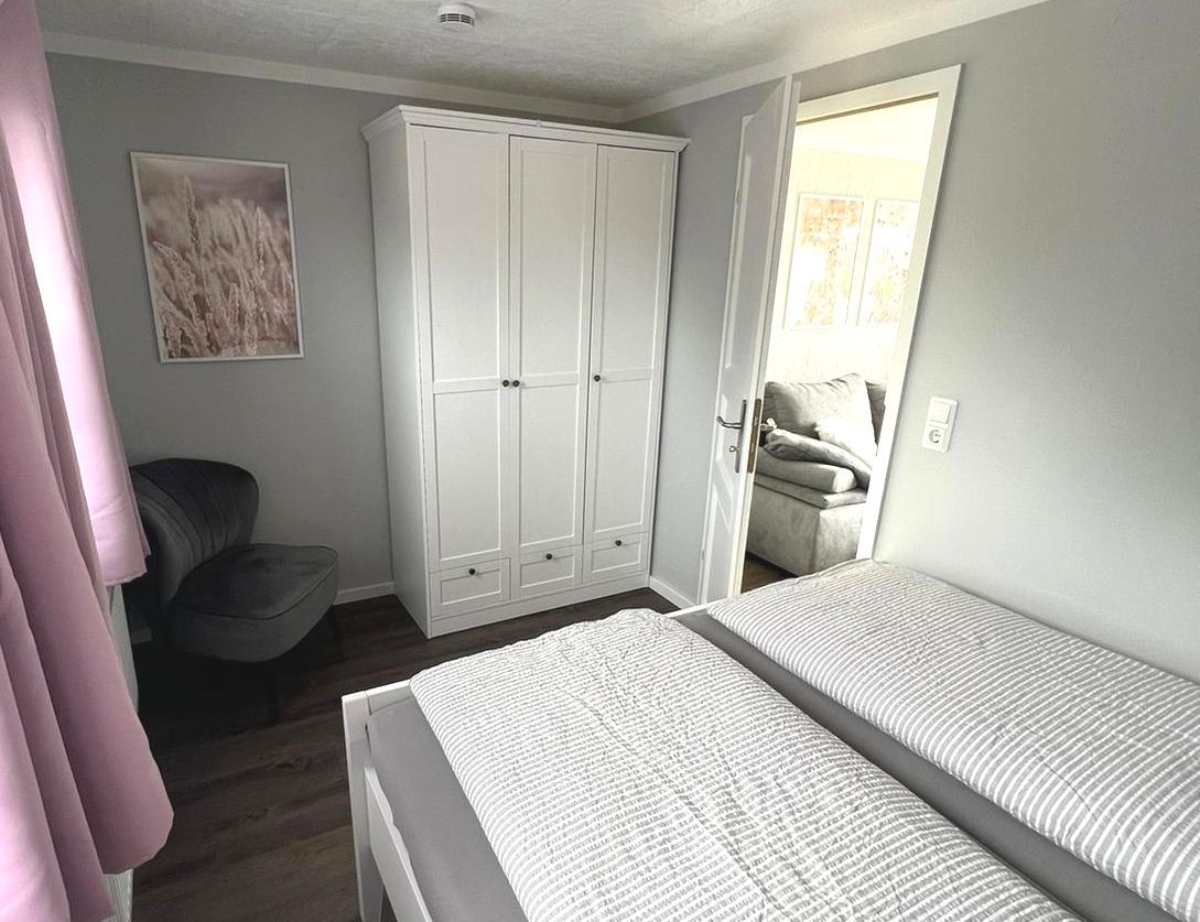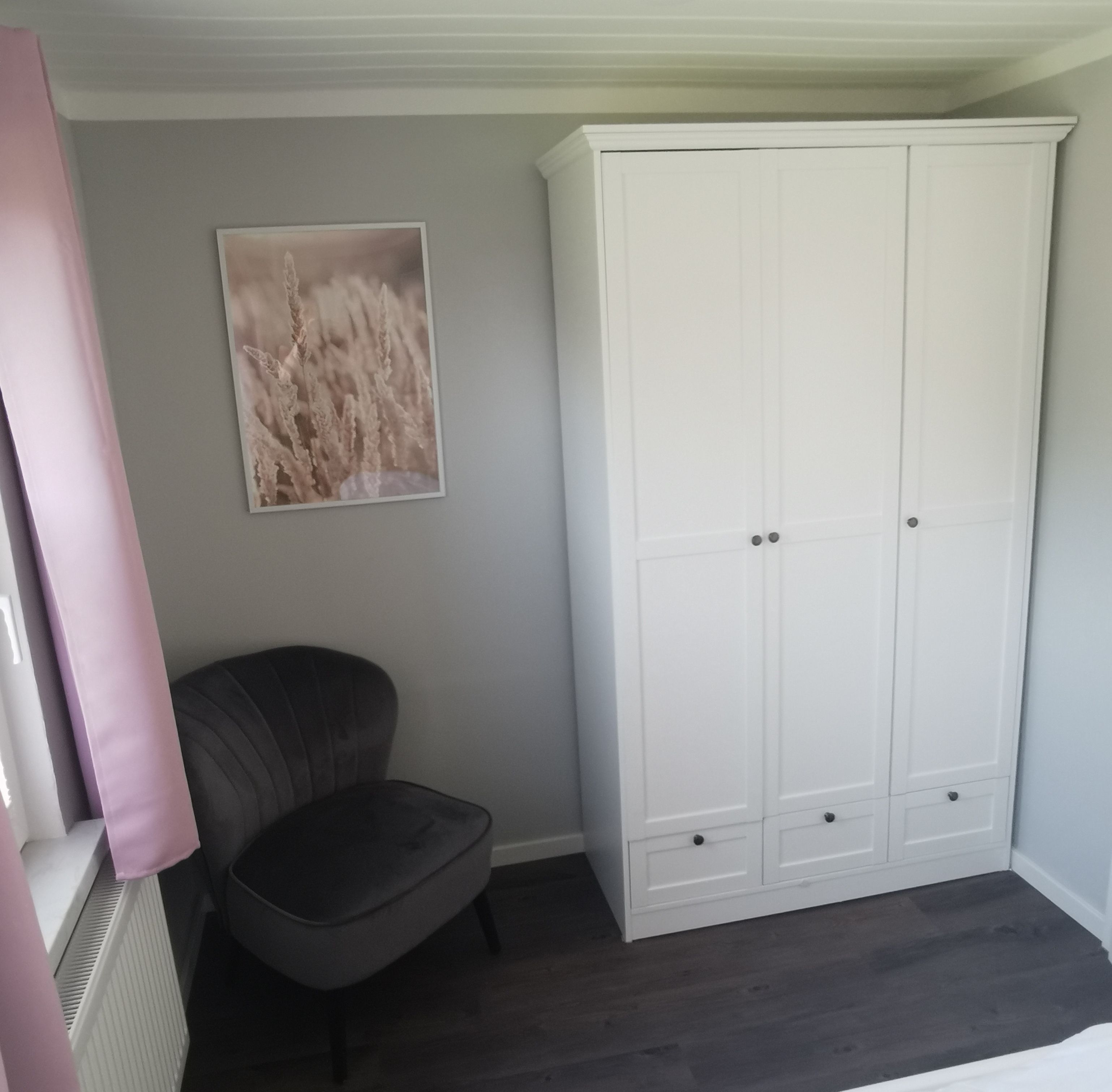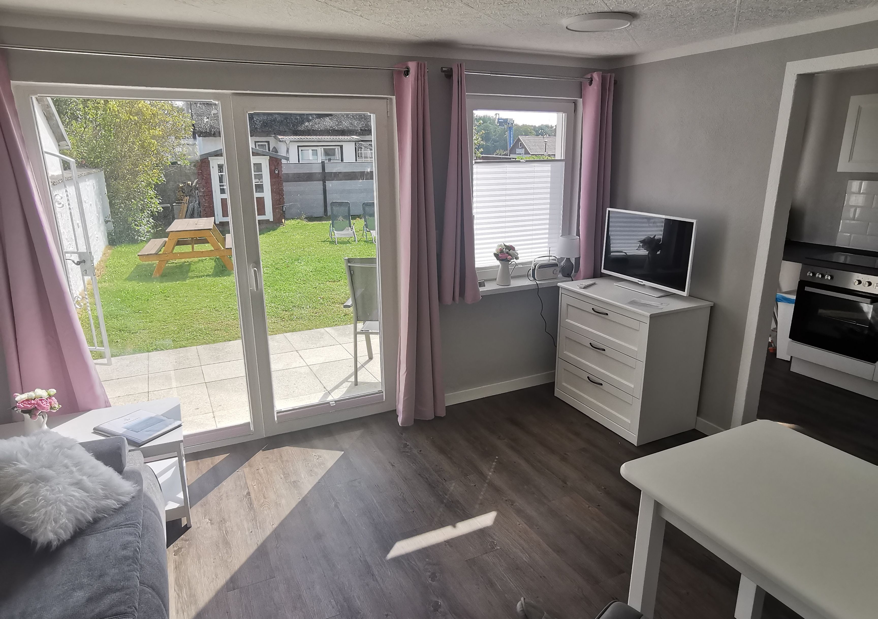 Die Wohnung Treibholz befindet sich im Boddenferienhaus und verfügt über ein Schlafzimmer mit Doppelbett, ein Wohnzimmer mit Schlafsofa, einer Einbauküche und ein Badezimmer mit Dusche.