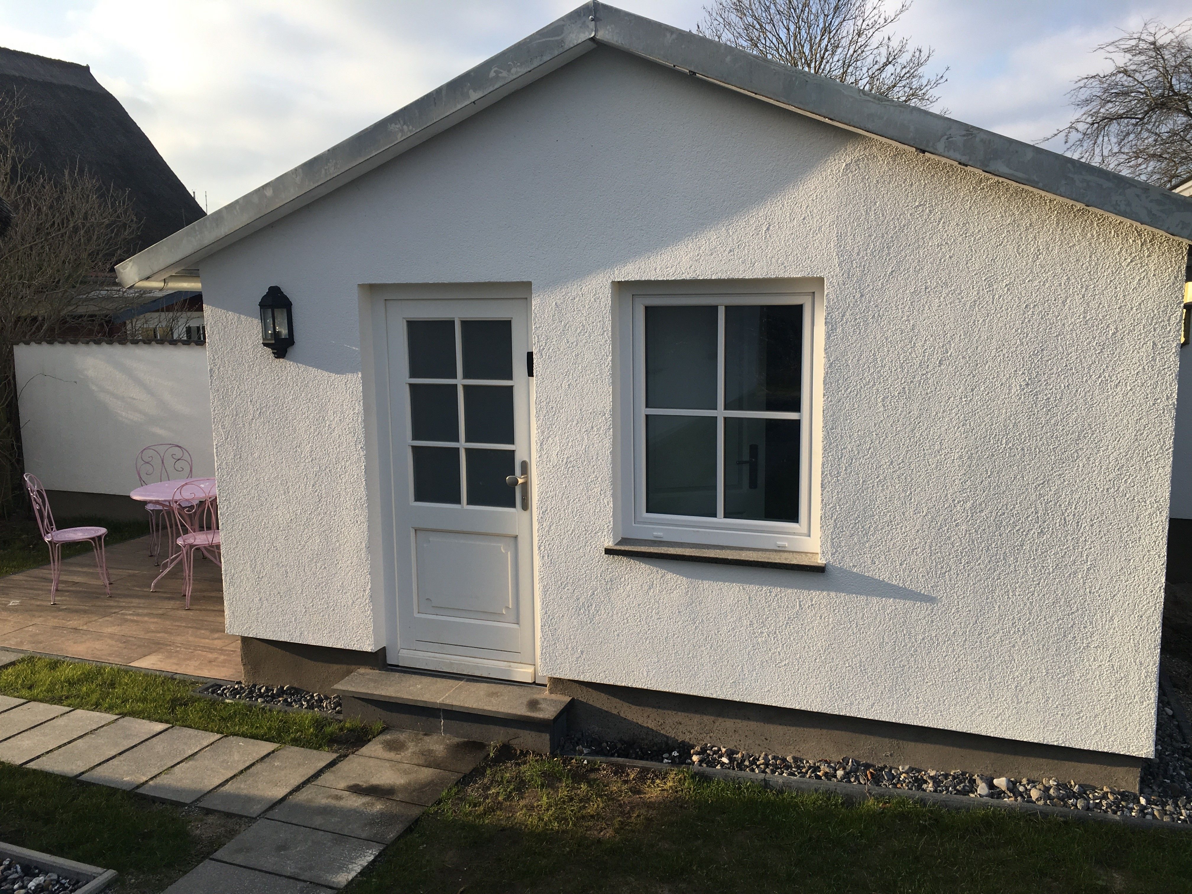 Das Reetferienhaus verfügt über ein Wohnzimmer mit Essbereich und Schlafsofa, ein Schlafzimmer mit Doppelbett (1,4m breit), eine Einbauküche und ein großes Bad mit ebenerdiger Dusche. Im Eingangbereich befindet sich ein großer Kleiderschrank.