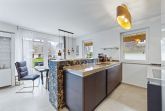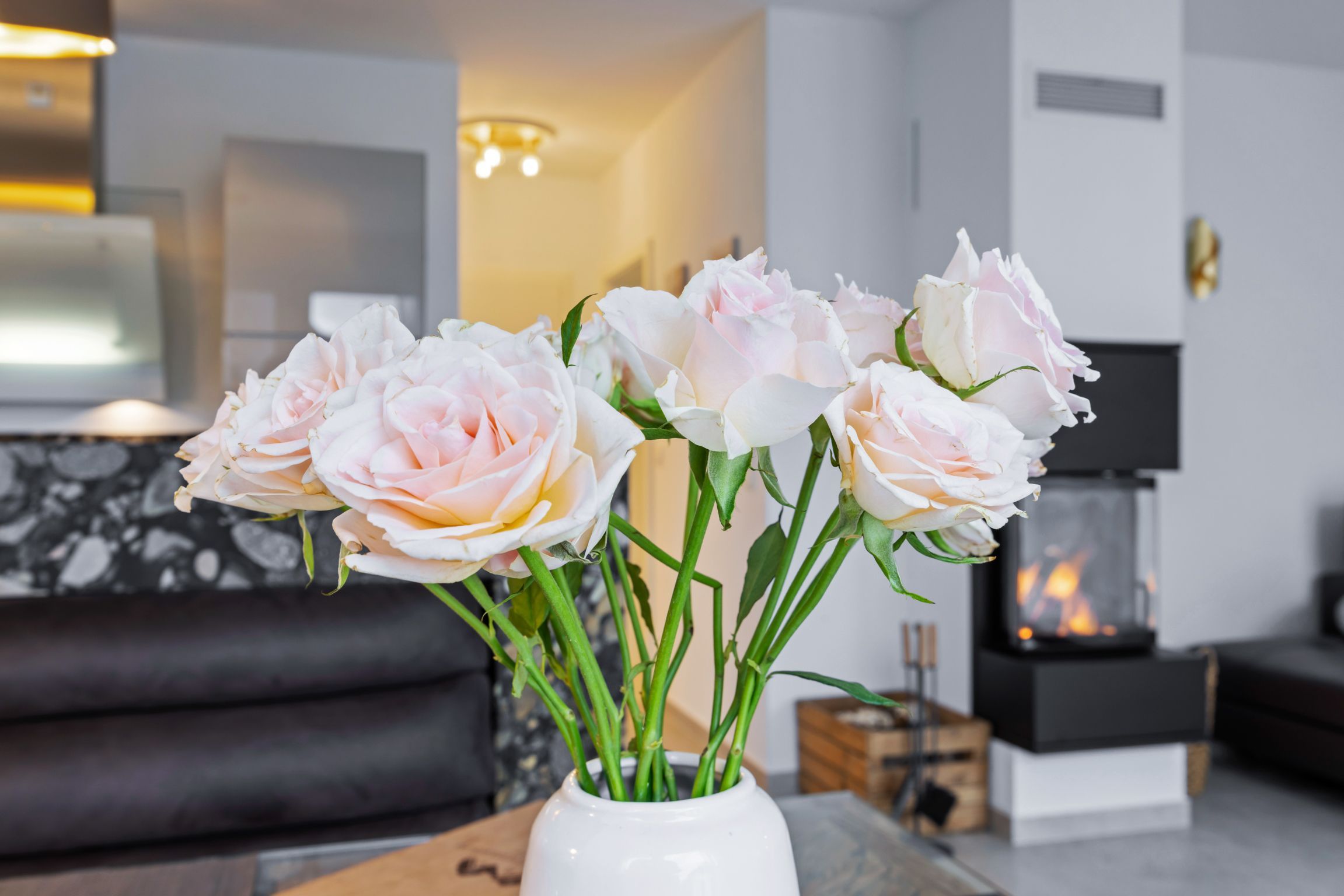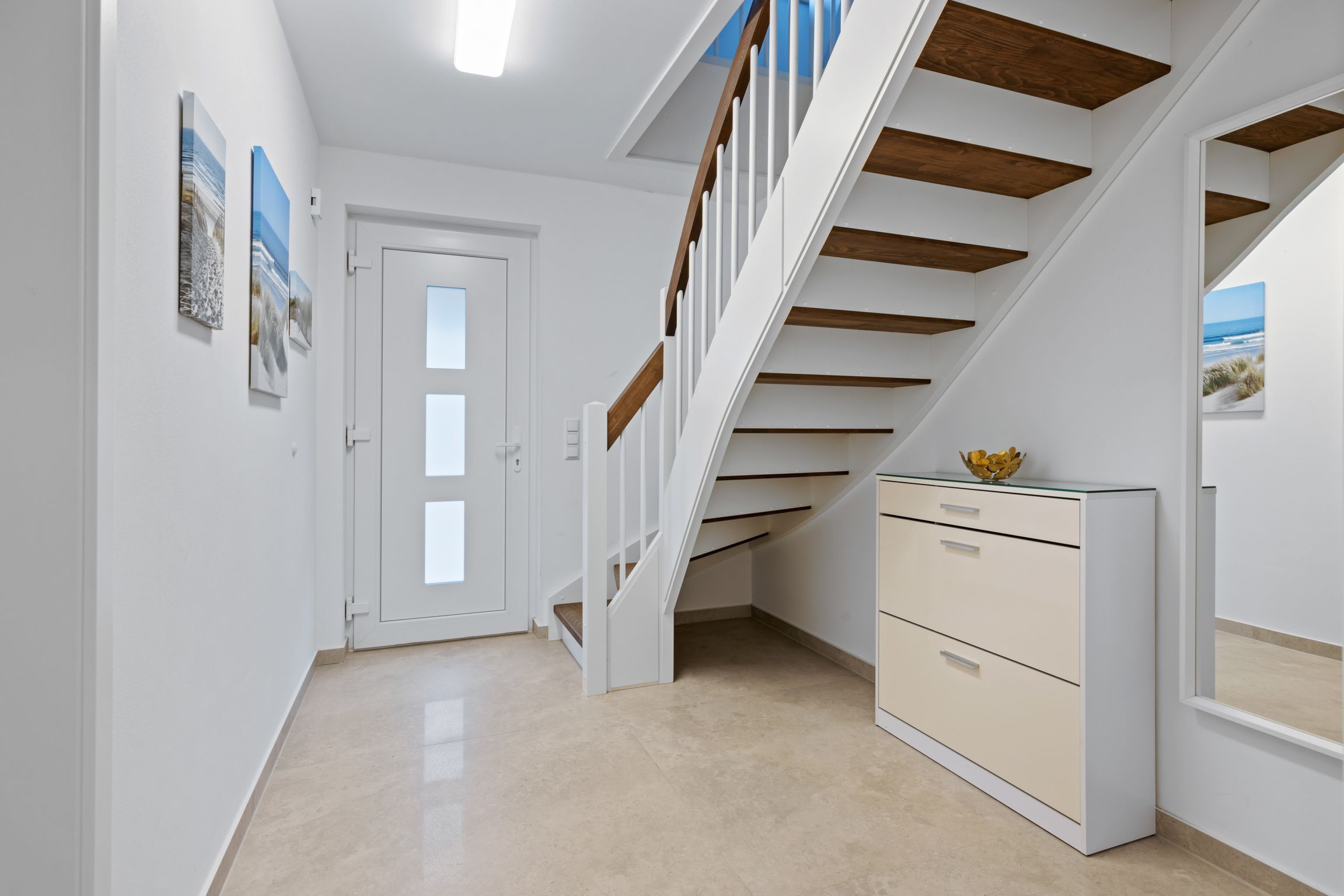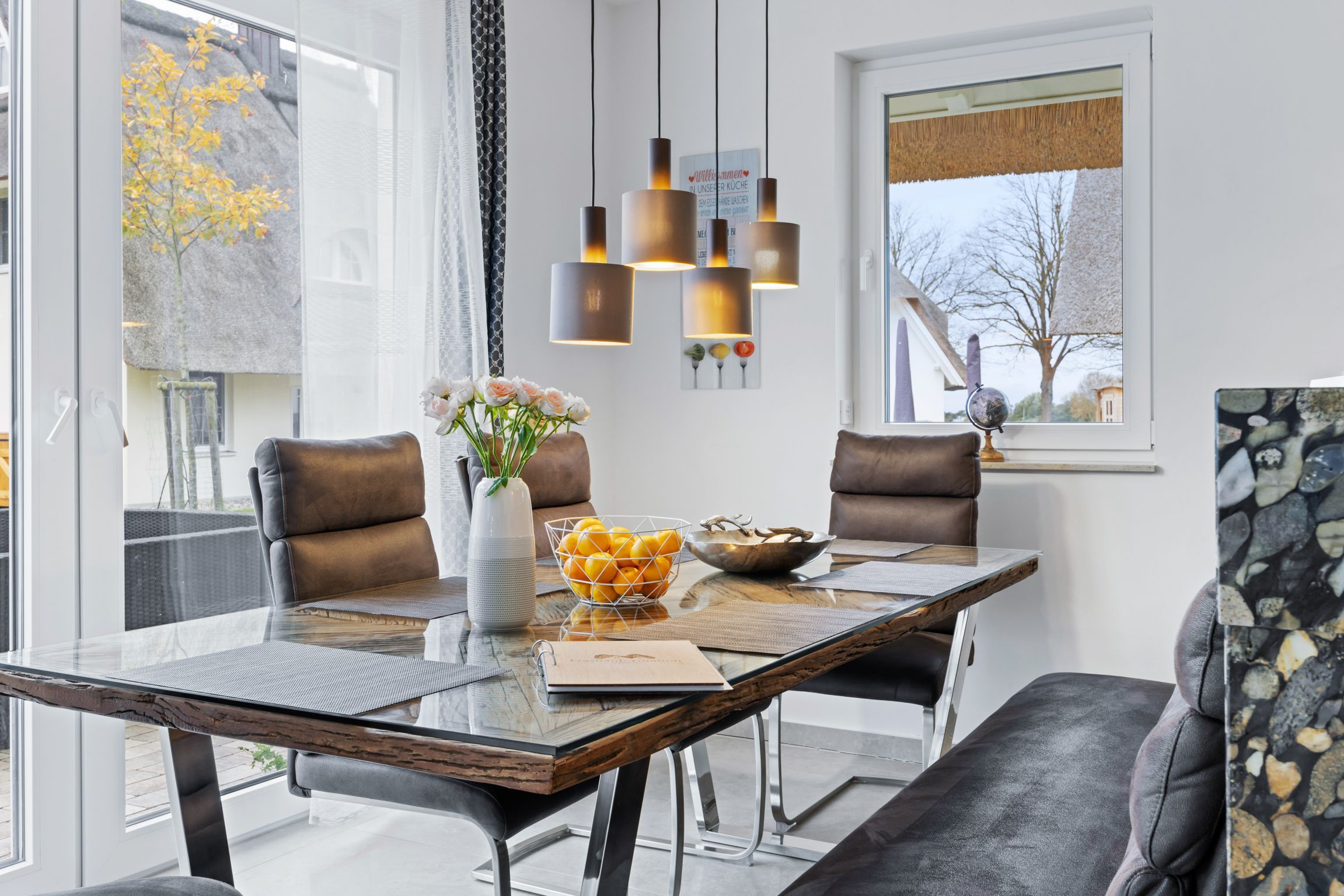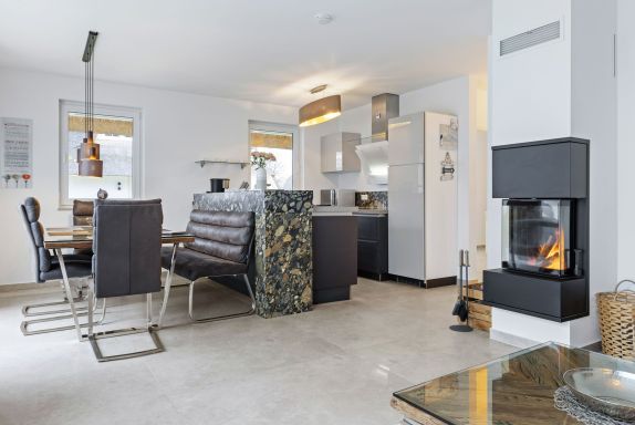 Weitläufiger Flur zum Ankommen. Großzügiger, hochwertig und stilvoll eingerichteter Wohn- Essbereich mit gemütlicher Sofaecke und Kamin sowie Smart TV. Die Küche verfügt über einen großen Esstisch für 8 Personen und eine umfangreiche Ausstattung mit Geschirrspüler, Backofen, Cerankochfeld mit 5 Kochfeldern, Mikrowelle mit Grillfunktion, Wasserkocher, Filterkaffeemaschine und jede Menge weitere Küchenutensilien. Aus der Küche gelangt man direkt auf den schönen 40qm großen Terrassenbereich. Hier lassen sich der Garten und die Weite des Ostseehimmels genießen.