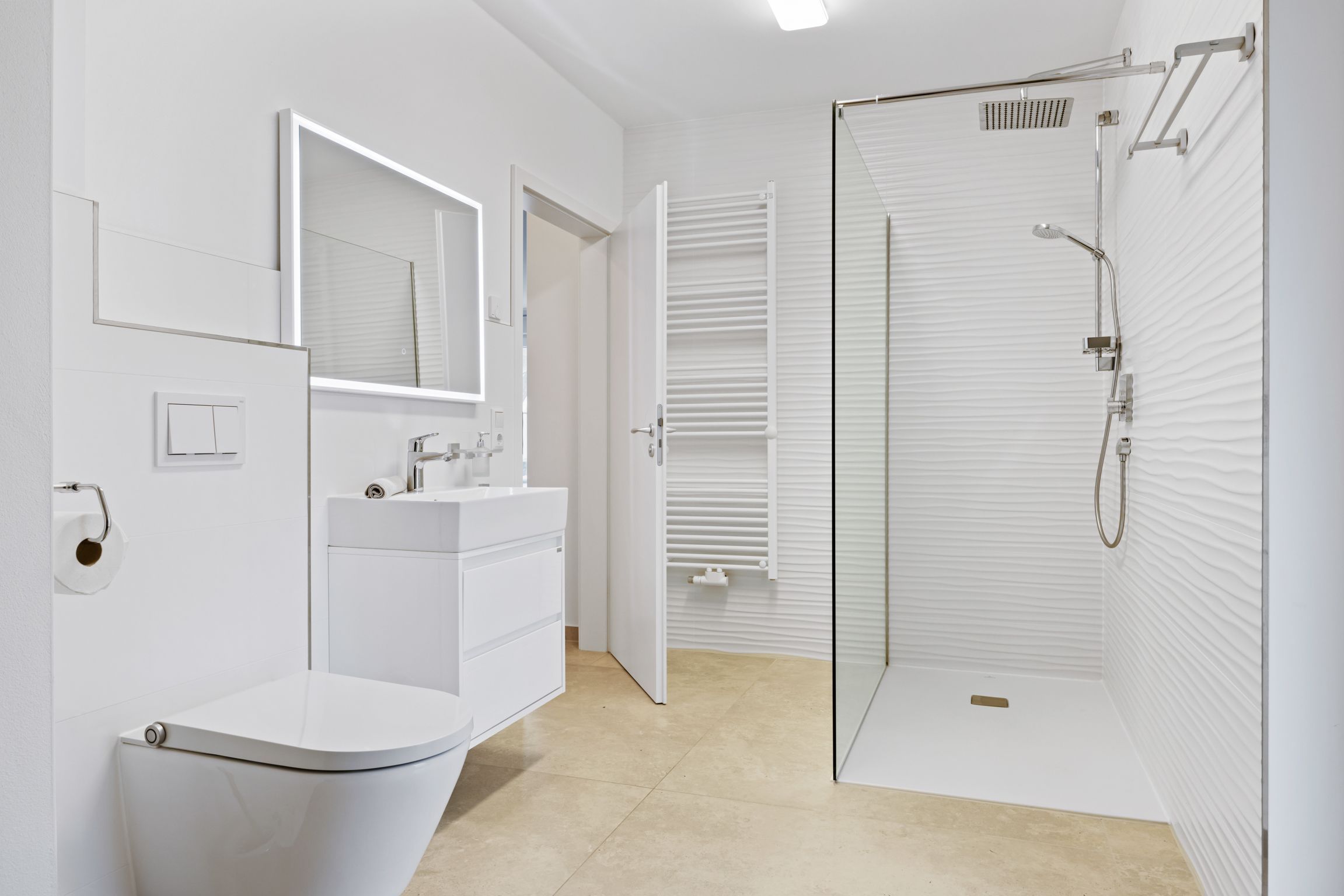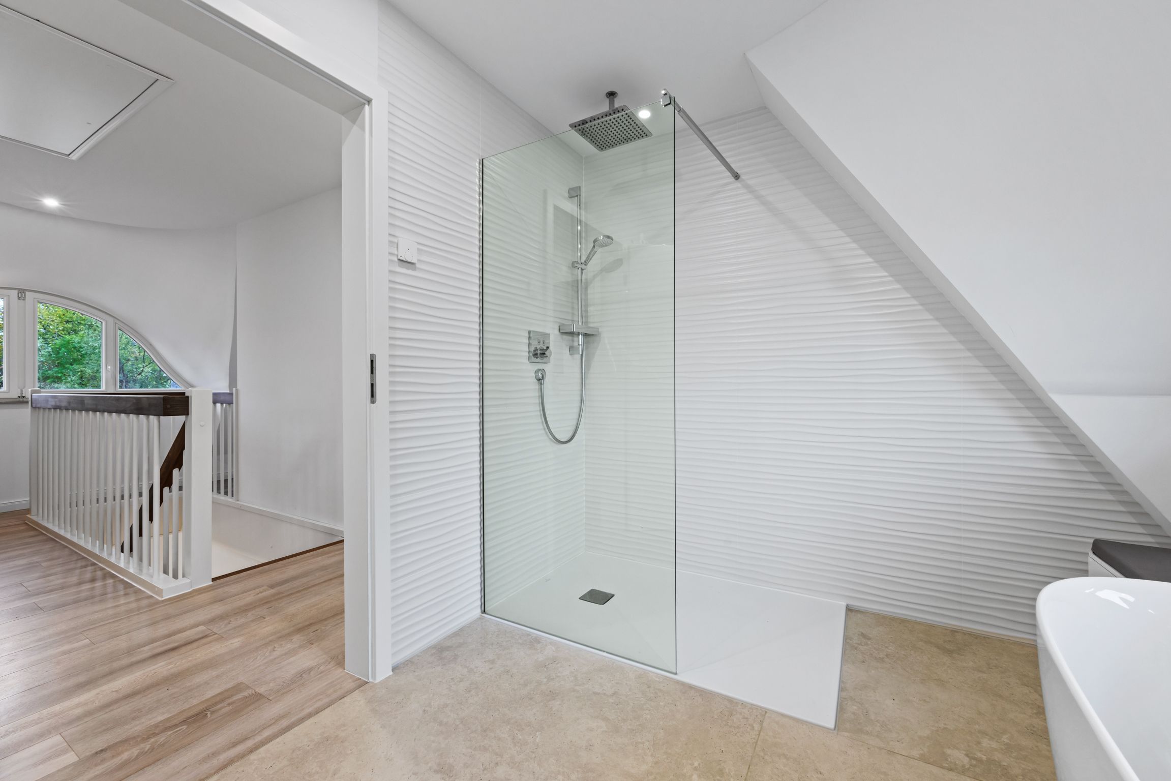 Bad mit Sauna und großer ebenerdiger Rainshower- Dusche und zusätzlichem Bidet.