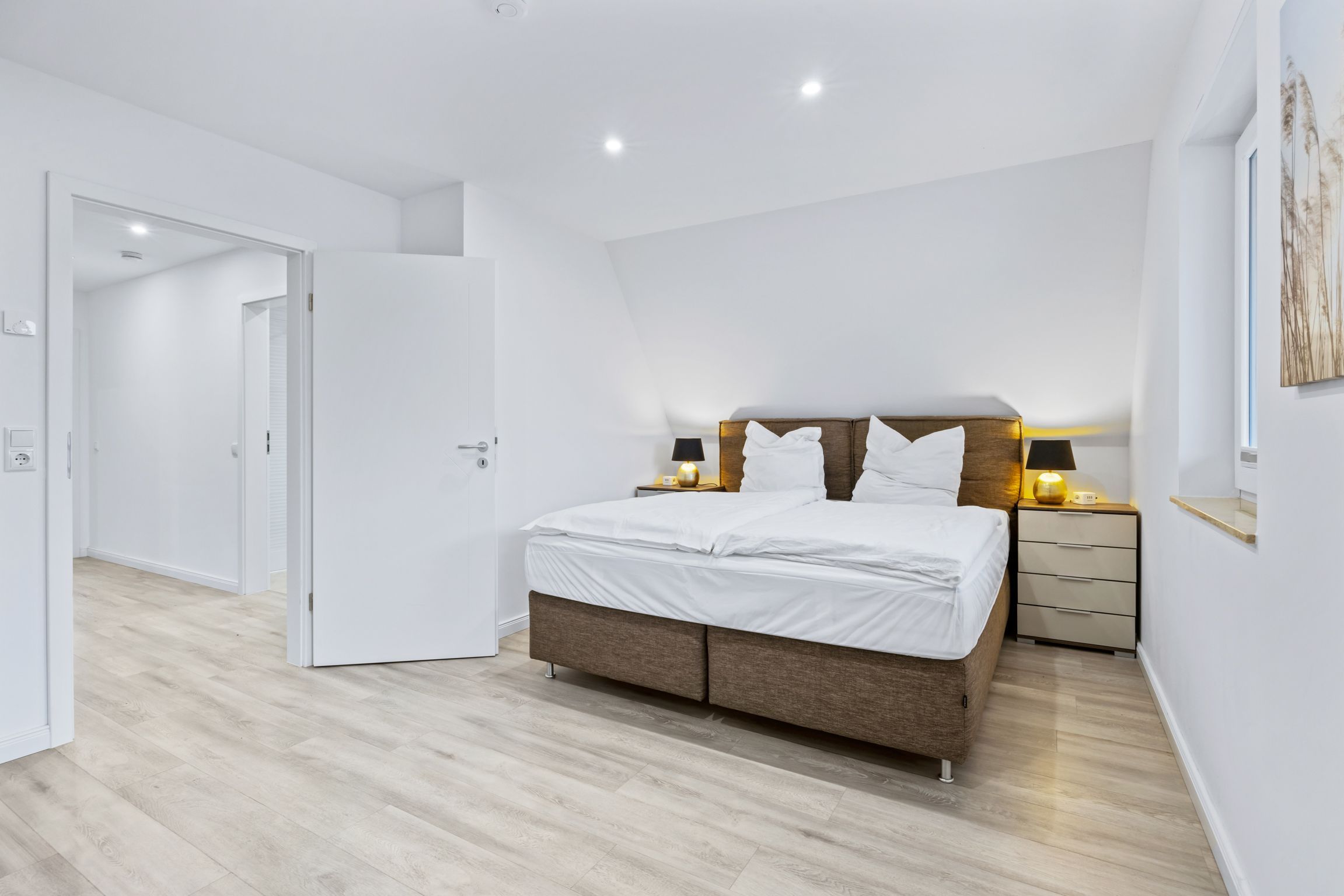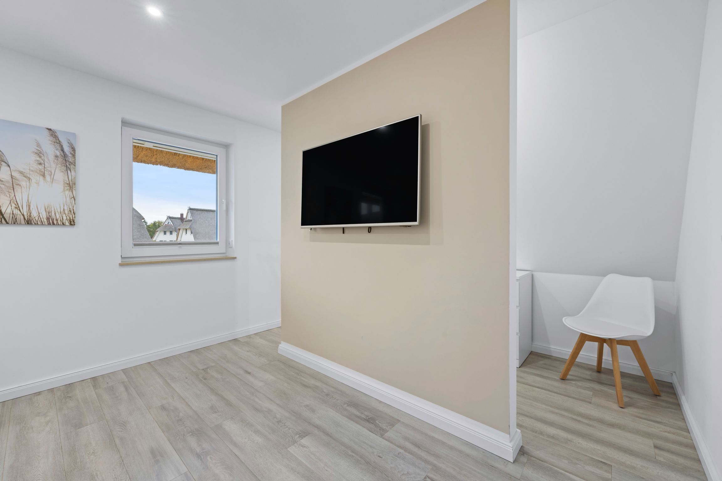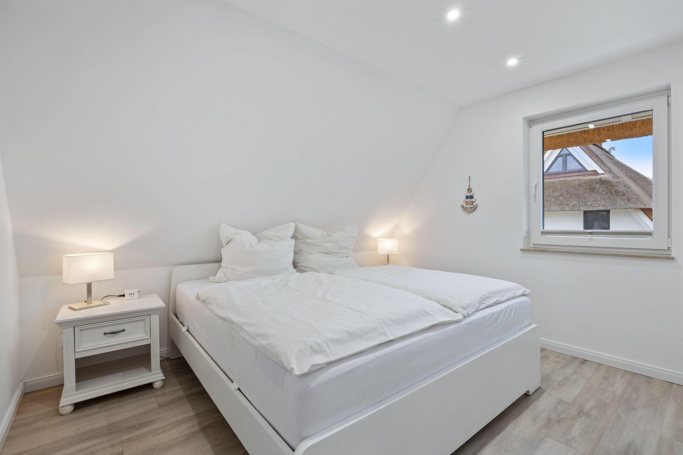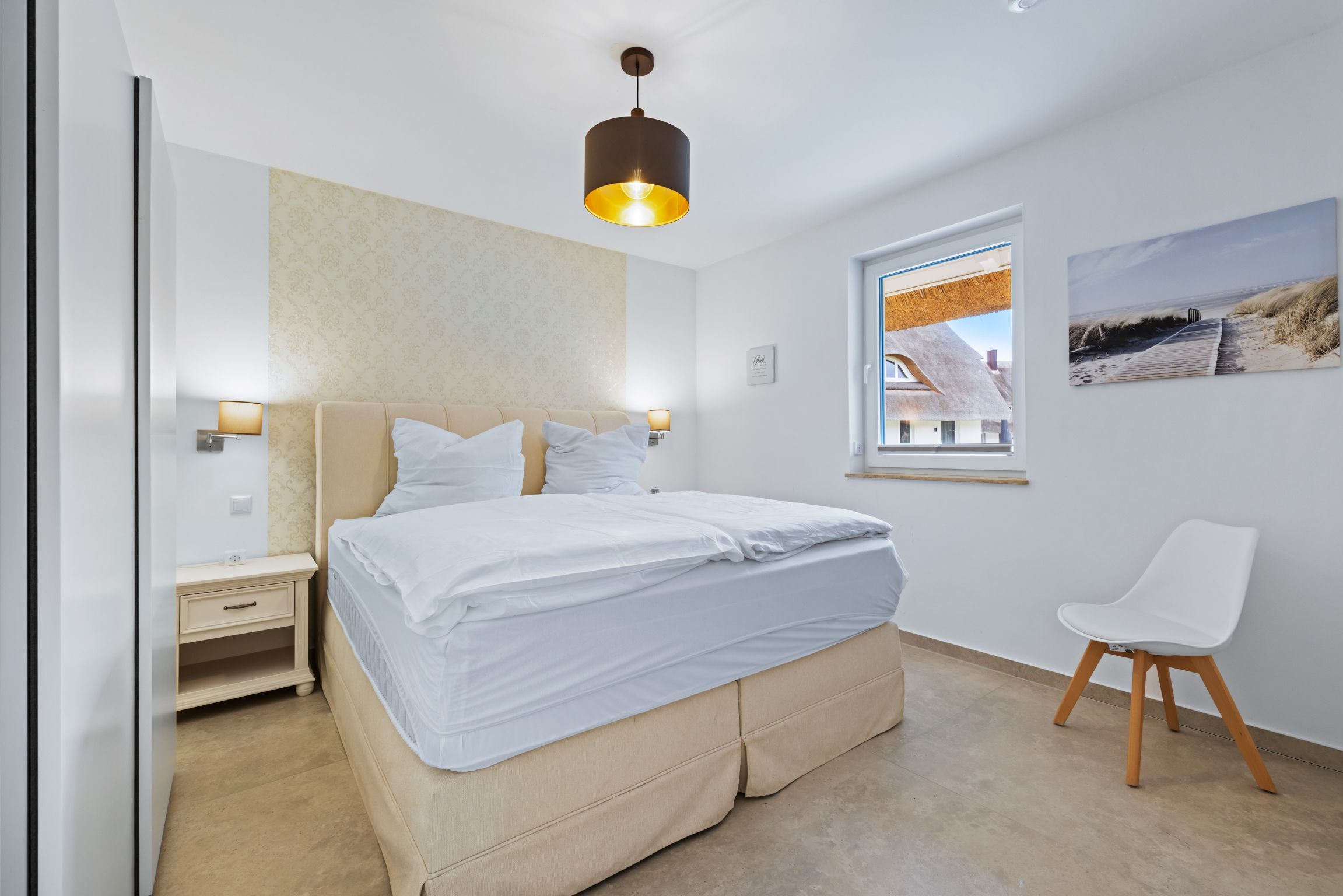 Im Obergeschoss befinden sich drei weitere Schlafzimmer. Schlafzimmer 2 mit Boxspring Doppelbett (1,80 x 2,00m) und TV. Schlafzimmer 3 mit Boxspring Doppelbett (1,80 x 2,00m), TV und Kleiderschrank, Schlafzimmer 4 mit Boxspring Doppelbett (1,40 x 2,00m), TV und Kleiderschrank. Im Flur entsteht ein separater Arbeitsplatz für die Gäste des Hauses. Individuelles Wohlfühlbad unter dem Reetdach mit Badewanne und Rainshower- Dusche sowie Bidet.