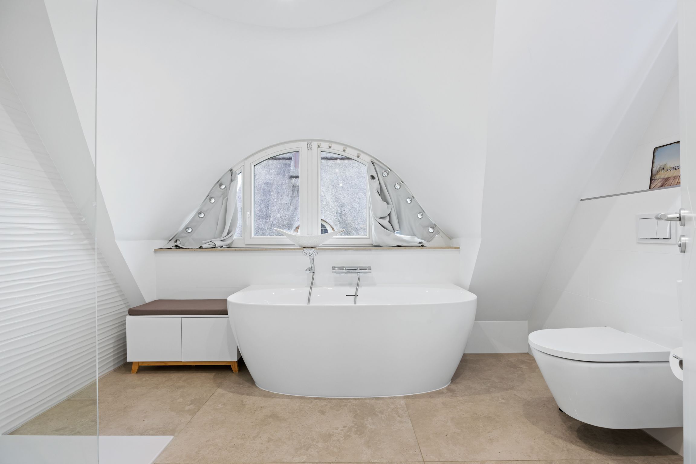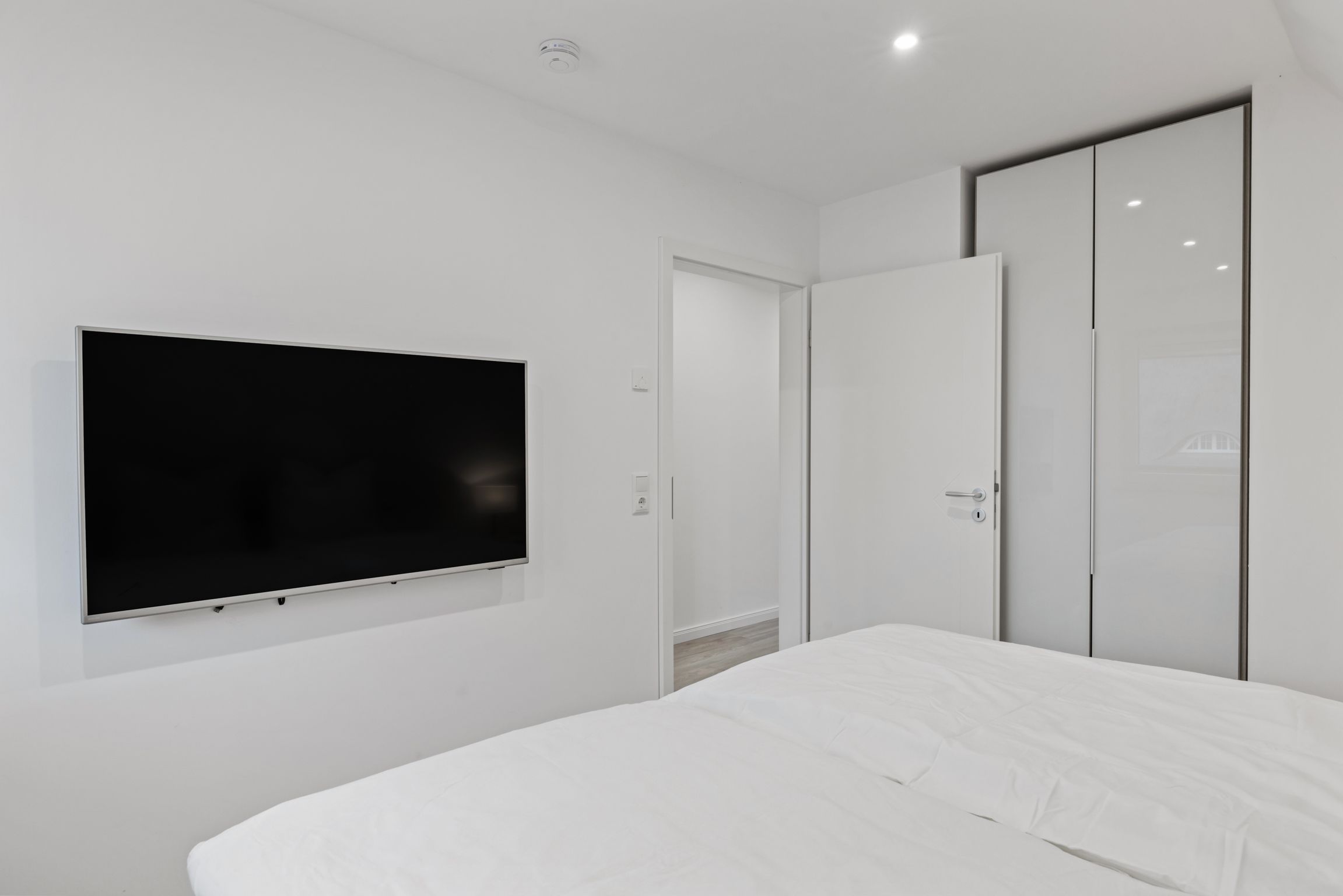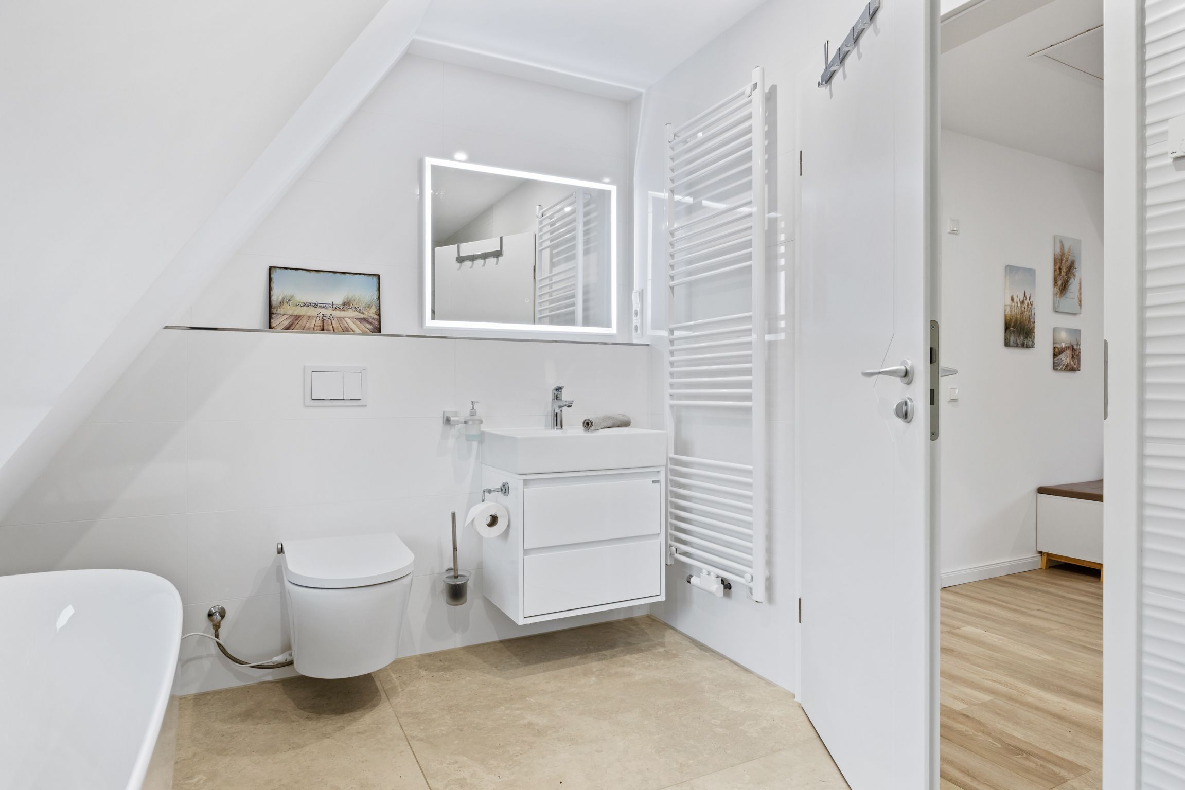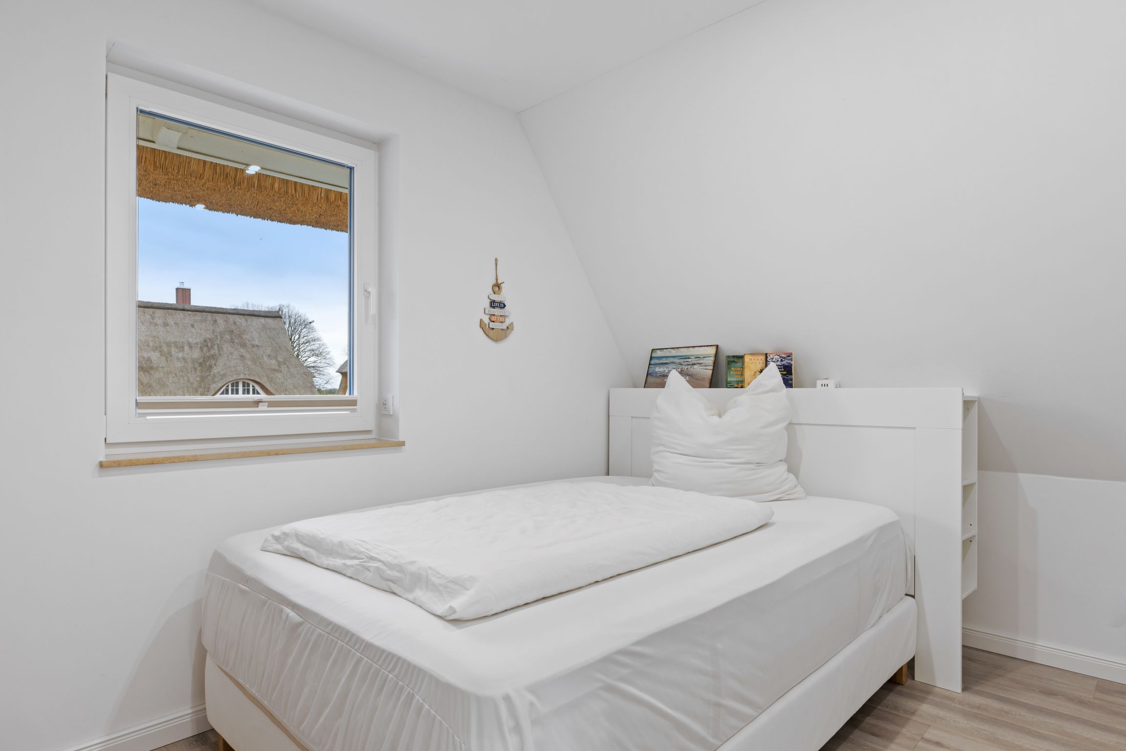 Im Obergeschoss befinden sich drei weitere Schlafzimmer. Schlafzimmer 2 mit Boxspring Doppelbett (1,80 x 2,00m) und TV. Schlafzimmer 3 mit Boxspring Doppelbett (1,80 x 2,00m), TV und Kleiderschrank, Schlafzimmer 4 mit Boxspring Doppelbett (1,40 x 2,00m), TV und Kleiderschrank. Im Flur entsteht ein separater Arbeitsplatz für die Gäste des Hauses. Individuelles Wohlfühlbad unter dem Reetdach mit Badewanne und Rainshower- Dusche sowie Bidet.