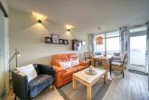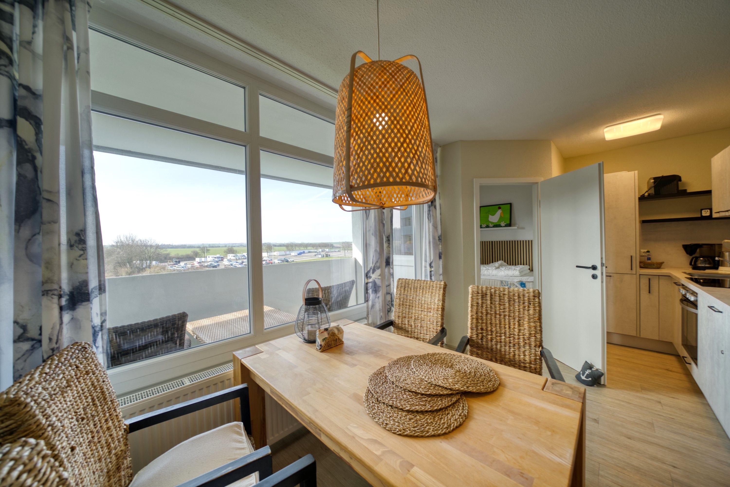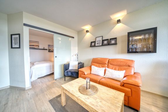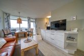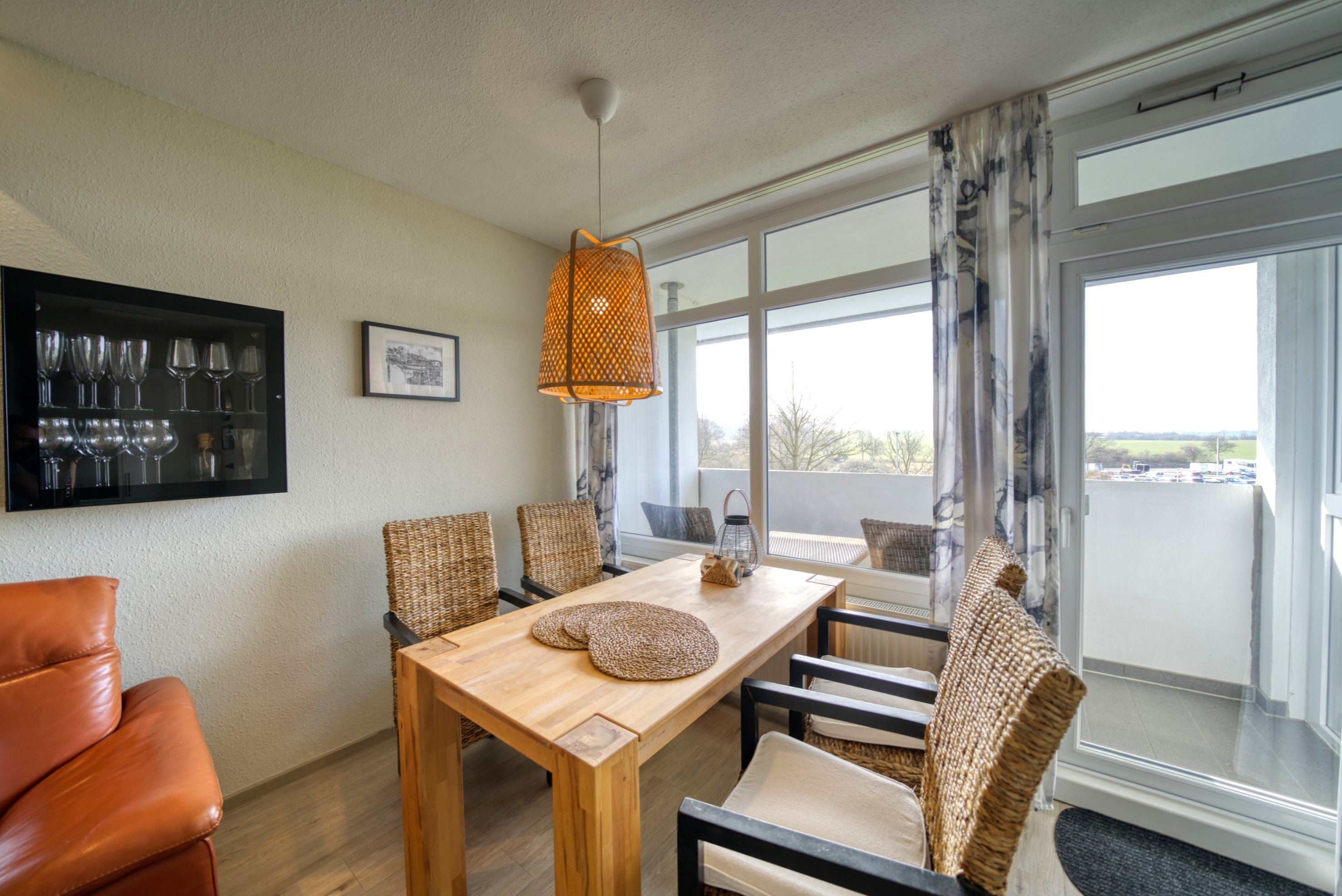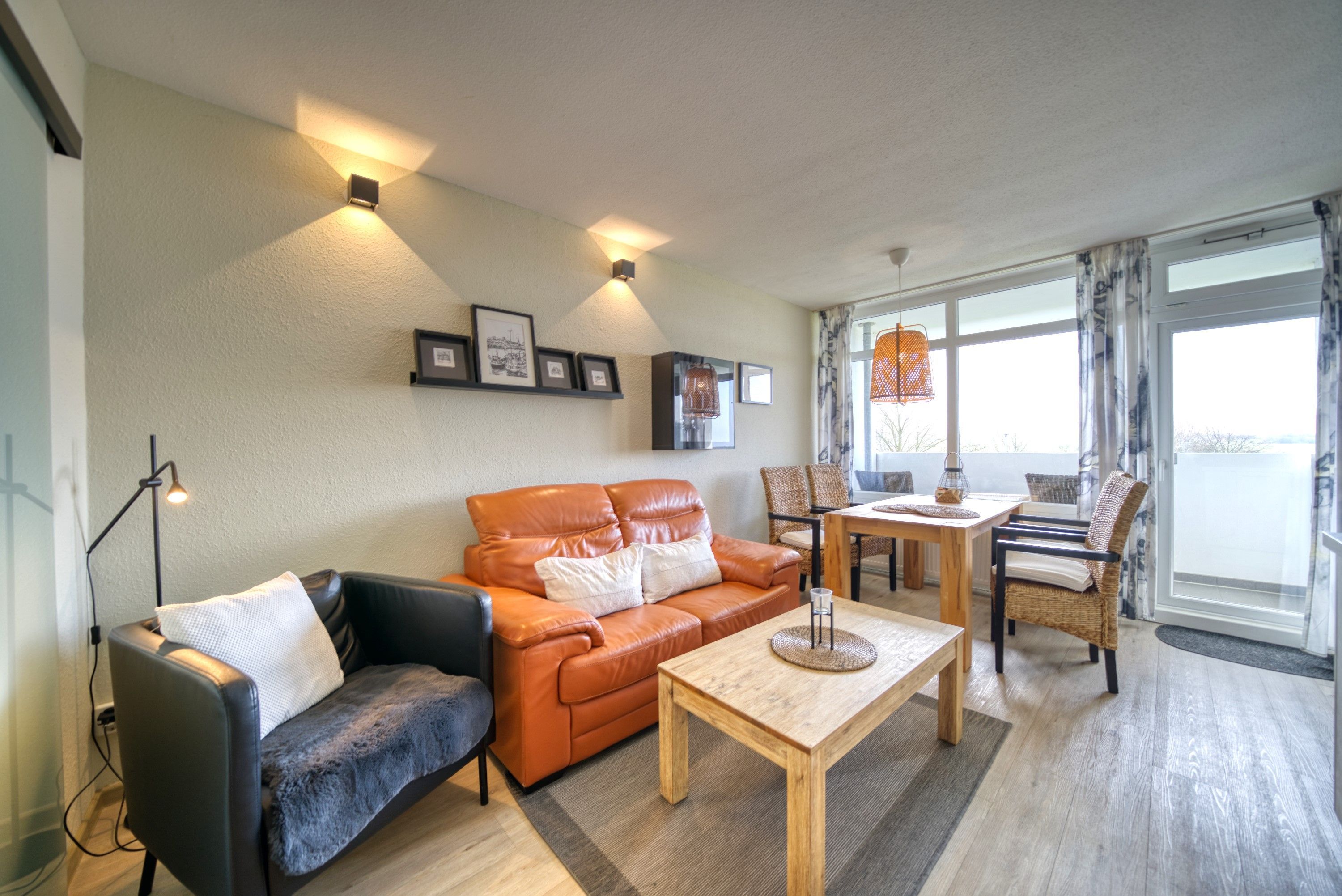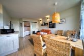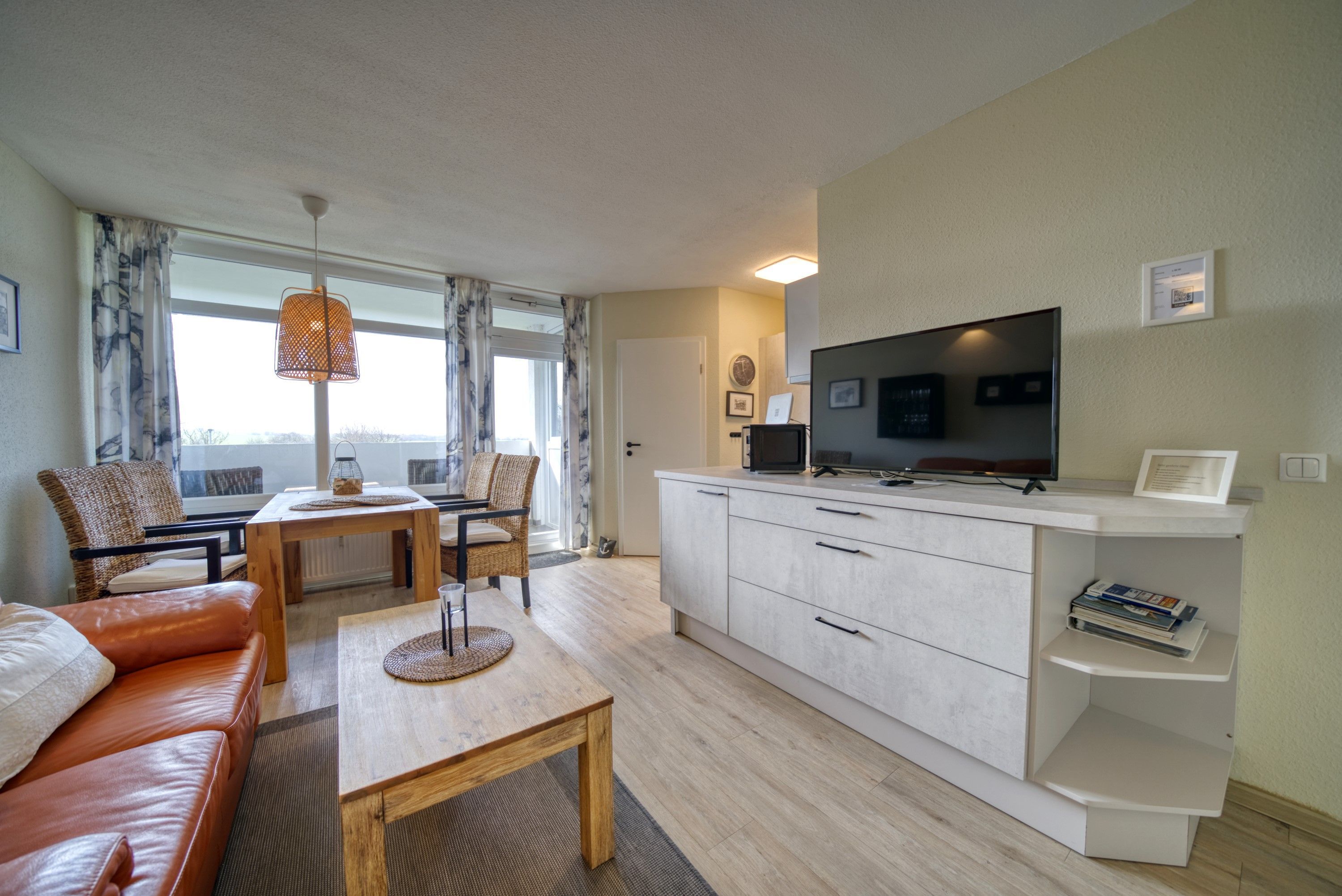 Wohn-Esszimmer mit Sofa, Sessel, Esstisch direkt am Balkon, Vinylboden und Flachbild-TV