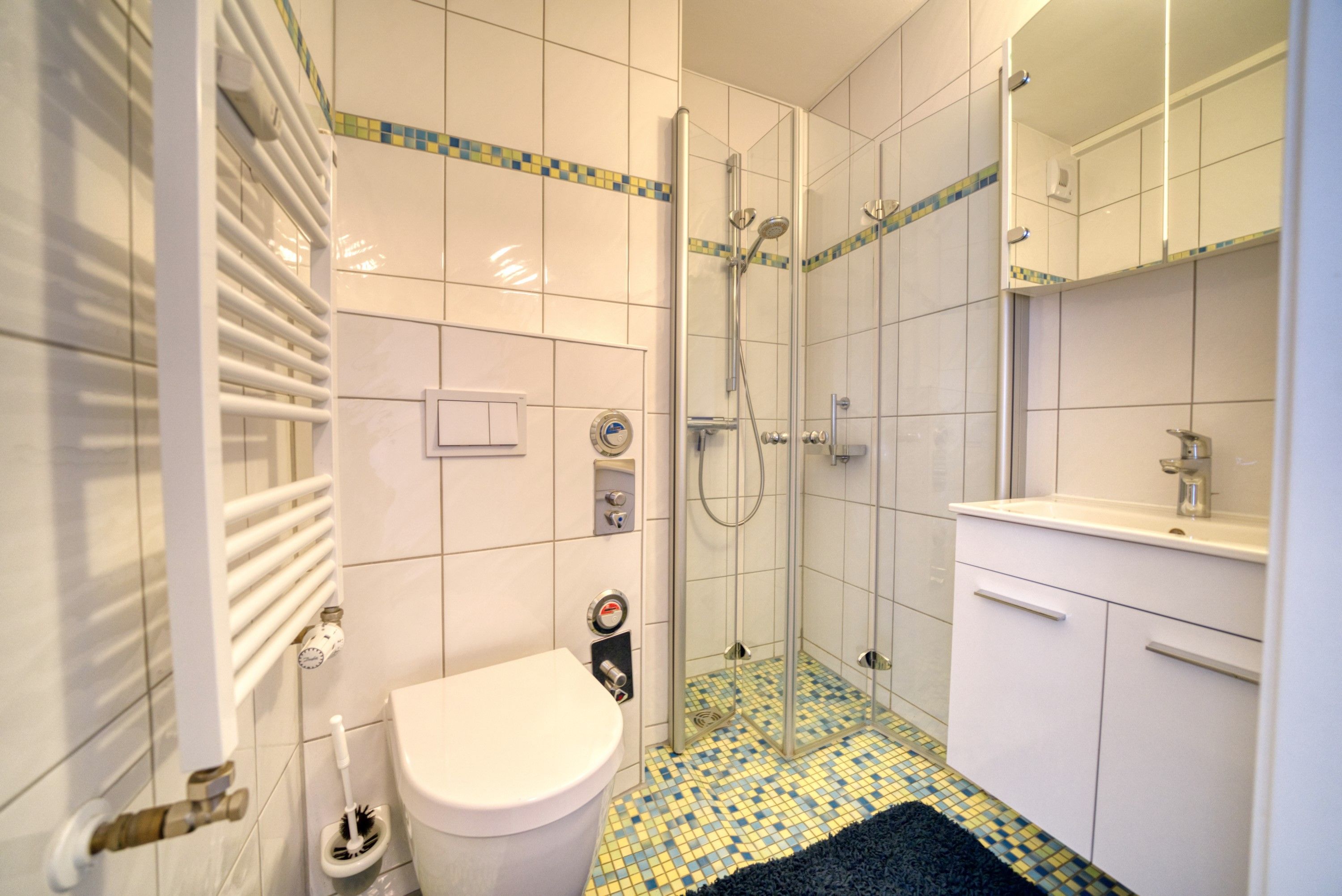 Badezimmer mit bodengleicher Duschkabine und praktischem Handtuchtrockner