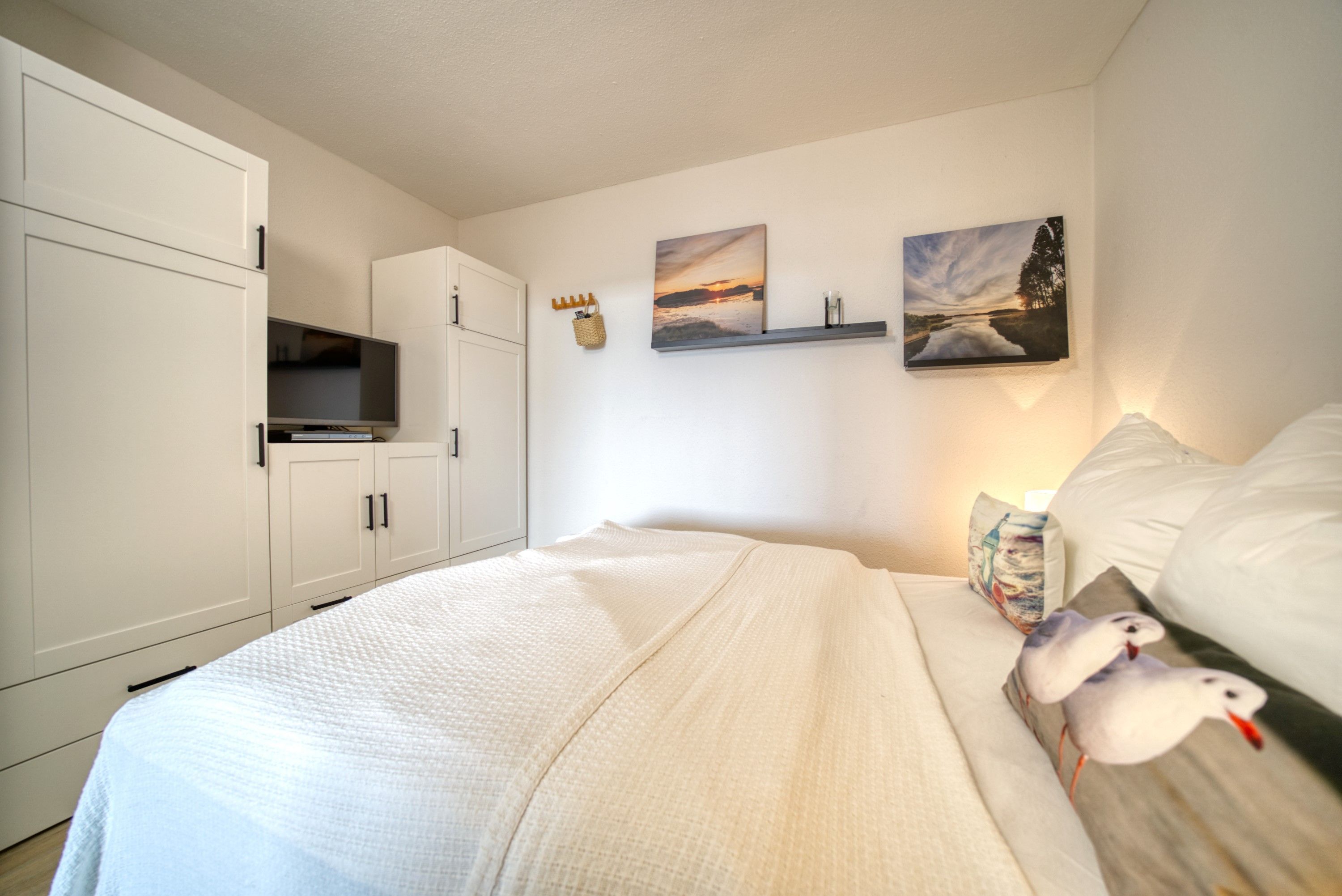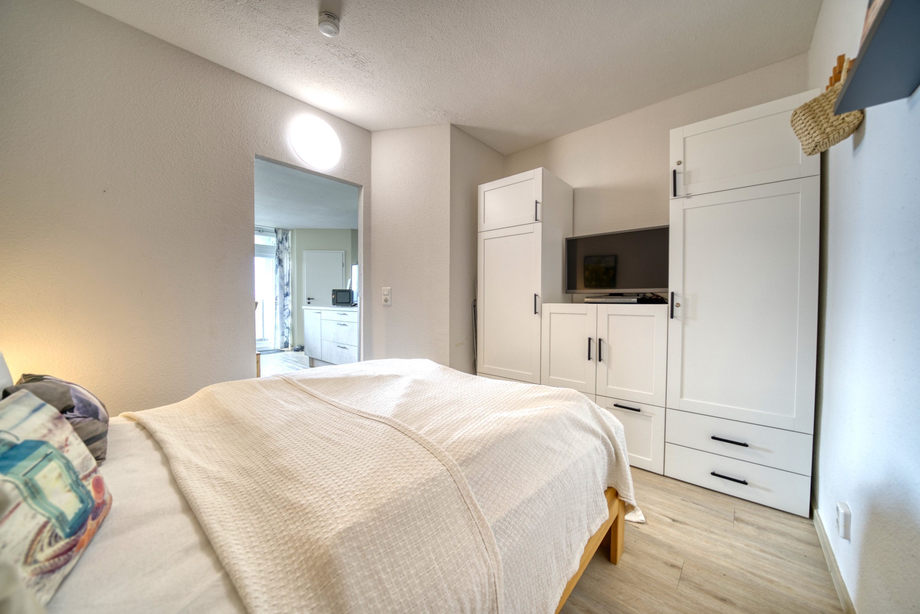 Elternschlafzimmer mit Schiebetür, Doppelbett (140?×?200?cm) und eigenem TV
