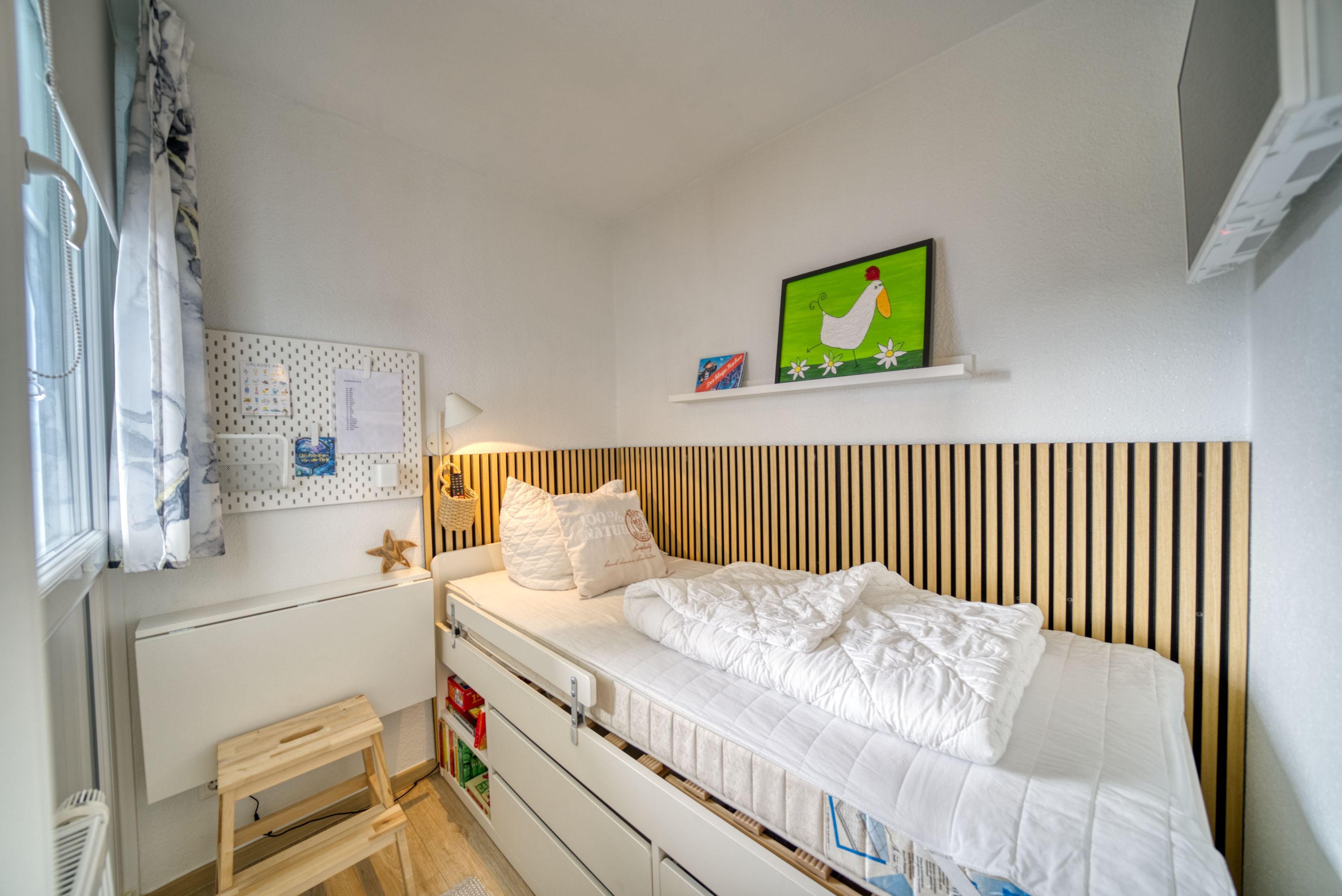 Separates Schlafzimmer mit Einzelbett und ebenfalls eigenem TV