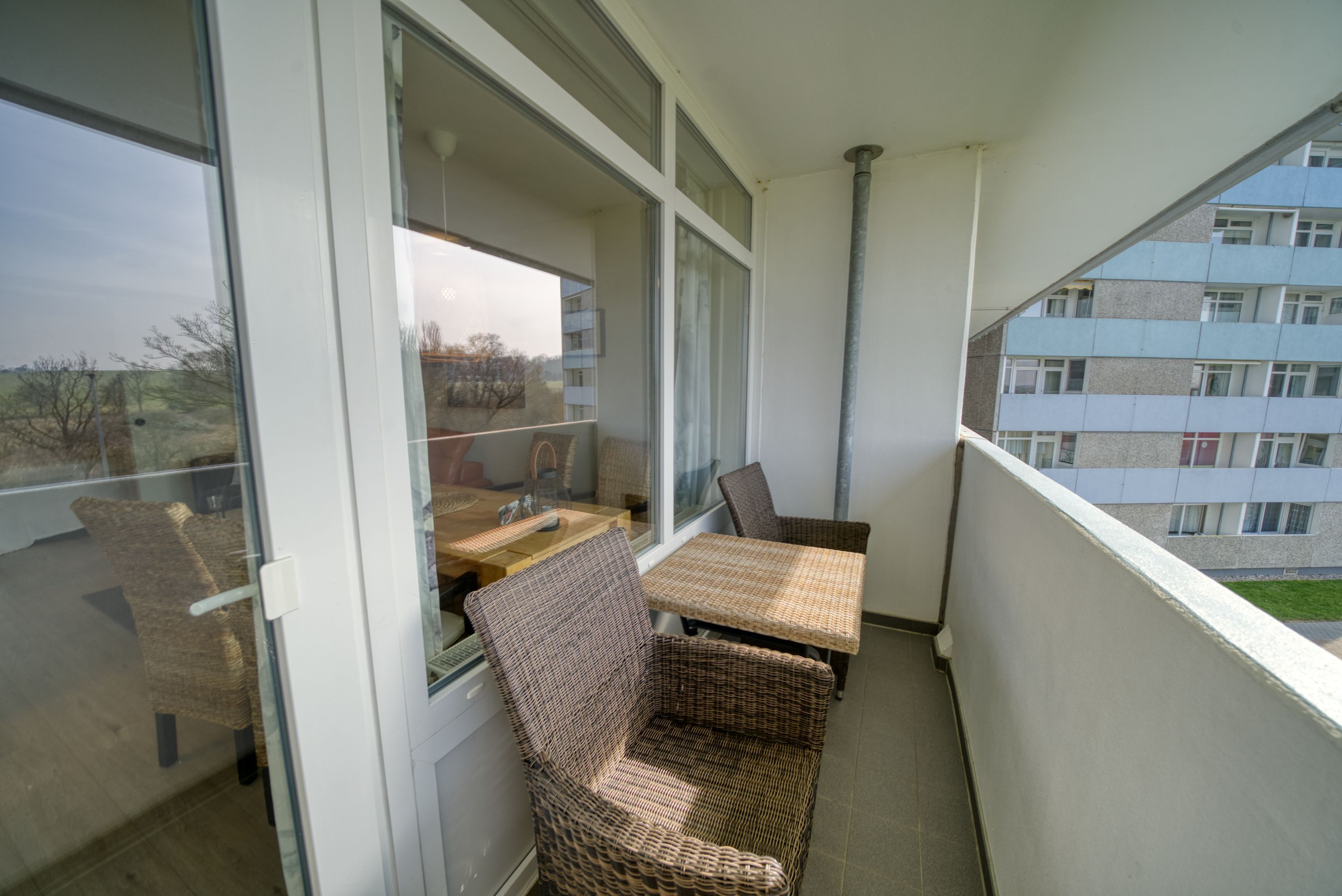 Sonniger Süd-Balkon mit Blick auf die gepflegten Grünanlagen des Ferienparks