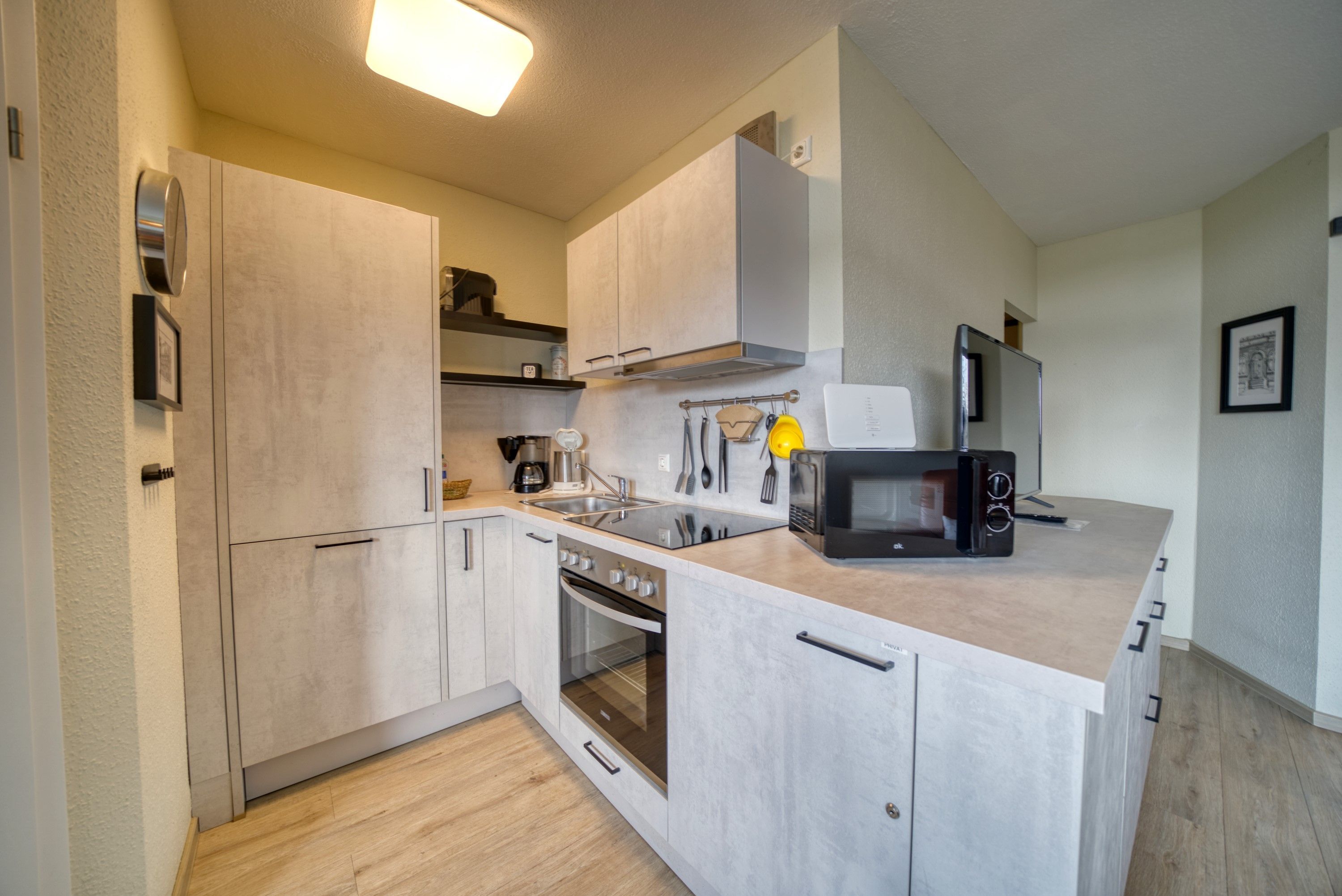Moderne Küche mit Ceranherd, Backofen, Mikrowelle, Kühlschrank mit Gefrierfach, Geschirrspüler, Wasserkocher und Toaster