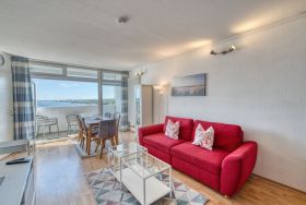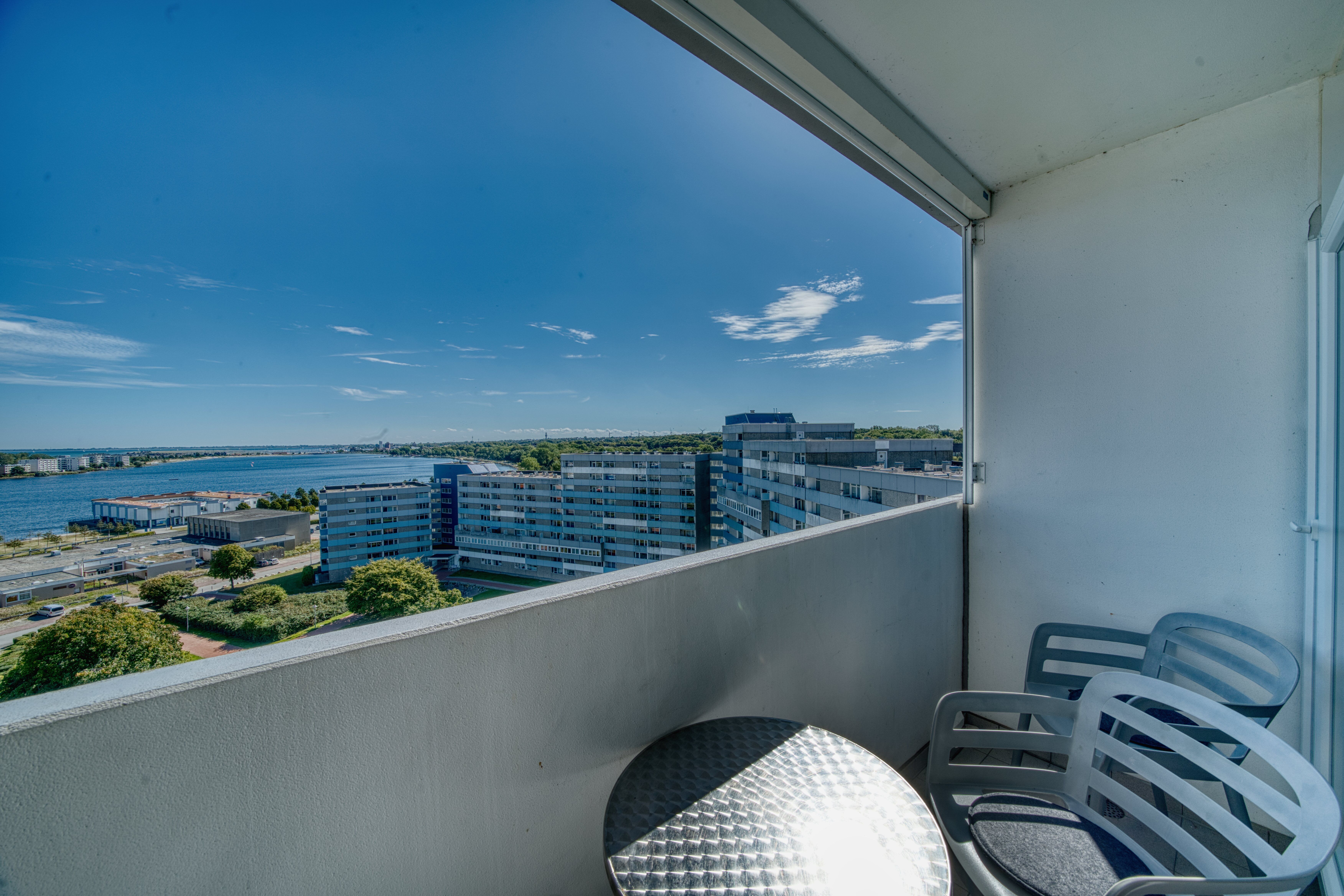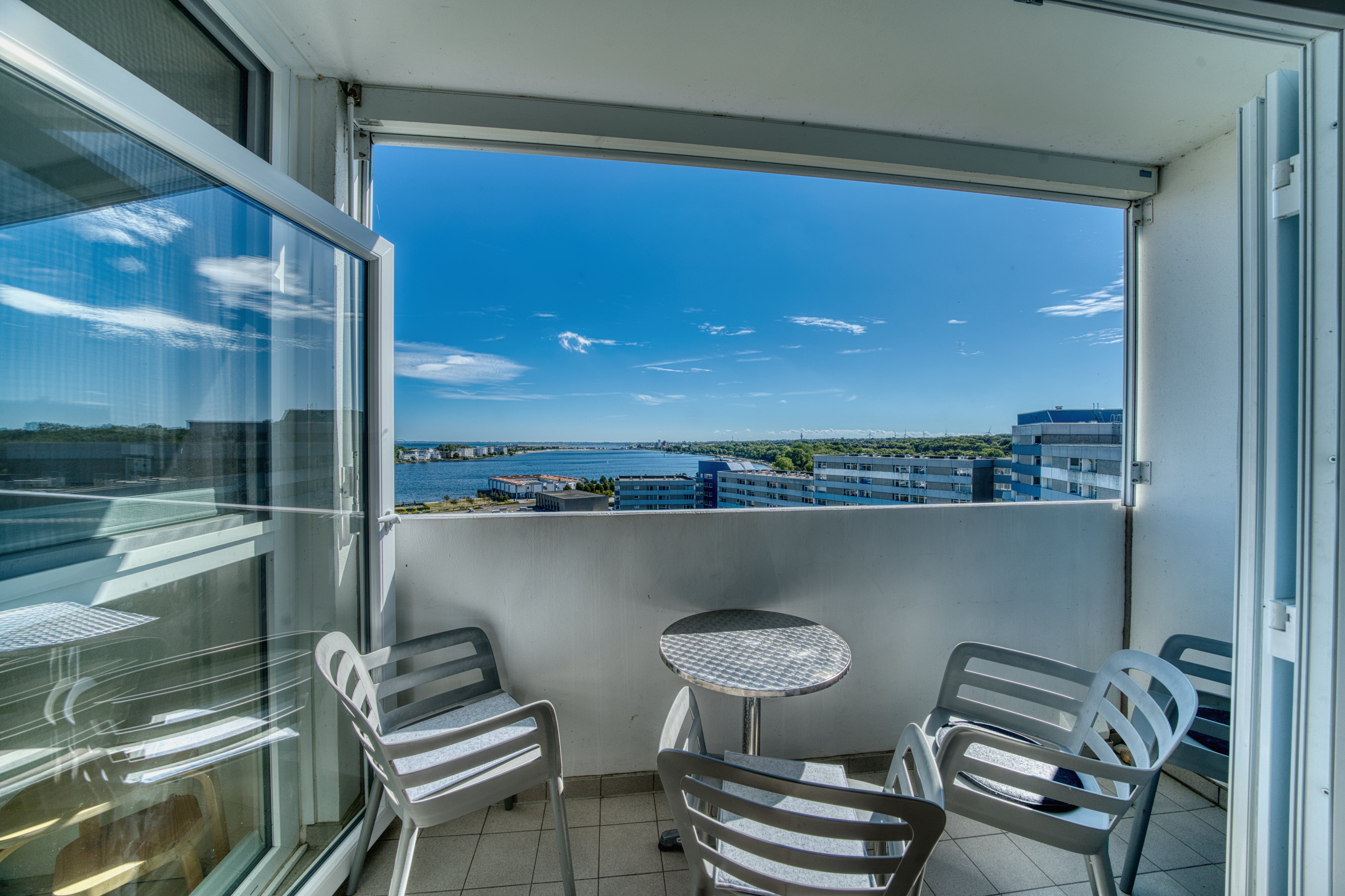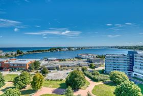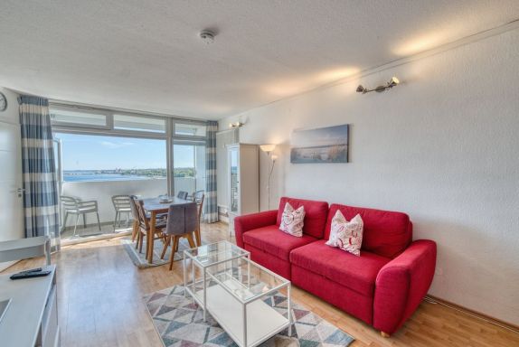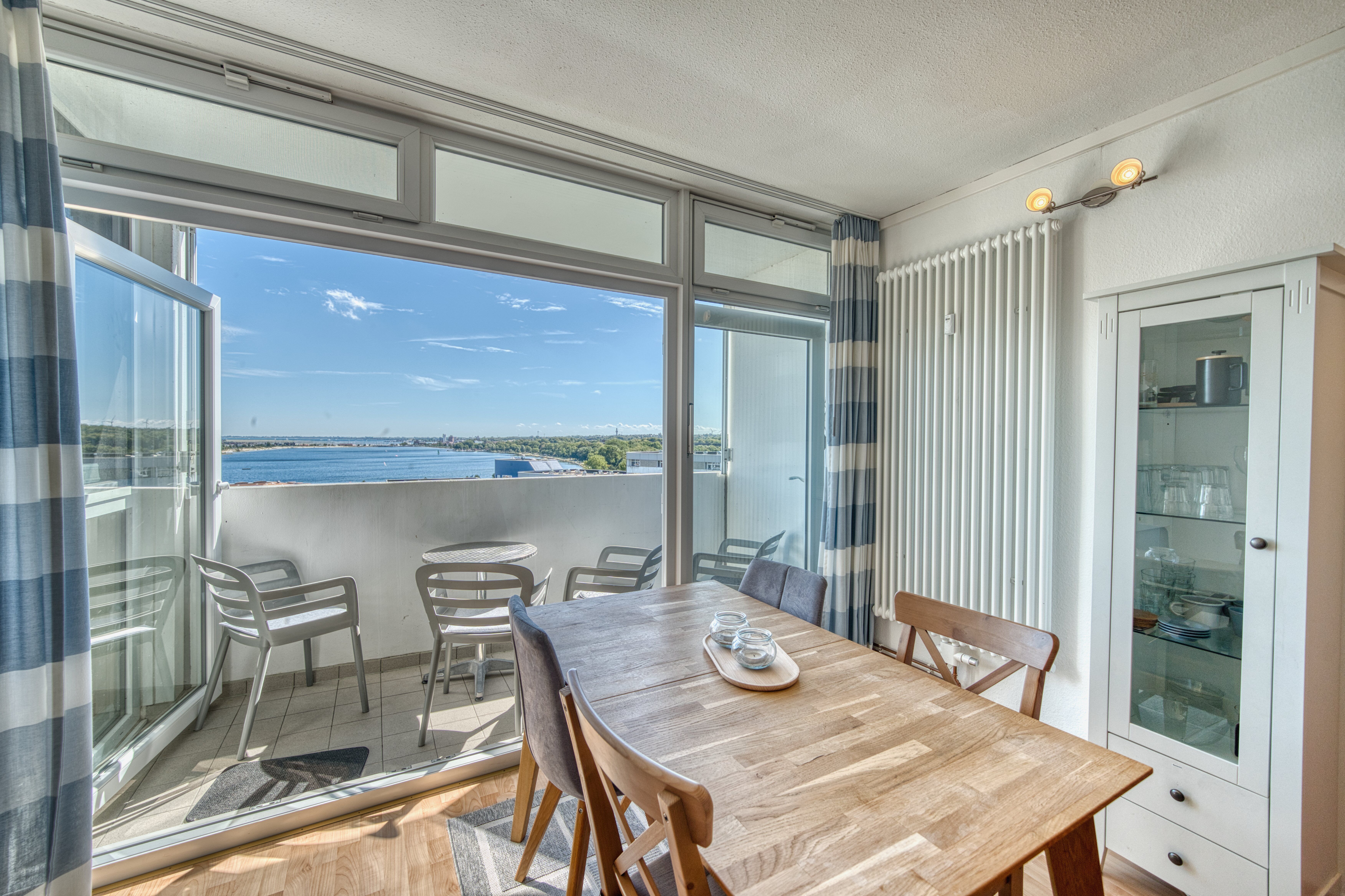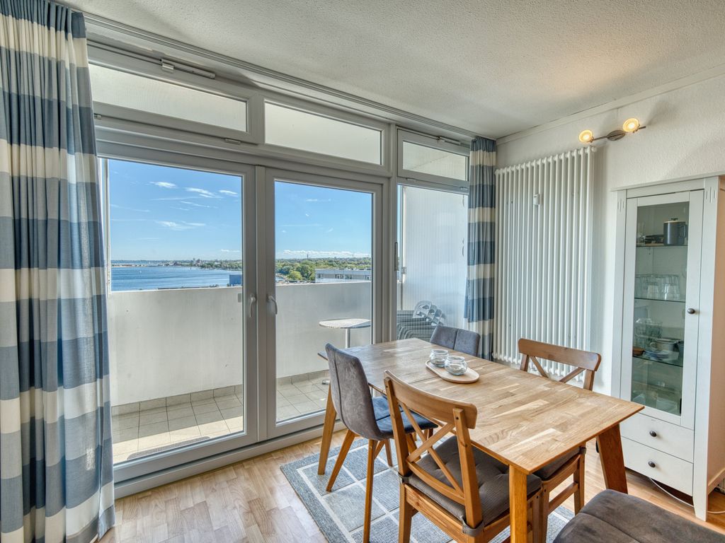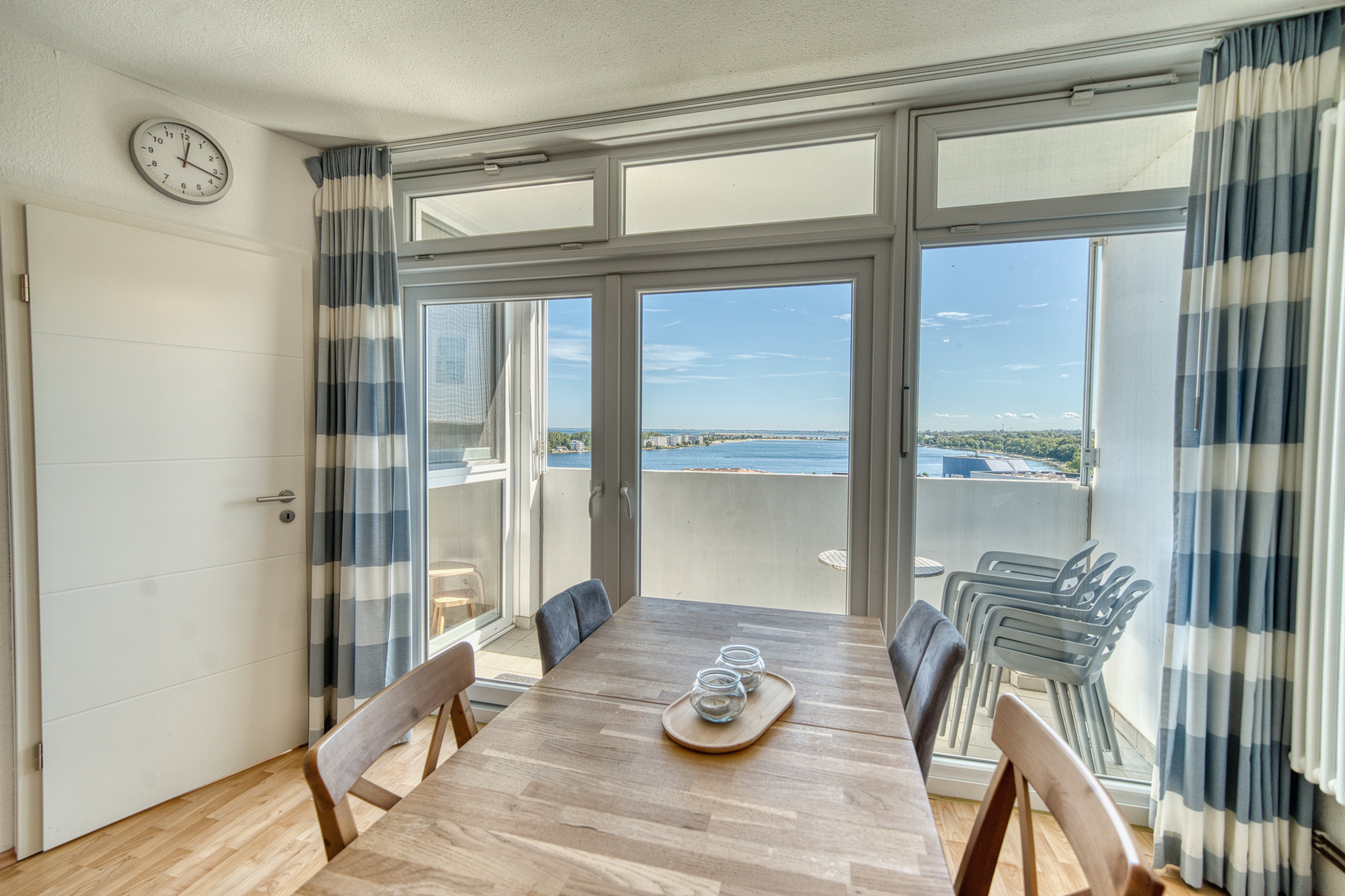Die Wohnung liegt im Ferienpark, Haus H, in der 11. Etage, mit Balkon zur Ostseite, der einen herrlichen Blick auf die Ostsee mit Fehmarnsundbrücke und den Binnensee mit Stadt und Yachthafen bietet.