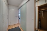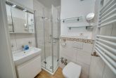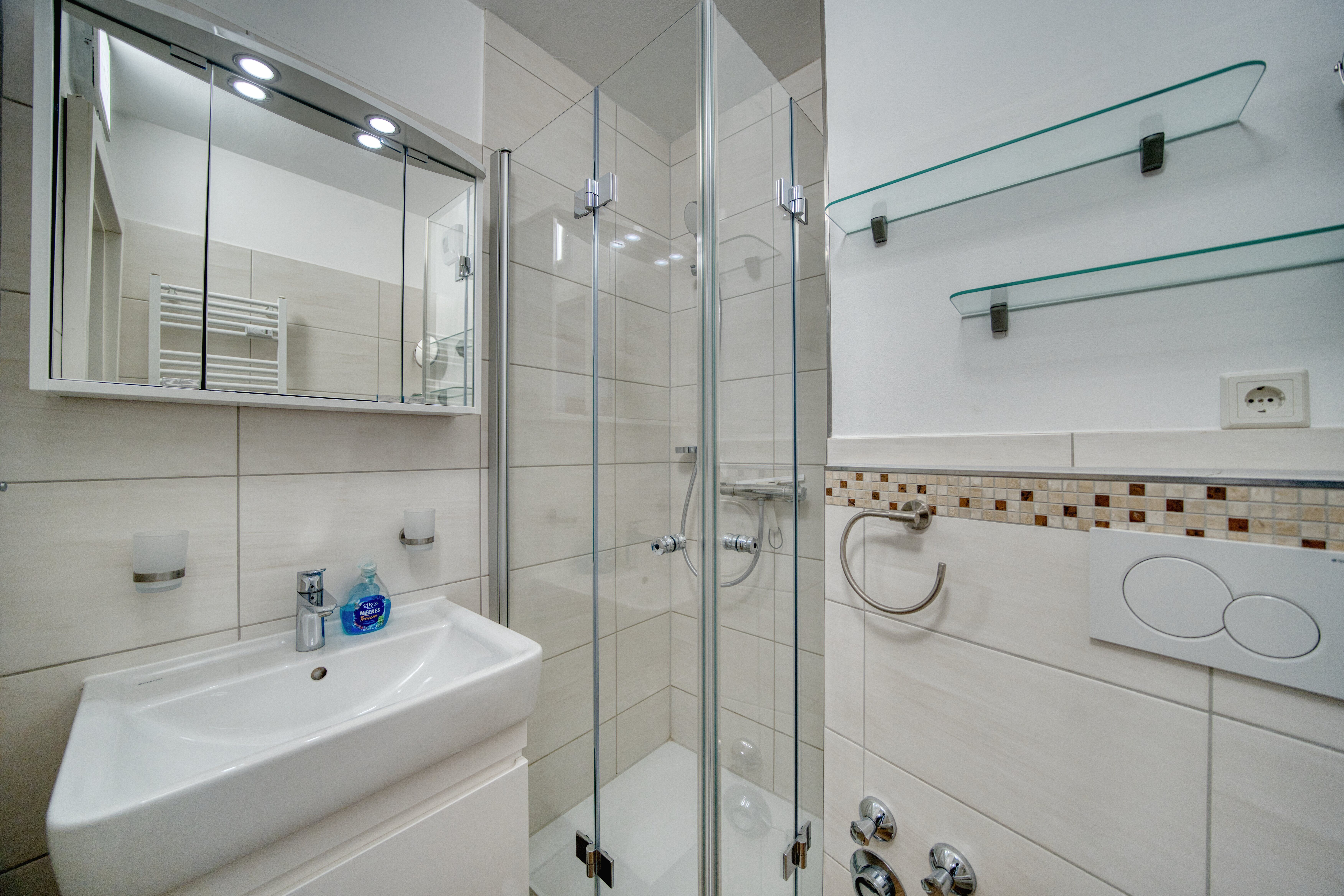Das Bad ist aufwendig saniert. Eine moderne Dusche mit niedrigem Einstieg, Glastrennwand, Thermostatarmatur, Waschtisch mit Unterschrank, Spiegelschrank, div Ablageflächen und ausreichend Steckdosen laden ein.