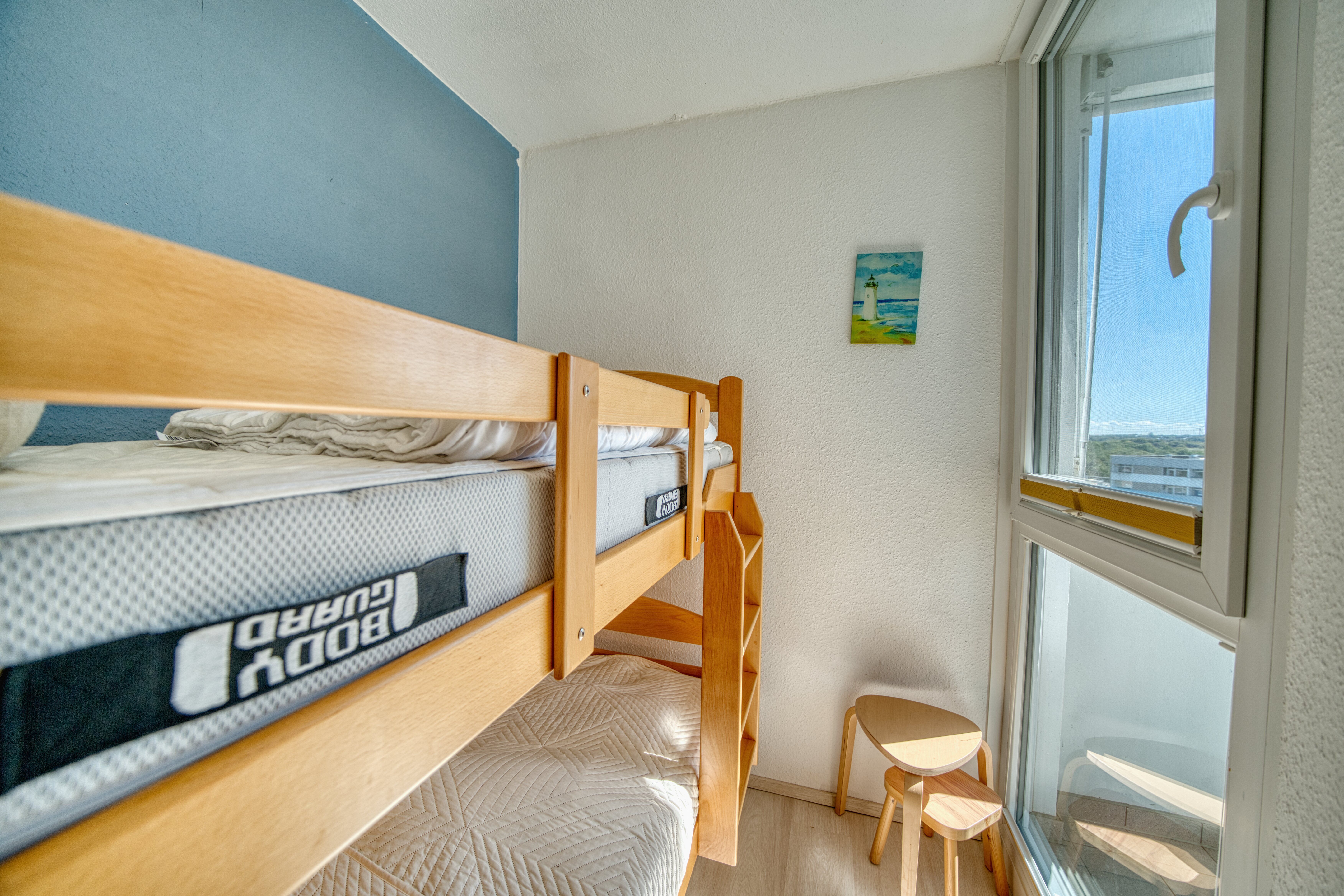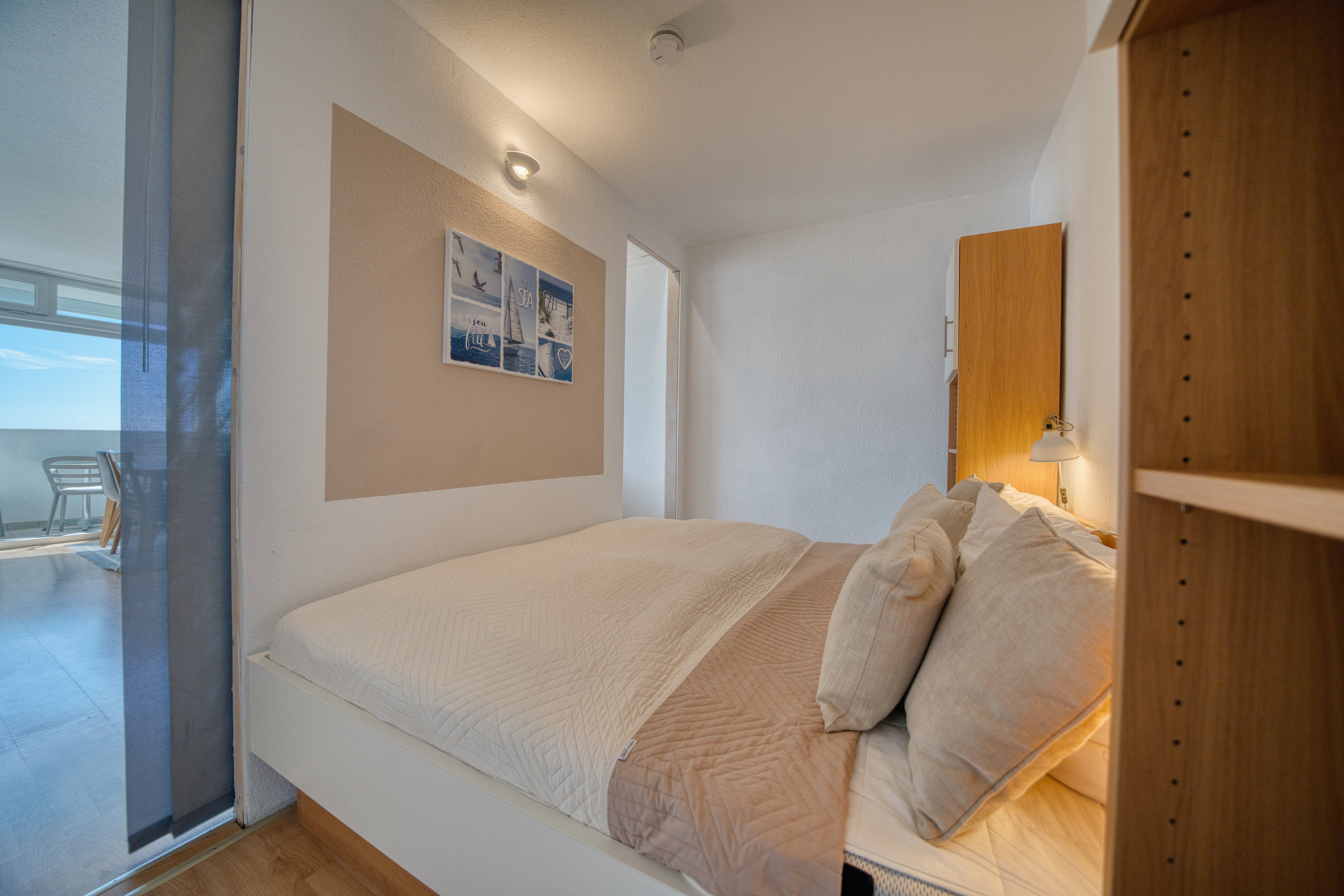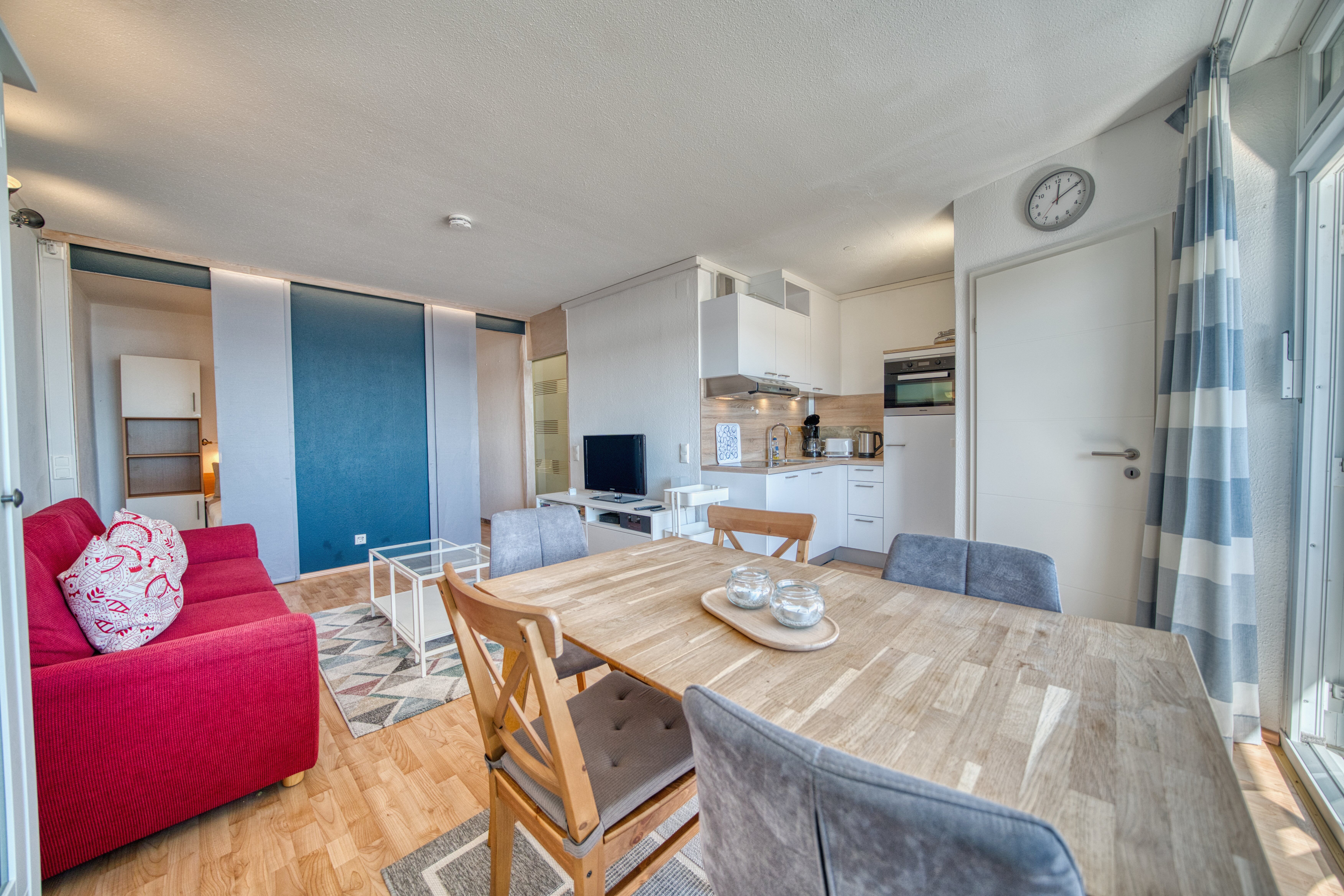 Die gemütliche Ferienwohnung besteht aus einem kombinierten Wohn-Esszimmer mit Küchenbereich, Schlafzimmer mit Doppelbett, Kinderzimmer, Duschbad und einem Balkon und befindet sich in der 11. Etage des sanierten Blocks H im Ferienpark Heiligenhafen.