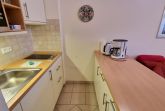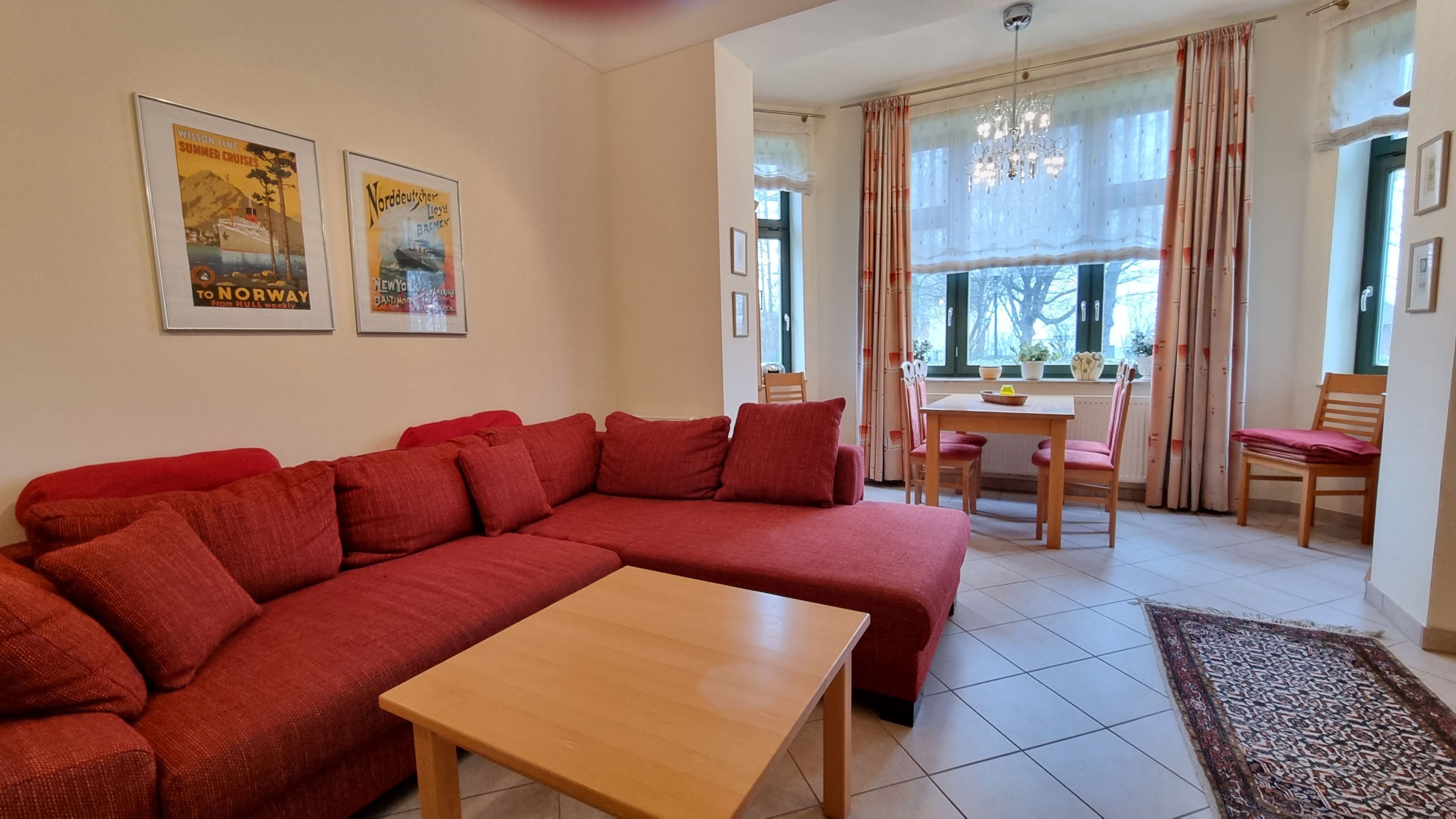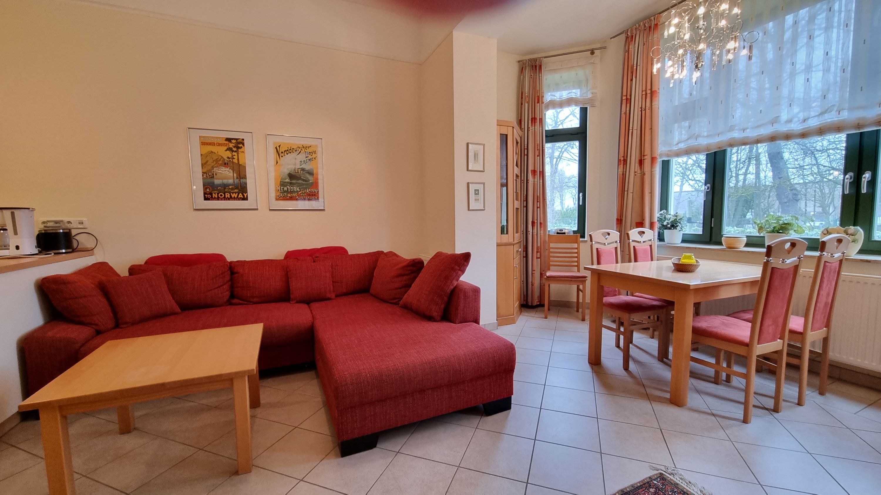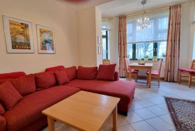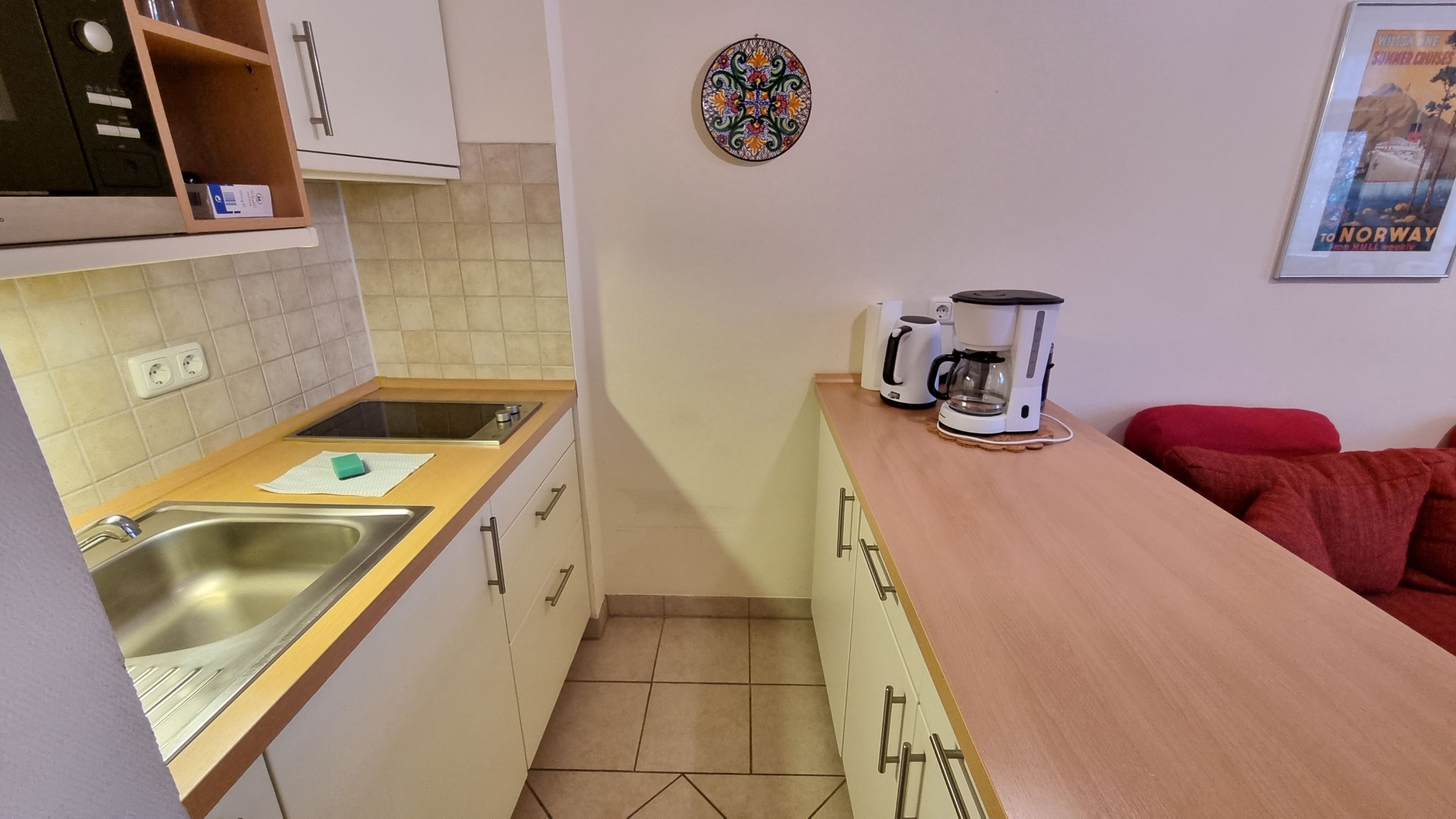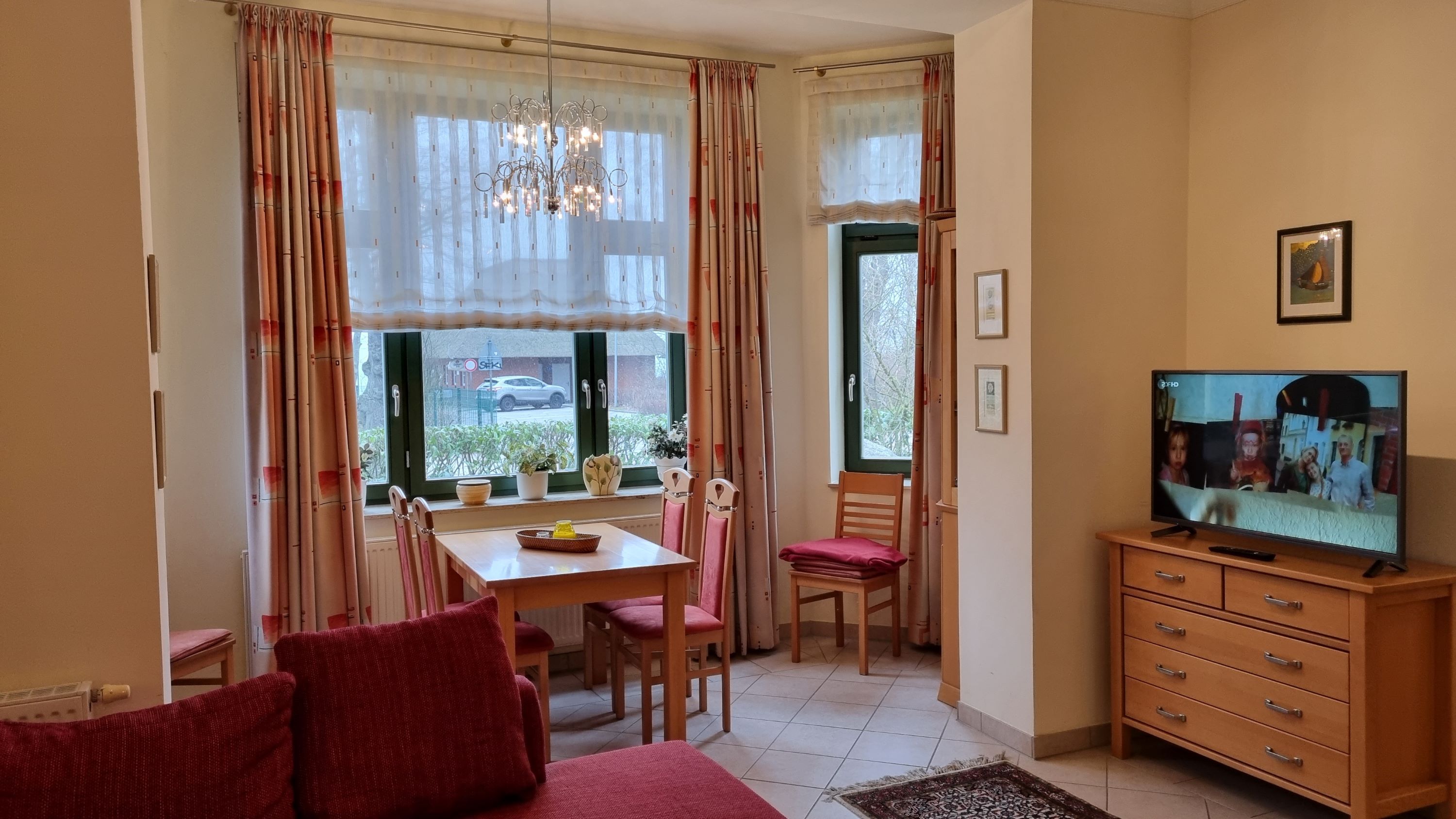 Der Wohnraum ist mit einer großzügigen Eckcouch mit Schlaffunktion ausgestattet. Zur modernen Einrichtung gehört ein Farb-TV. Der Küchenbereich ist durch einen Tresen vom Wohnraum getrennt.
