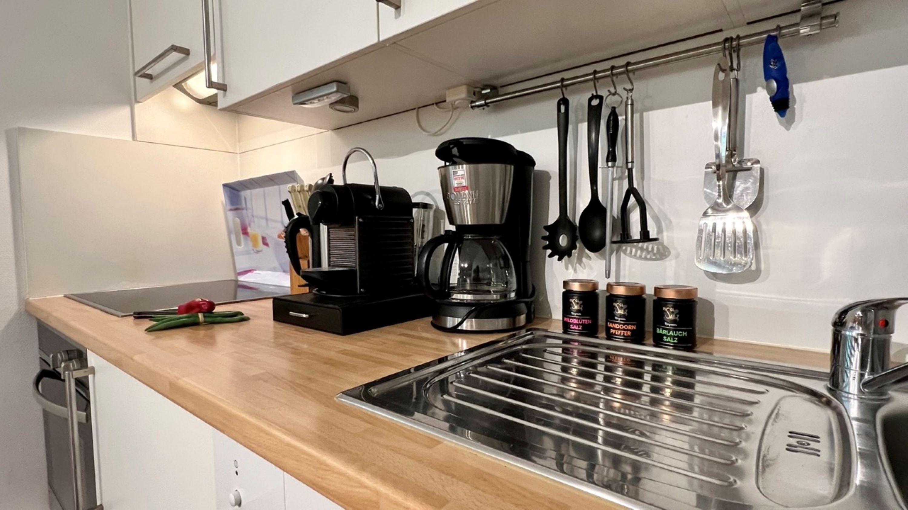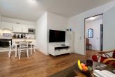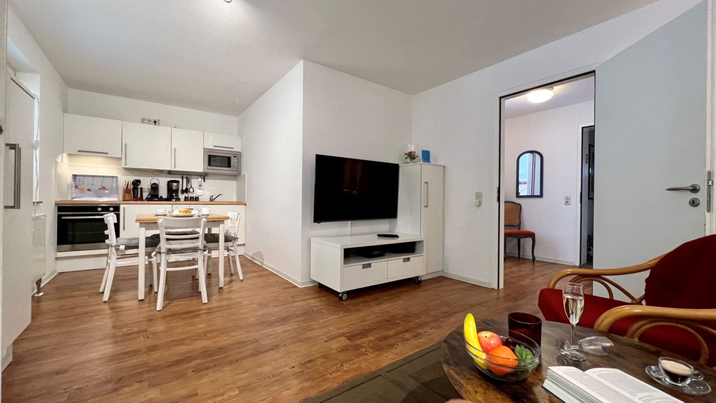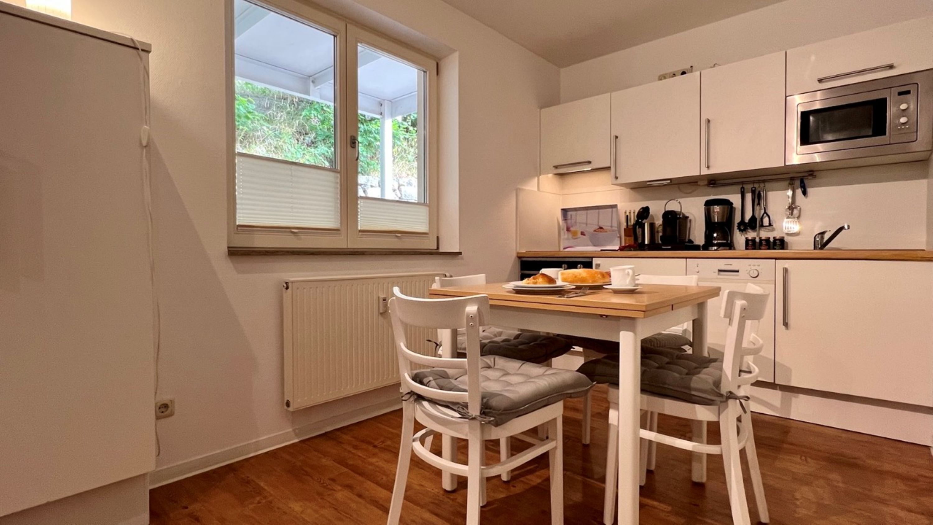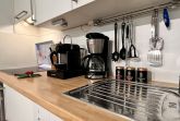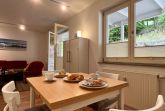 Die moderne Küche ist mit allem ausgestattet, was es für einen kulinarischen Kochabend benötigt: ein Ceranfeld, ein Backofen inkl. Abzugshaube, Mikrowelle, Geschirrspülmaschine und allerlei Küchenkleingeräte (Wasserkocher, Kaffeekapselmaschine...). Besteck, Geschirr und andere Küchenutensilien sind selbstverständlich ebenso vorhanden. Direkt anschließend finden Sie im kleinen Essbereich die Möglichkeit, bei einem gemütlichen Abendessen den Urlaubstag ausklingen zu lassen.