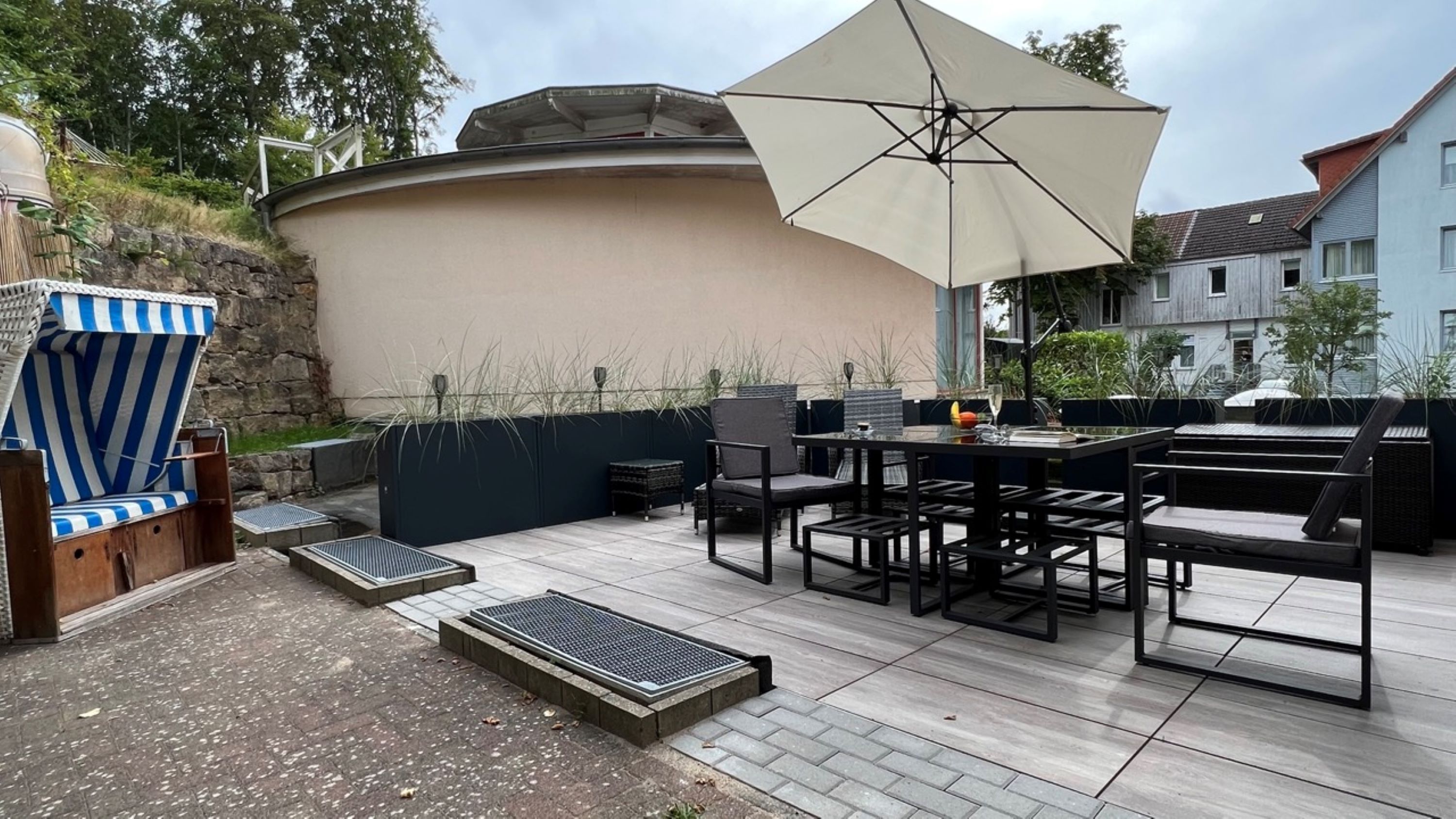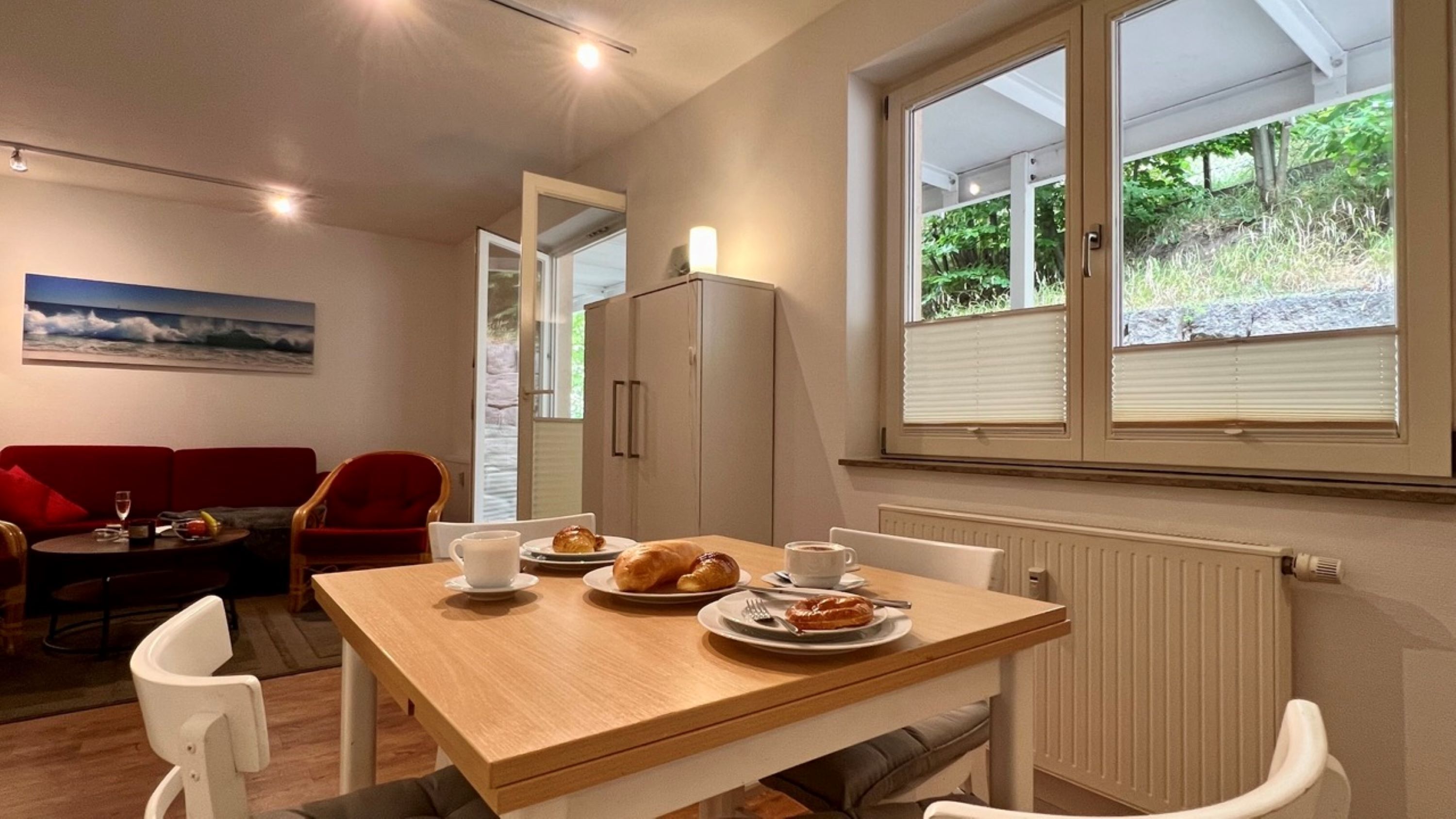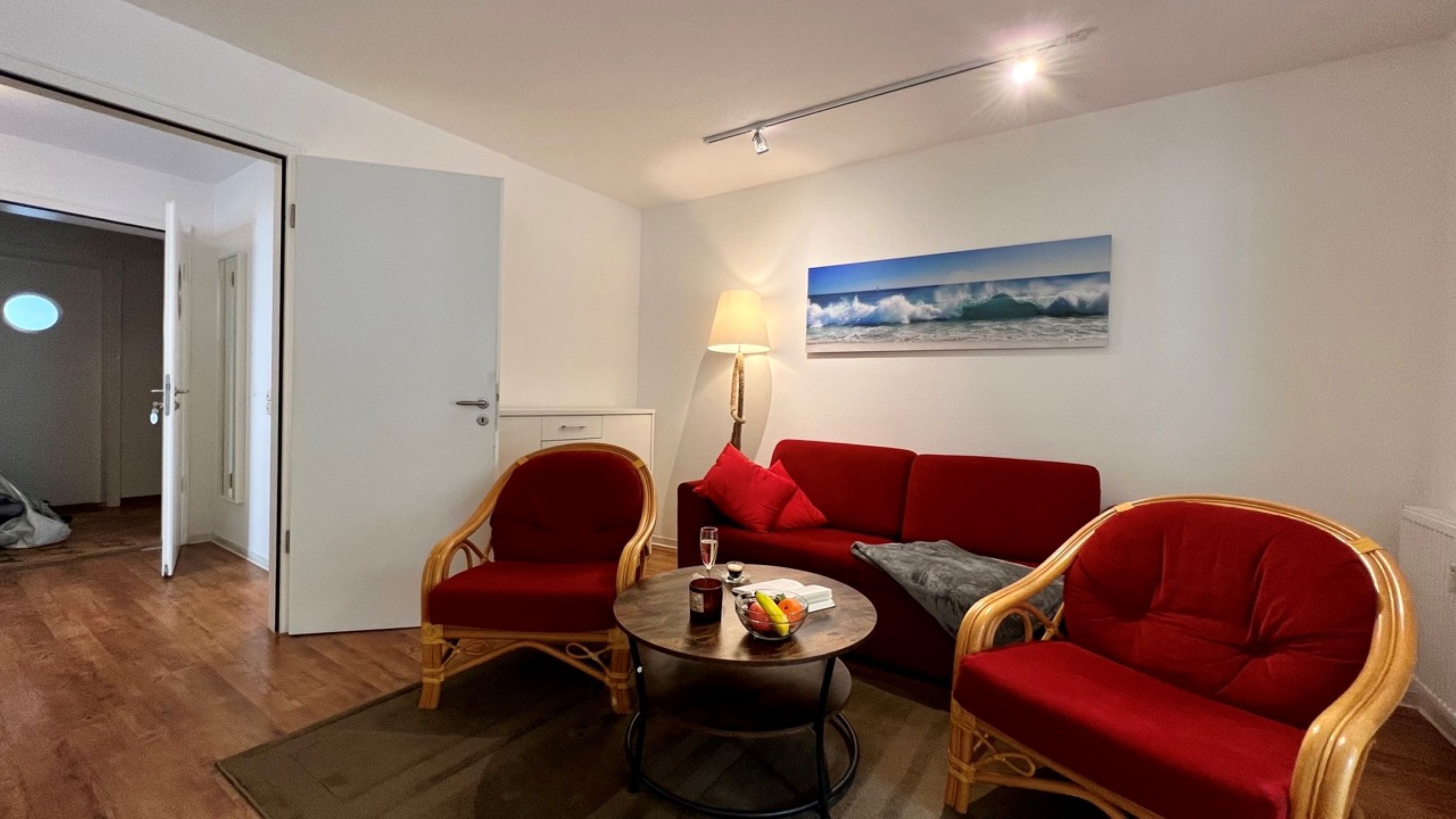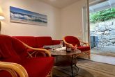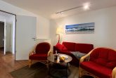 Über den freundlichen Flurbereich erreichen Sie das helle Wohnzimmer - hier erwartet Sie neben dem Flachbild-TV und den beiden bequemen Sesseln eine komfortable Couchgarnitur, welche ebenso als Aufbettungsmöglichkeit für 2 weitere Personen genutzt werden kann. Von hier aus erreichen Sie die sonnige Terrasse mit Gartenmöbeln (inkl. Auflagen) und einem eigenen Strandkorb. Direkt um die Ecke finden Sie eine weitere, gerade neu angelegte Sonnenterrasse!