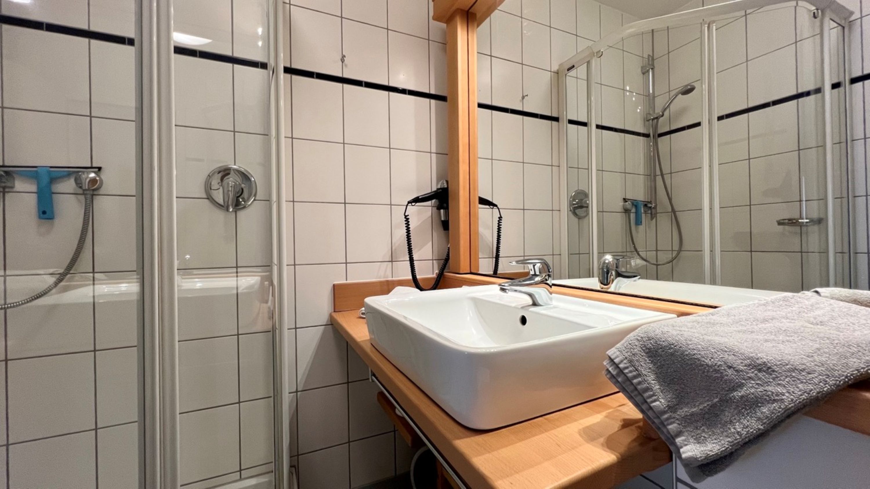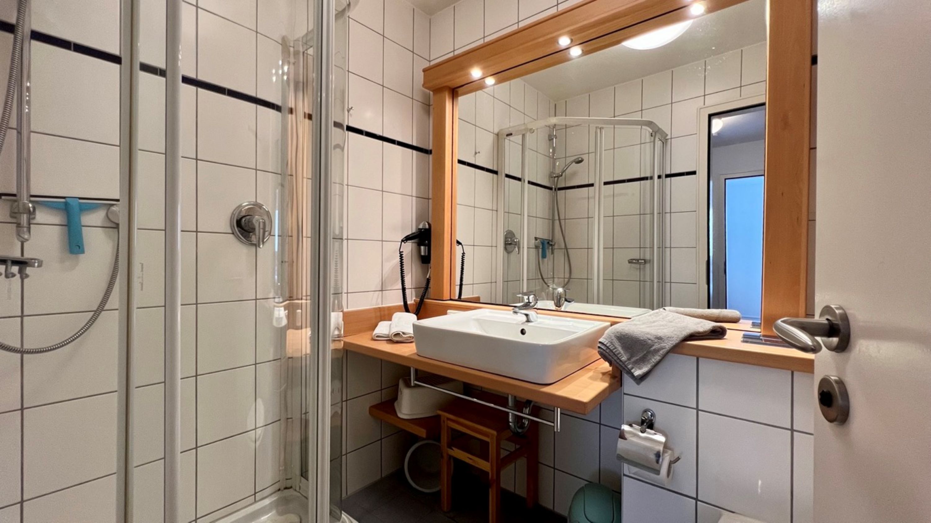 Das hell erleuchtete Bad bieten Ihnen eine Dusche, ein WC und einen Waschtisch mit Waschbecken und Spiegel.