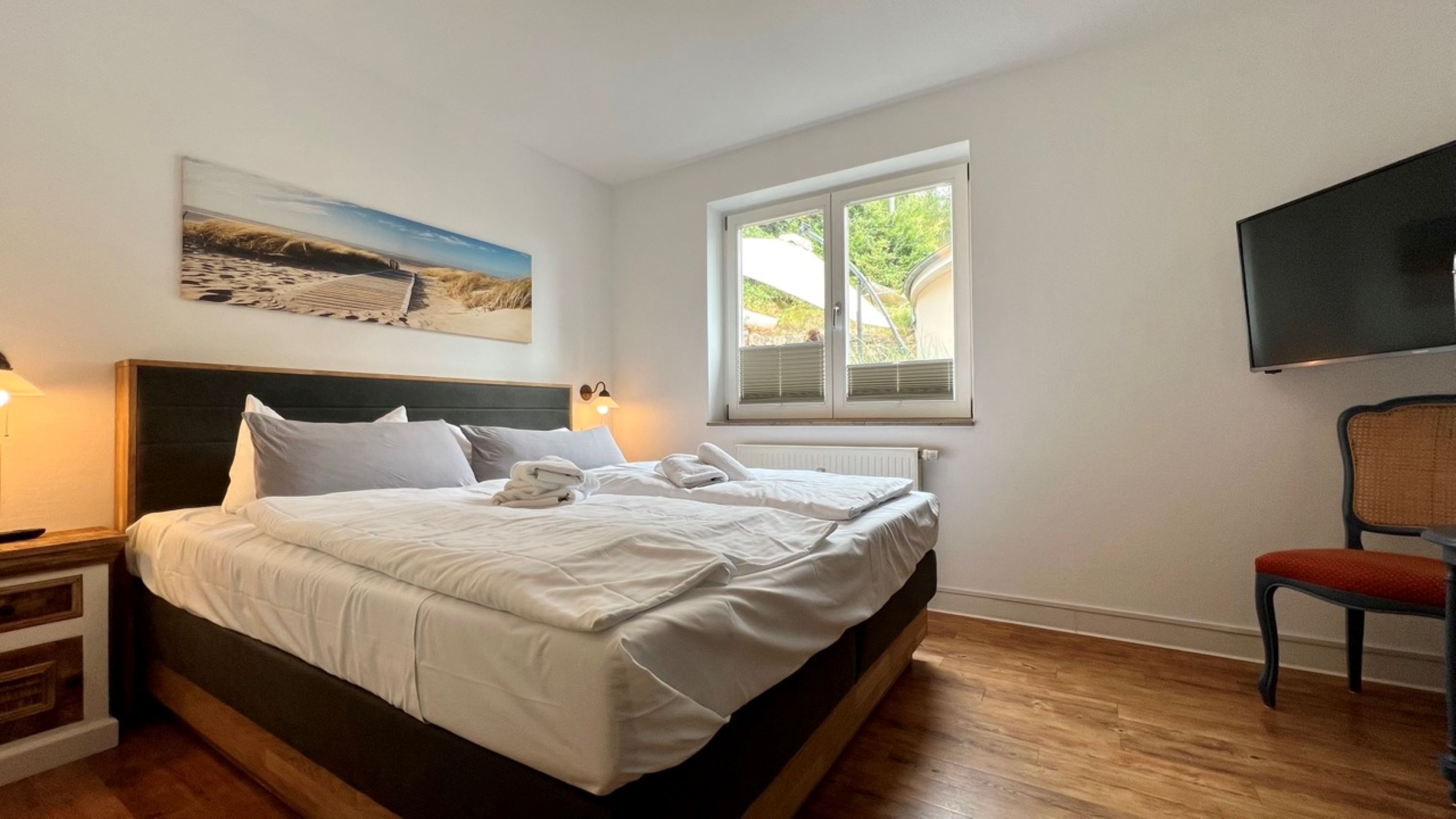 Die freundliche Wohnung 2 in der Villa Sonneck sorgt durch einen separaten Schlafbereich mit einem großen Kleiderschrank und TV für erholsame Schlafstunden.