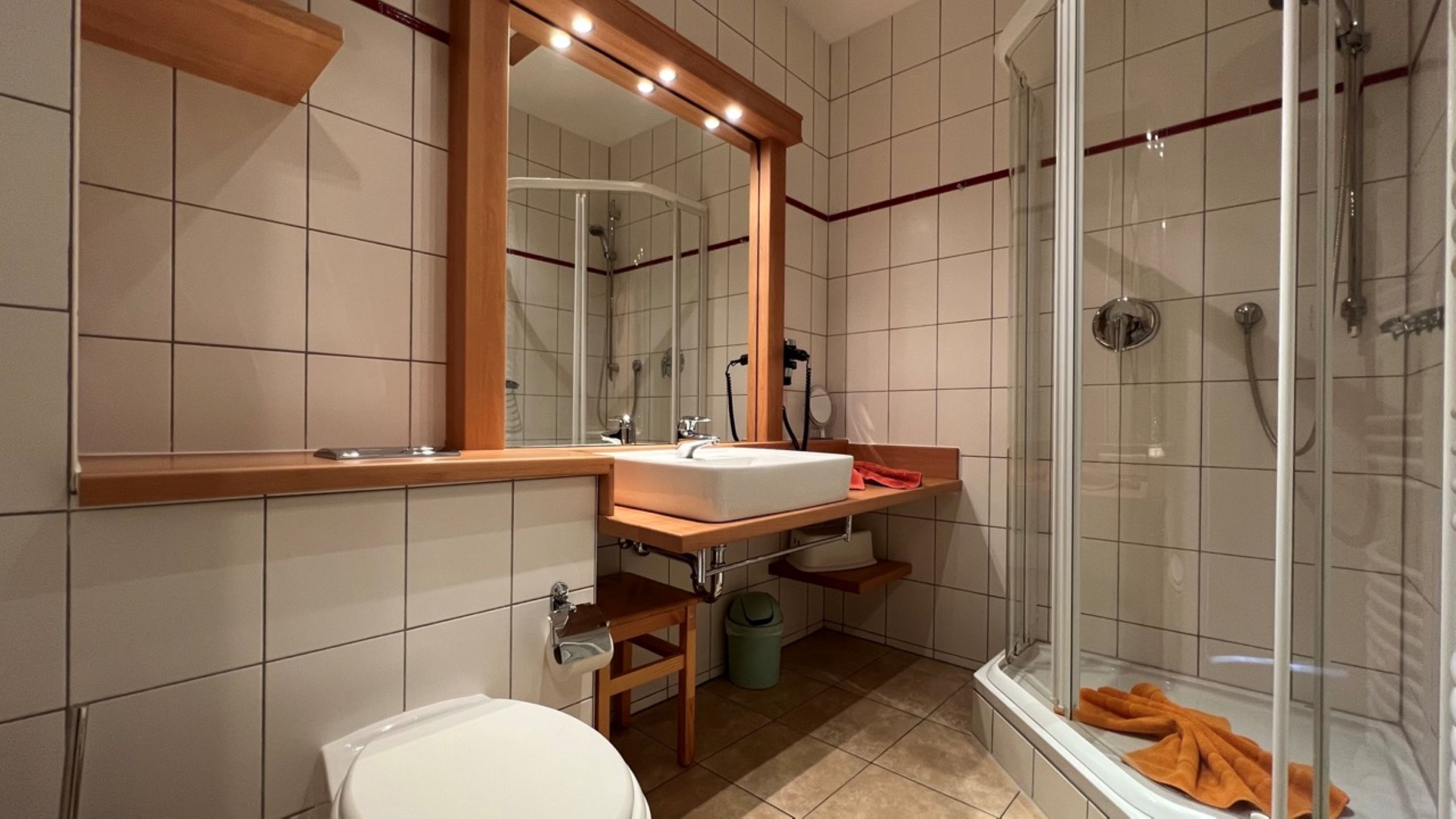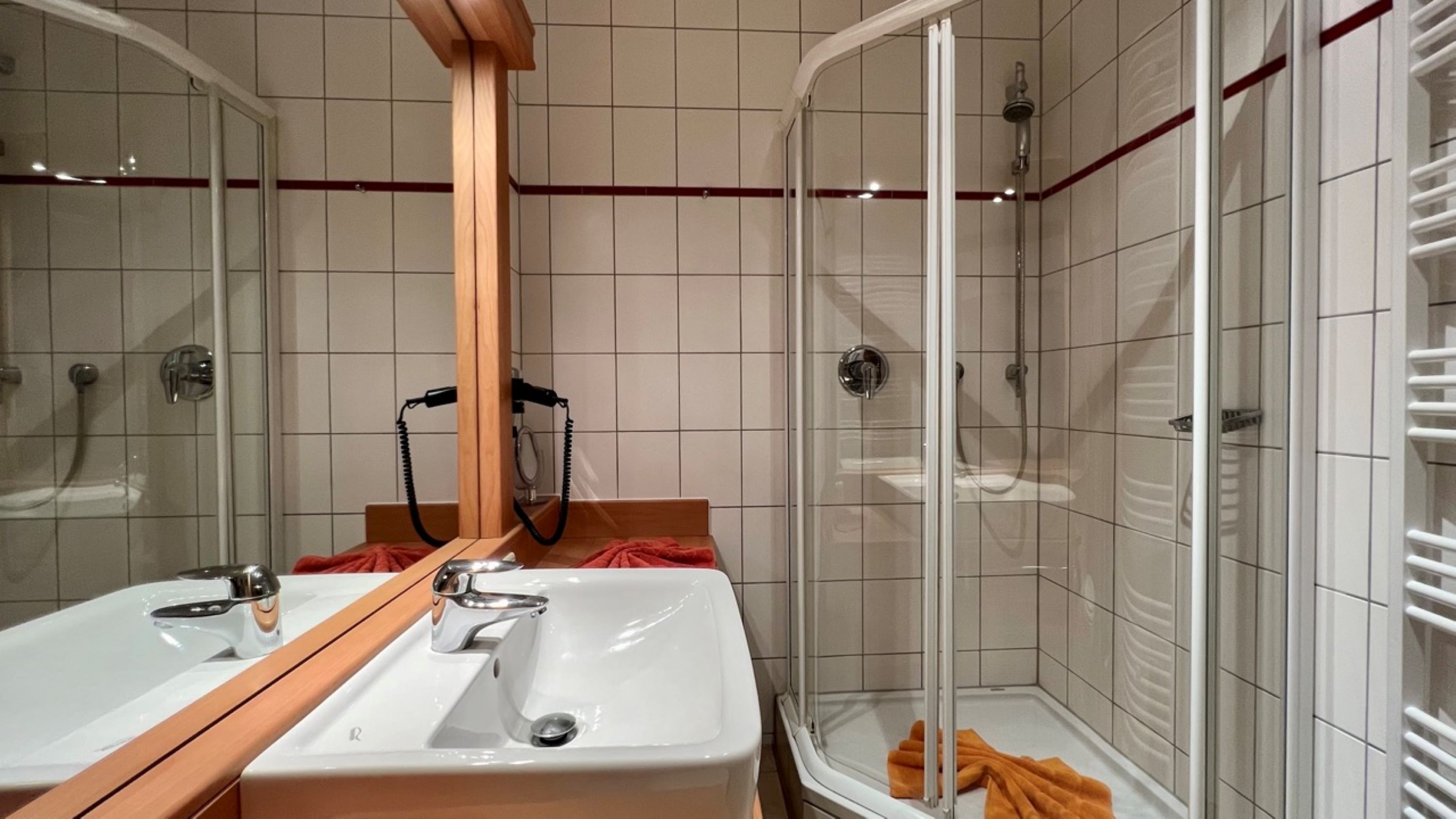 Die beiden Bäder bieten Ihnen jeweils eine Dusche, ein WC und einen Waschtisch mit Waschbecken und Spiegel.