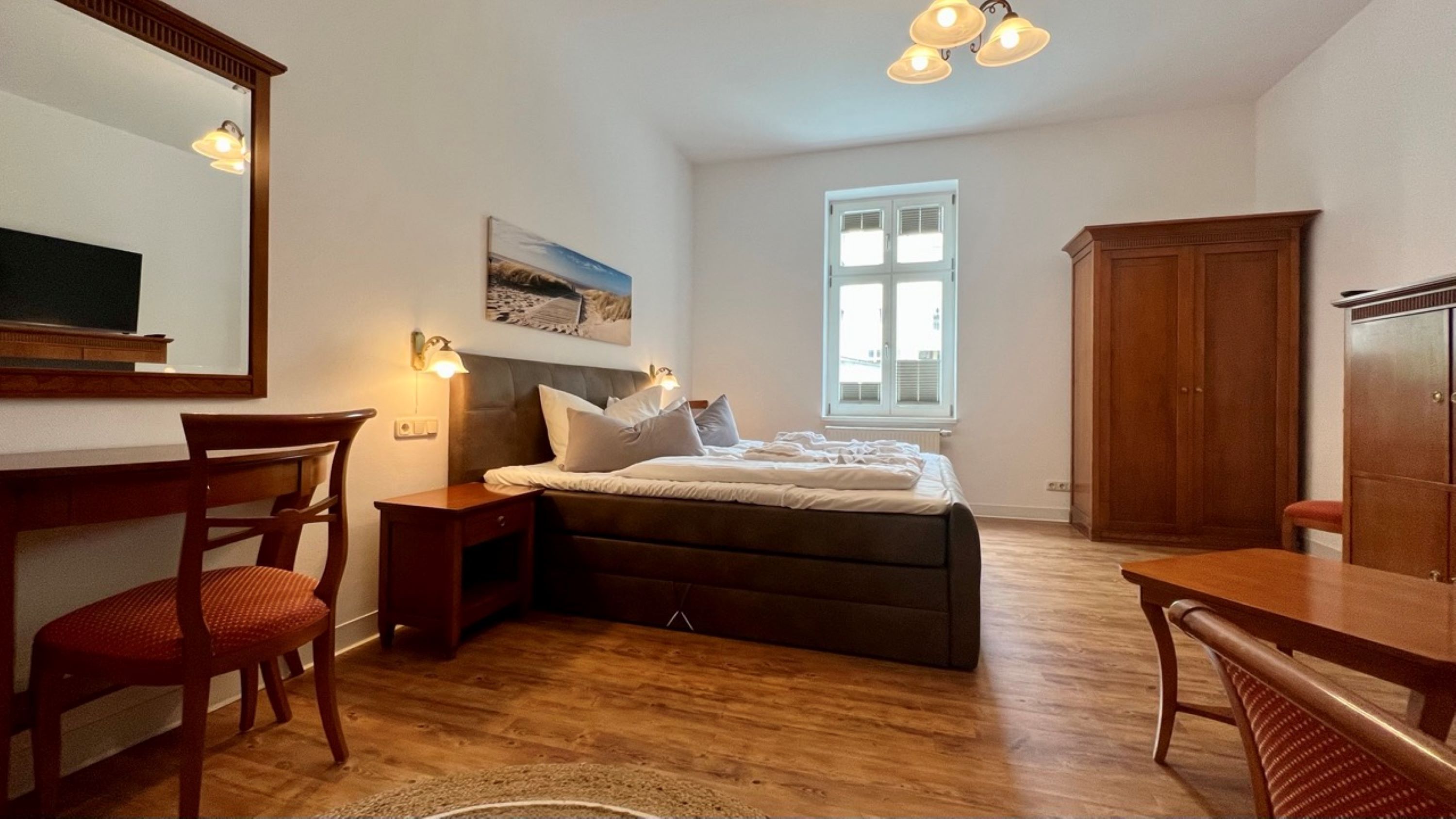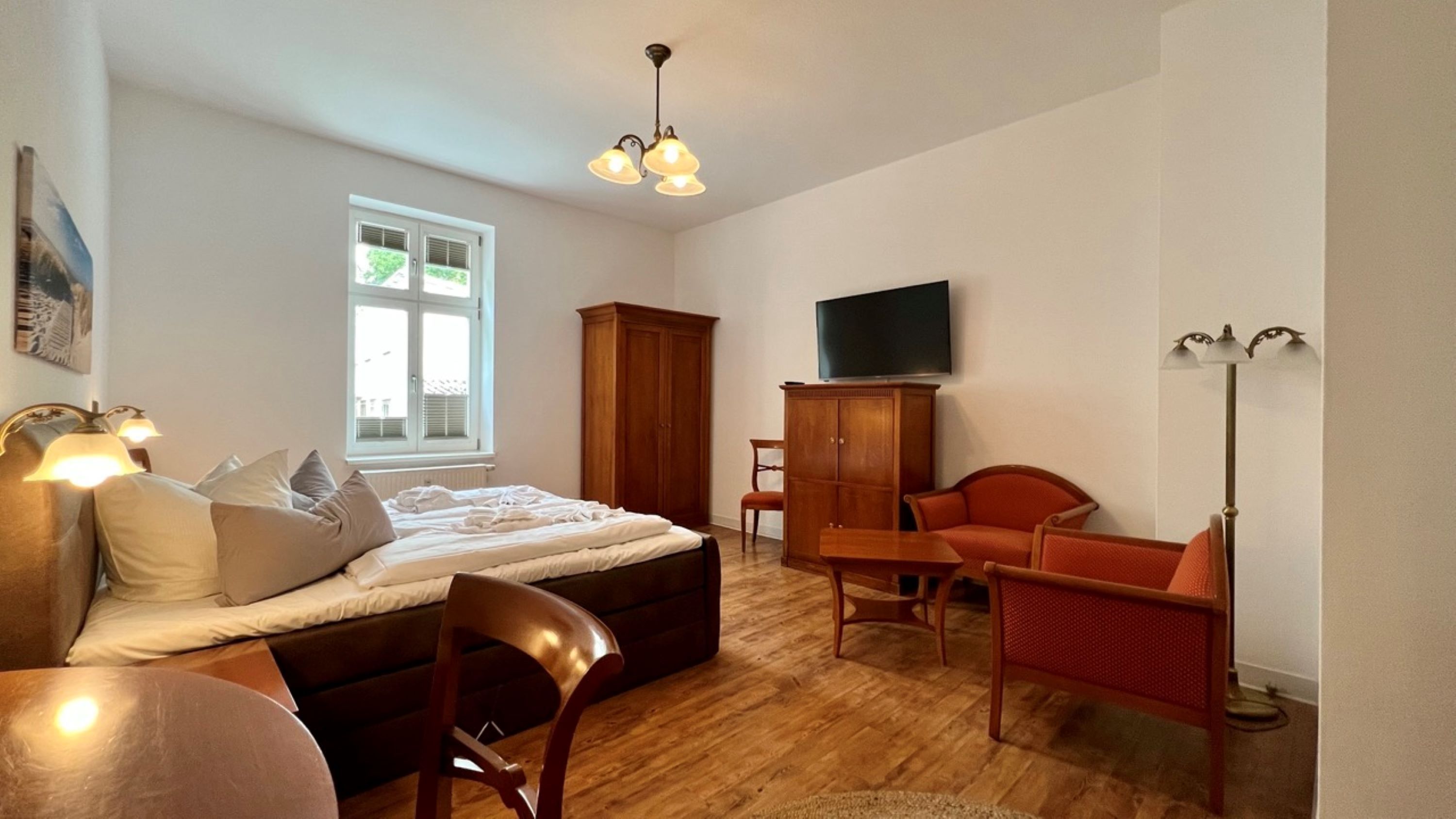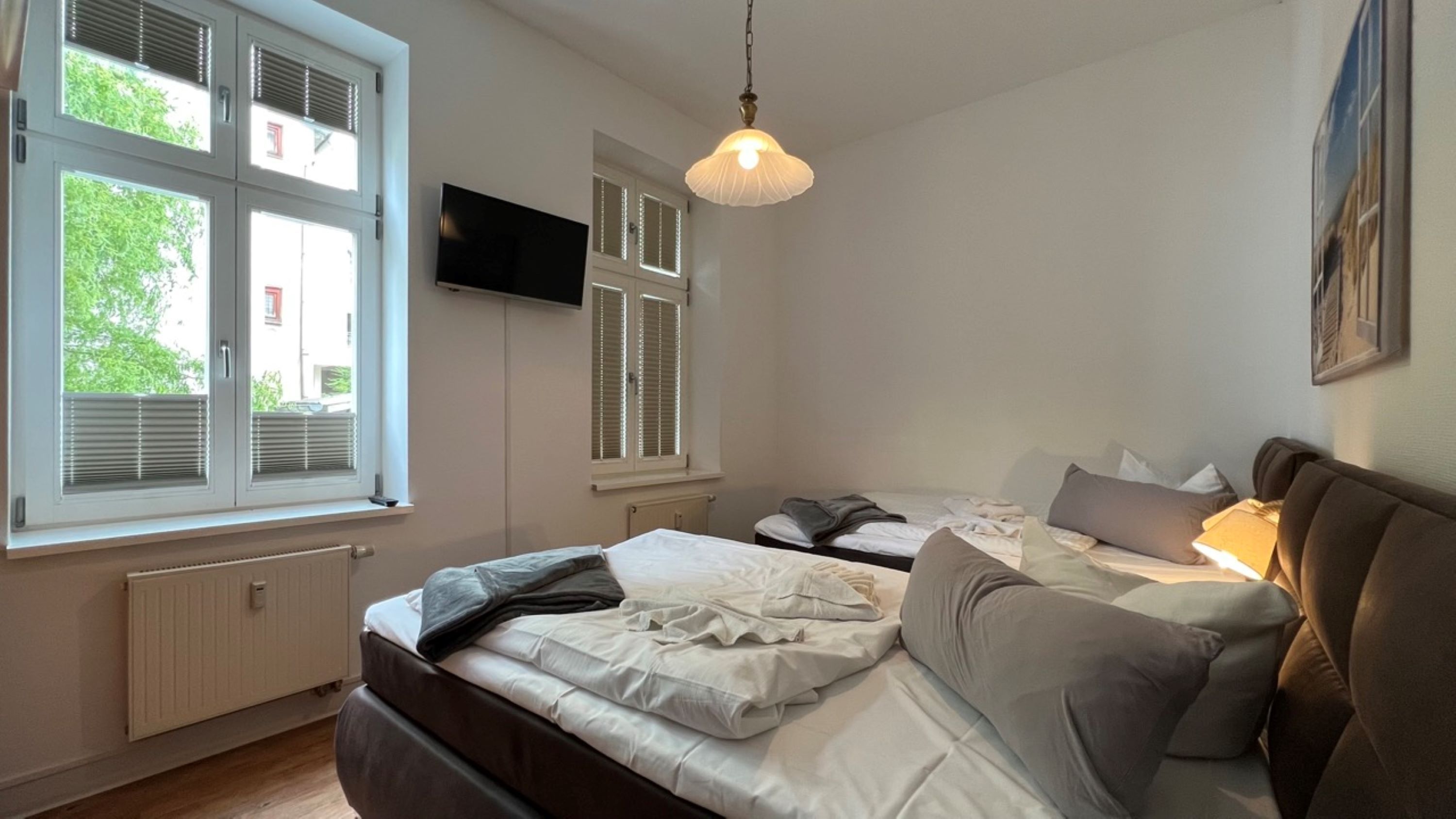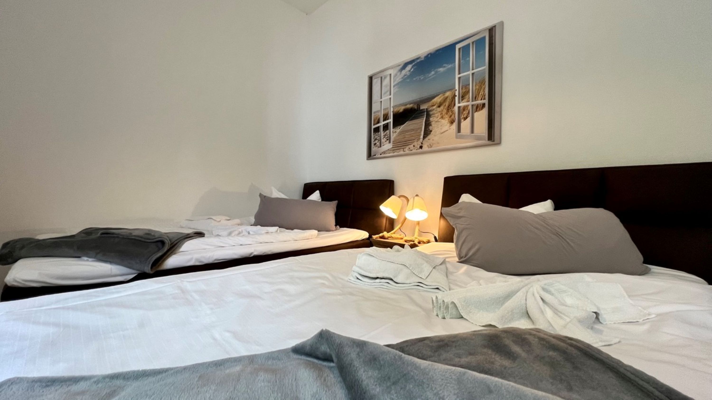 Die Wohnung 7 in der Villa Sonneck sorgt durch die zwei separaten Schlafbereiche für genügend Privatsphäre im Familienurlaub. Eines der beiden Schlafzimmer ist mit einem Doppelbett, einem TV und einem großzügigen Kleiderschrank ausgestattet, der zweite Schlafbereich bietet 2 Einzelbetten.