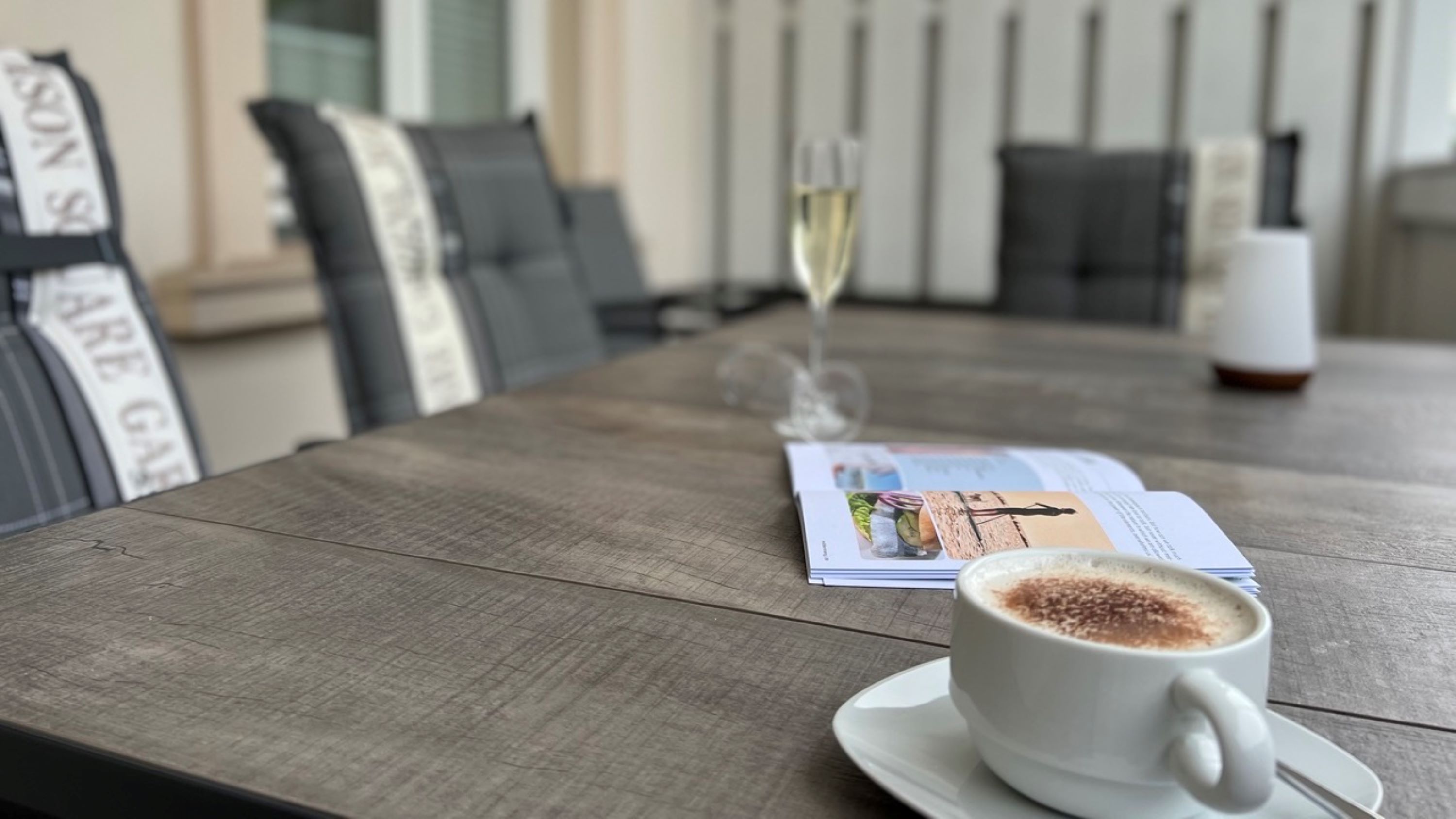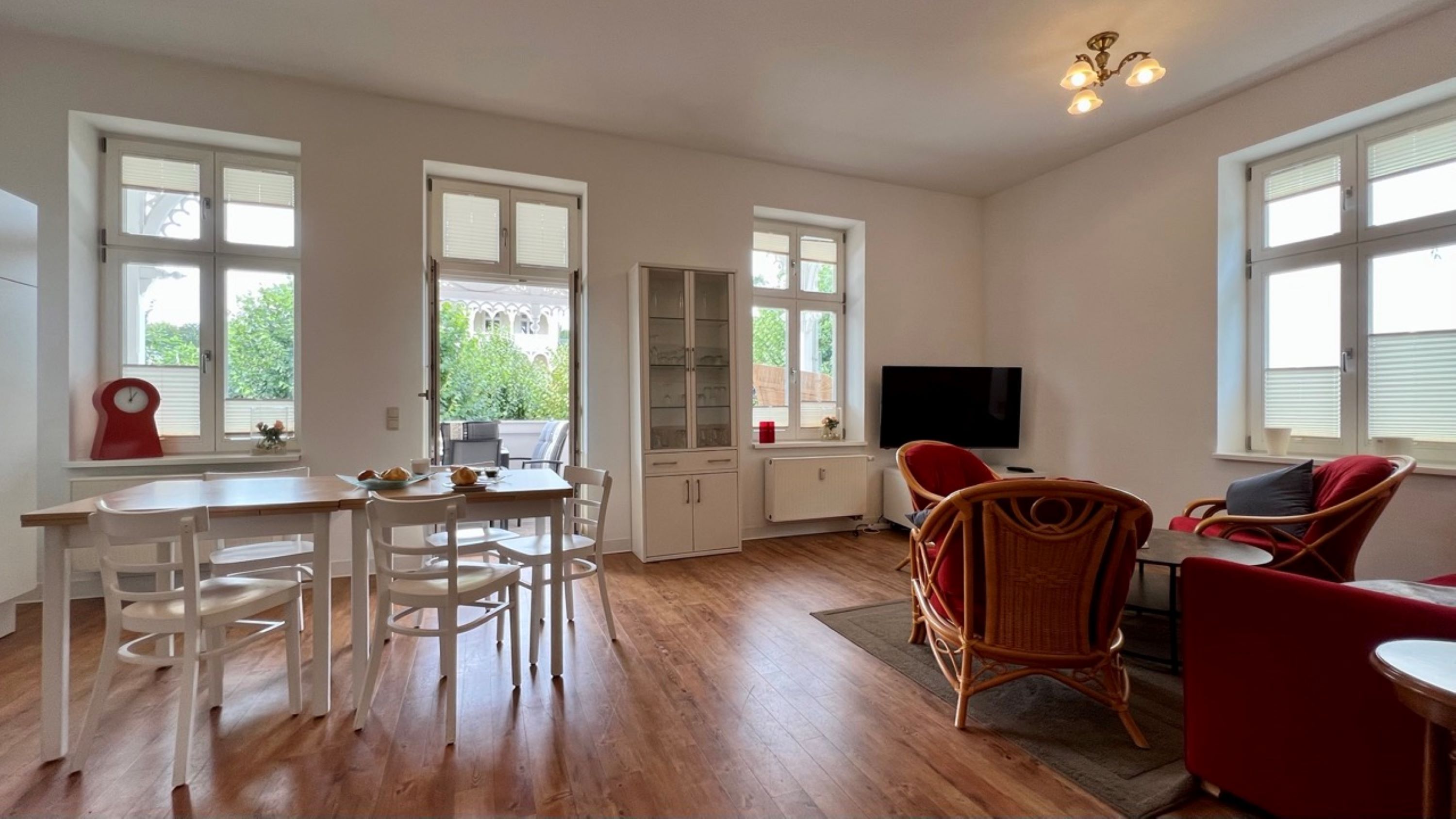 Über den freundlichen Flurbereich erreichen Sie das helle Wohnzimmer - hier erwartet Sie neben dem Flachbild-TV und den beiden bequemen Sesseln eine komfortable Couchgarnitur, welche ebenso als Aufbettungsmöglichkeit für 2 weitere Personen genutzt werden kann. Von hier aus erreichen Sie den sonnigen Balkon mit Gartenmöbeln (inkl. Auflagen) und einem eigenen Strandkorb.