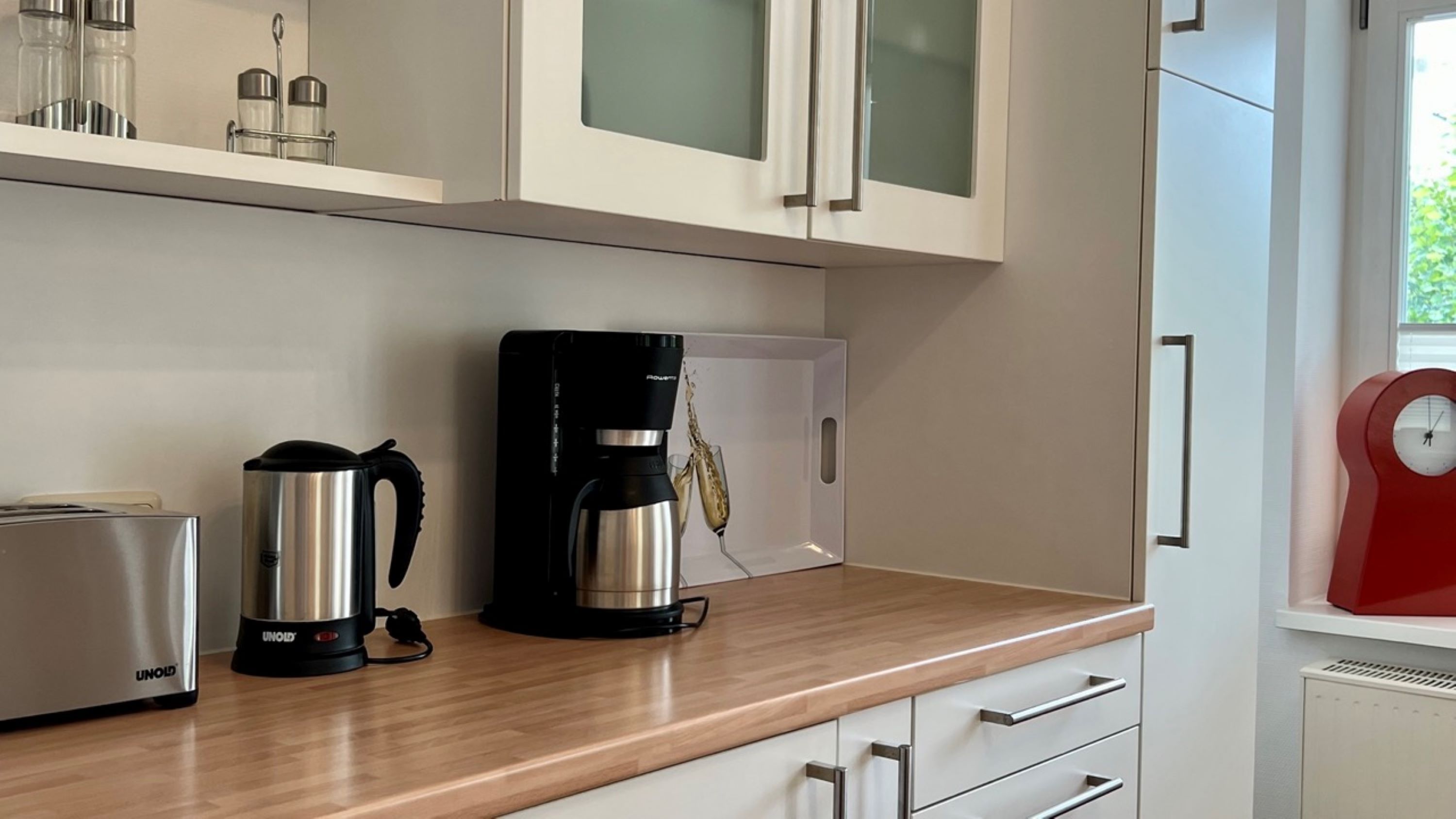 Die moderne Küche ist mit allem ausgestattet, was es für einen kulinarischen Kochabend benötigt: ein Ceranfeld, ein Backofen inkl. Abzugshaube, Mikrowelle, Geschirrspülmaschine und allerlei Küchenkleingeräte (Wasserkocher, Kaffeemaschine...). Besteck, Geschirr und andere Küchenutensilien sind selbstverständlich ebenso vorhanden. Direkt anschließend finden Sie im hellen Essbereich die Möglichkeit, bei einem gemütlichen Abendessen den Urlaubstag ausklingen zu lassen.