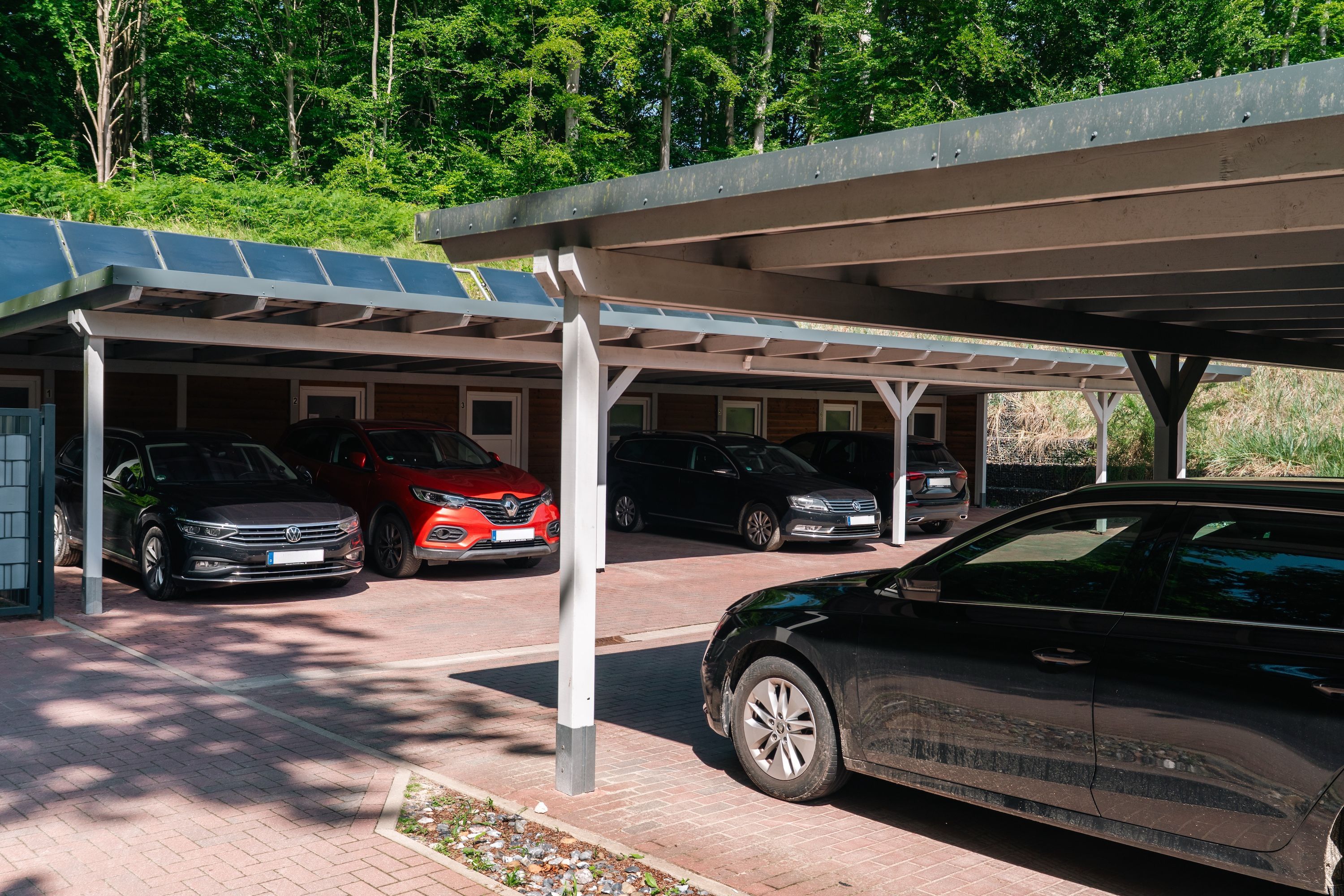 Für Fahrradfahrer und Familien gibt es eine praktische, abschließbare Unterstellmöglichkeit direkt am Carport perfekt auch für Kinderwagen. Besonders innovativ: Direkt vor dem Haus laden Sie Ihr E-Bike bequem und sicher auf.