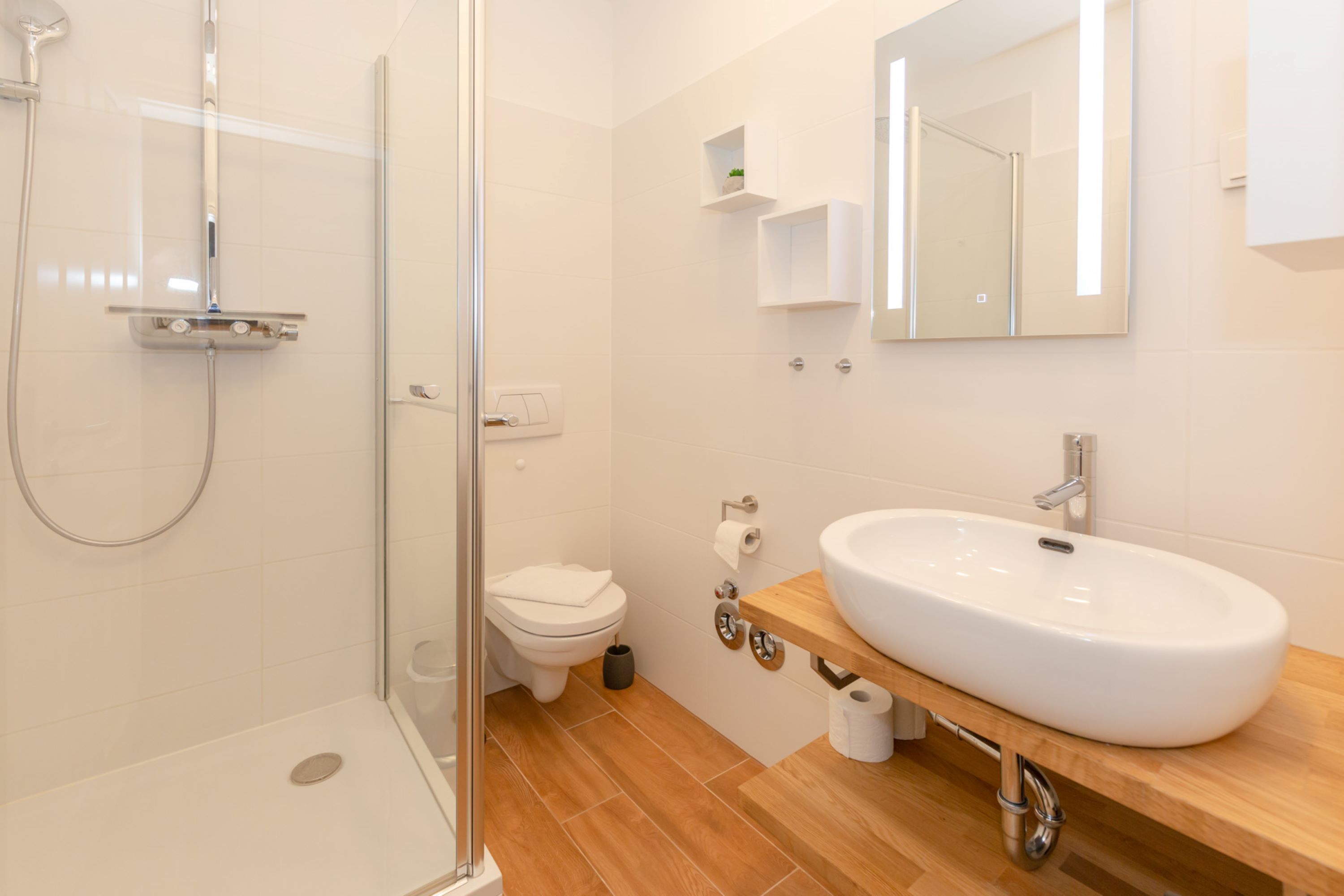 Das hell erleuchtete Badezimmer überzeugt mit einer Dusche, einem WC und einem Waschbecken.
