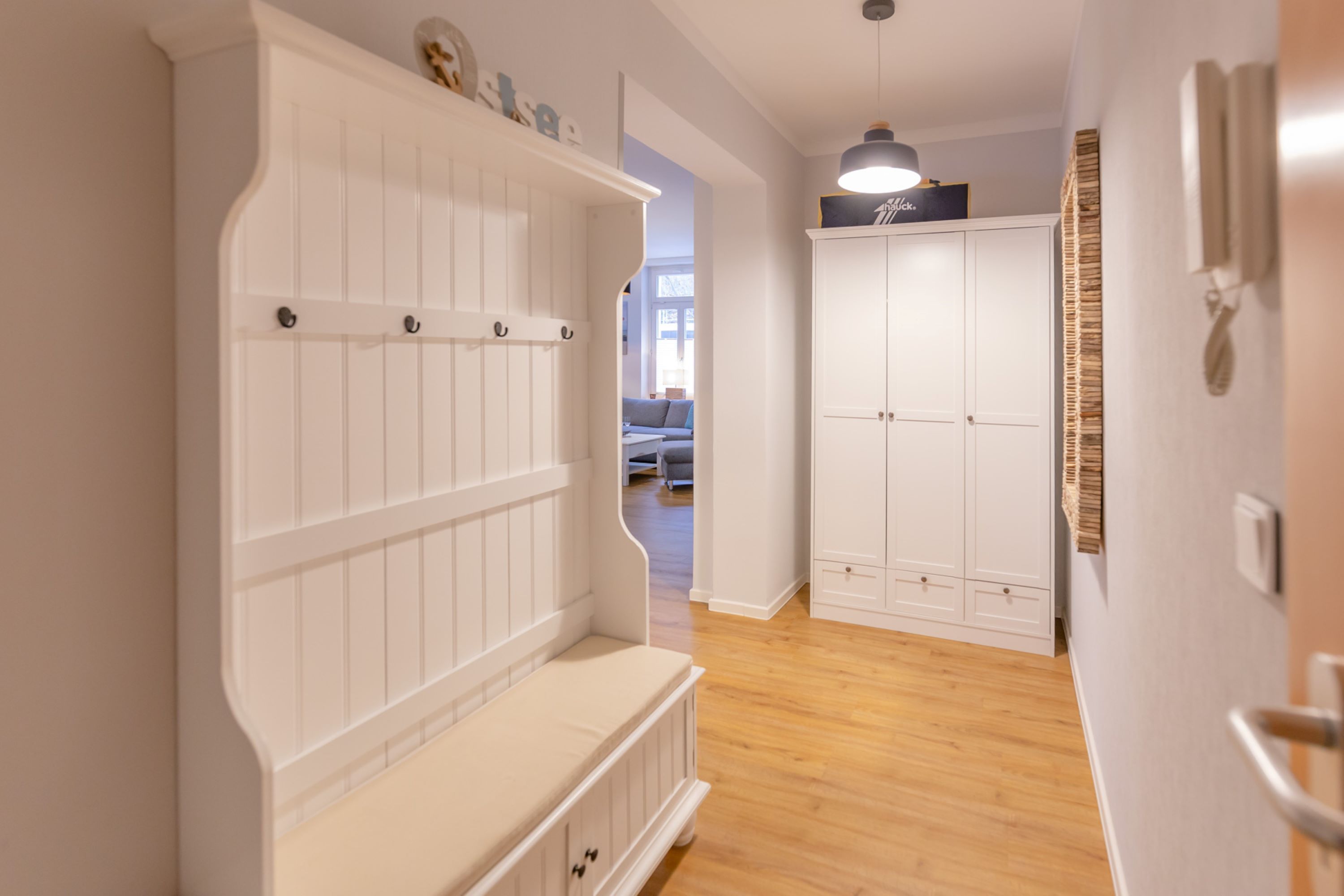Betreten Sie den freundlichen Flurbereich, der Sie in alle anderen Räume führt. Das große Wohnzimmer mit der offenen Küche ist ein echter Hingucker: modern, stilvoll und trotzdem gemütlich eingerichtet.