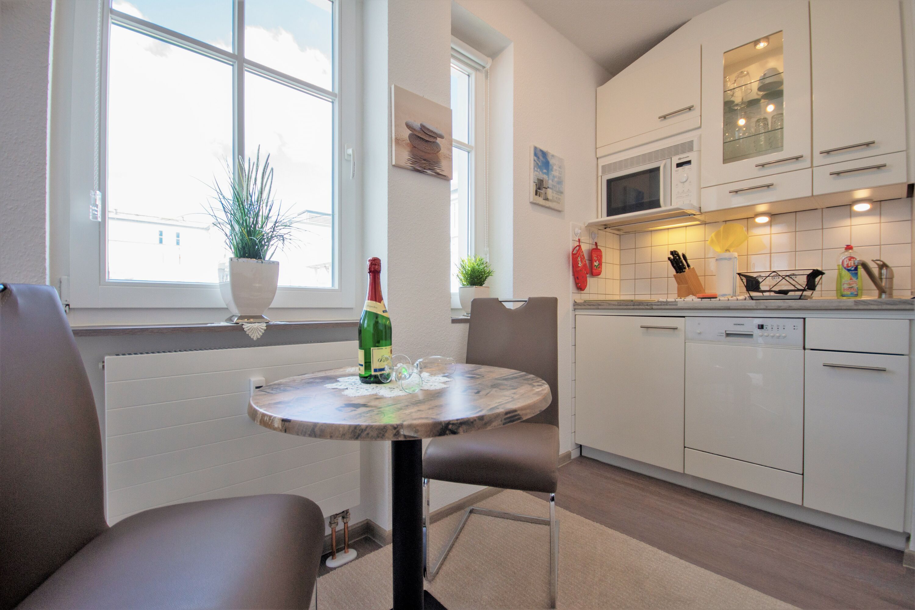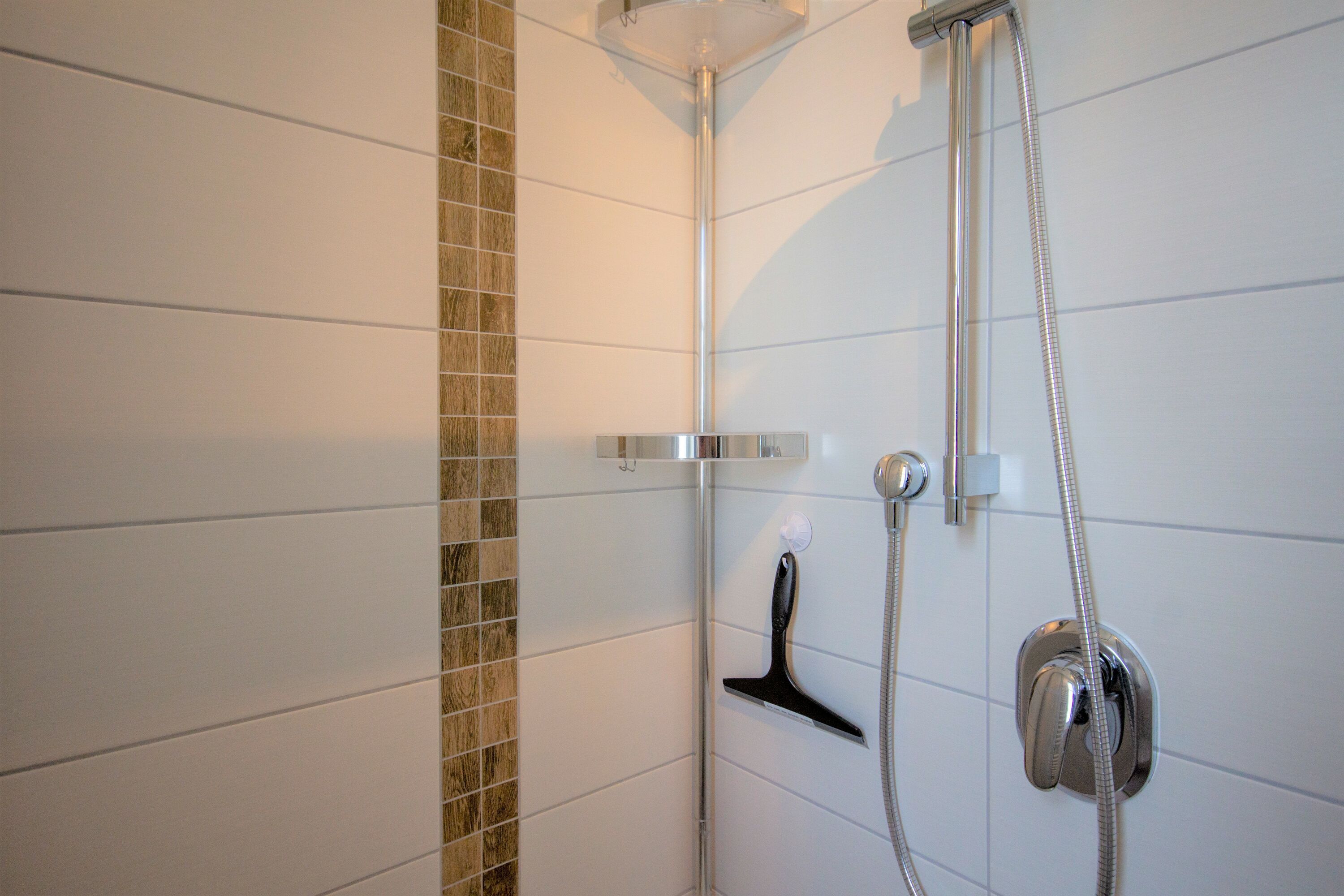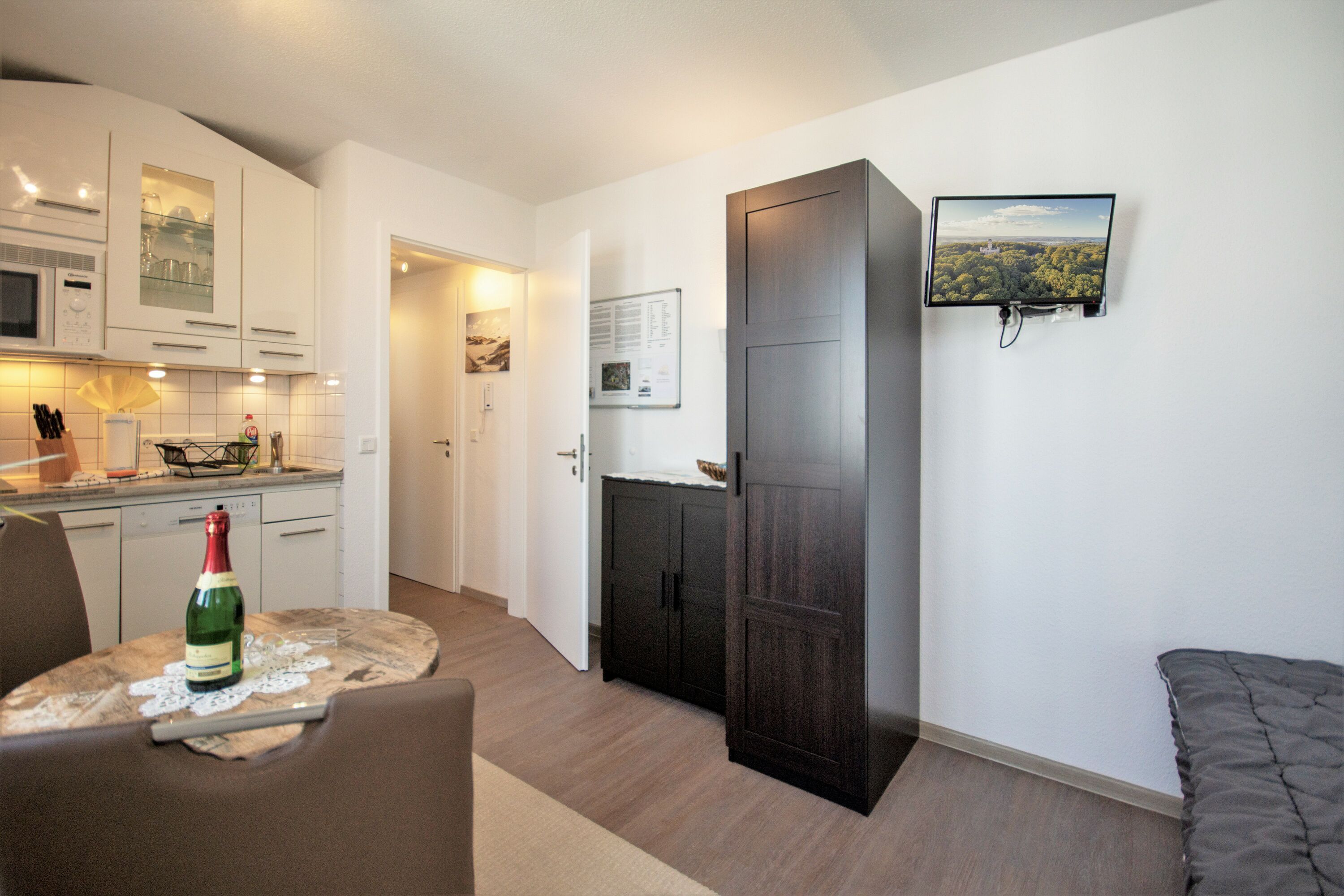 Die separate Küchenzeile mit 2 Ceranfeldern und einem Kühlschrank, beinhaltet außerdem Kaffeemaschine, Geschirrspüler, Toaster, Mikrowelle, Wasserkocher und Geschirr. Das moderne Duschbad ist mit WC, Dusche und Waschbecken ausgestattet.