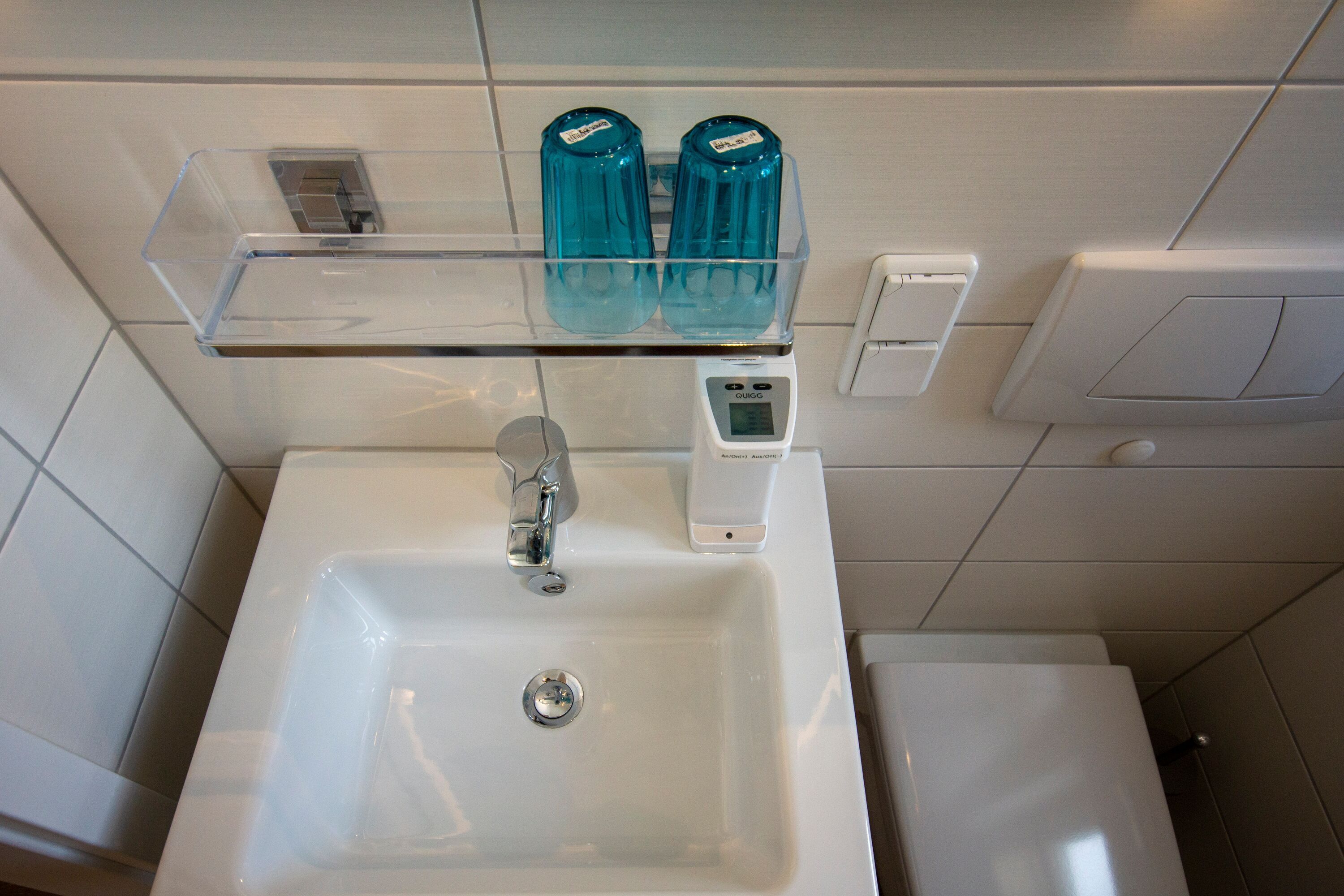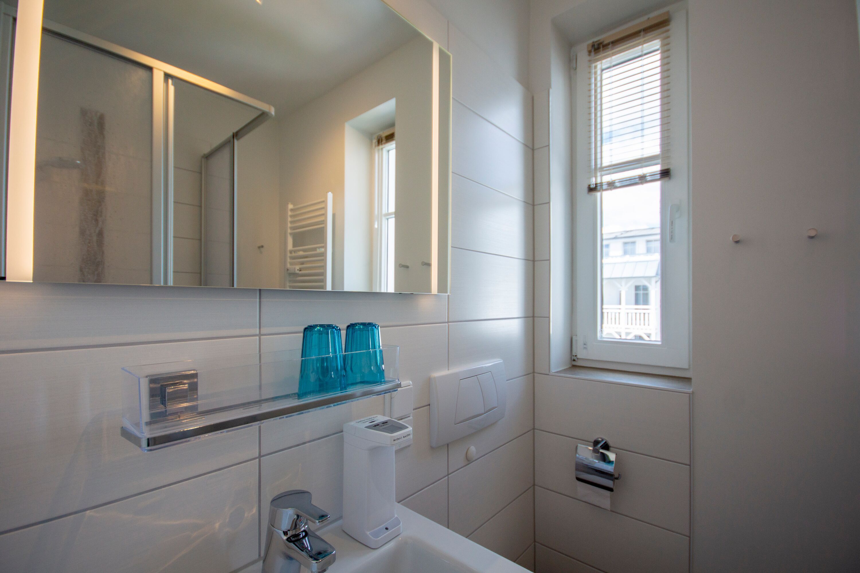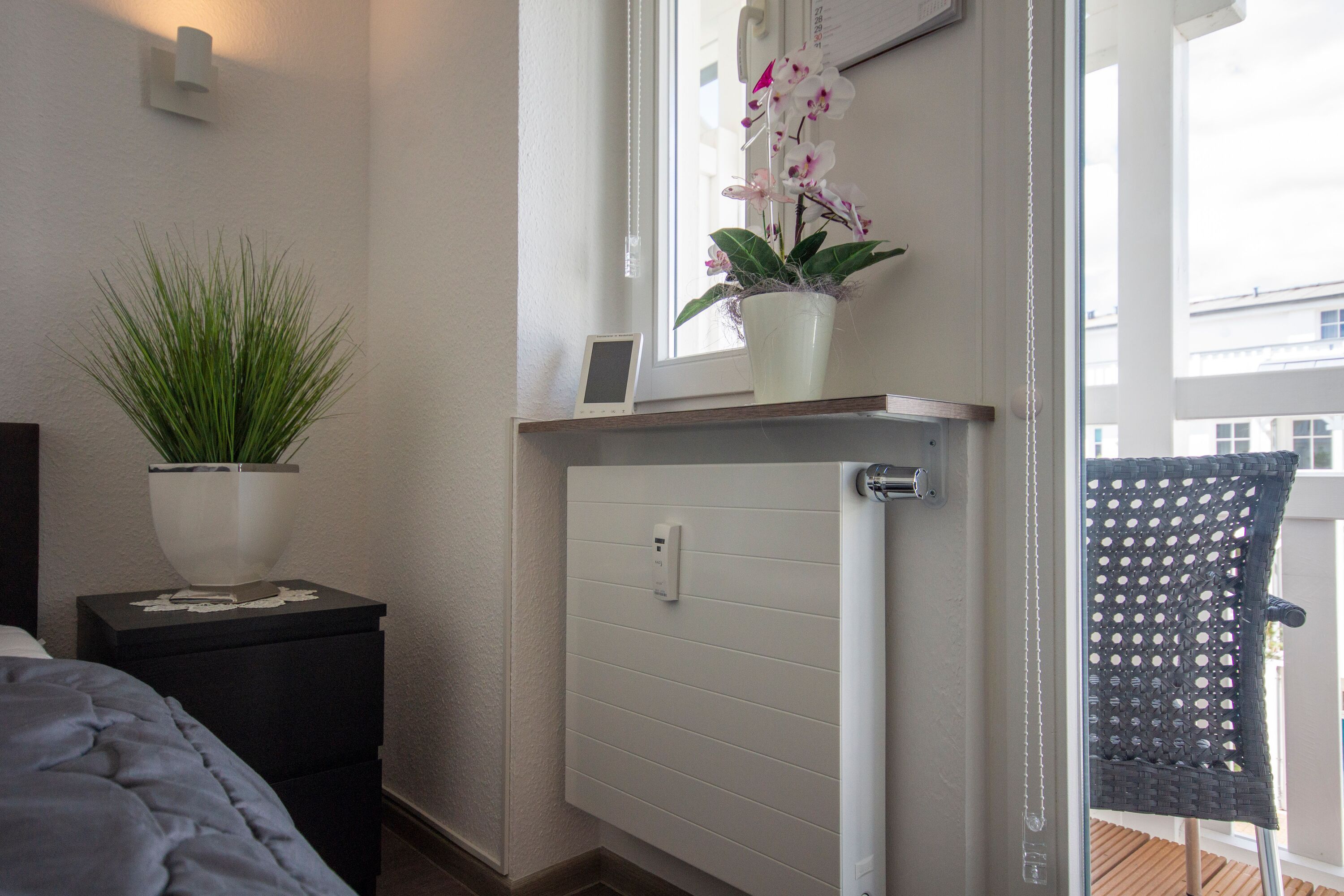 Die separate Küchenzeile mit 2 Ceranfeldern und einem Kühlschrank, beinhaltet außerdem Kaffeemaschine, Geschirrspüler, Toaster, Mikrowelle, Wasserkocher und Geschirr. Das moderne Duschbad ist mit WC, Dusche und Waschbecken ausgestattet.