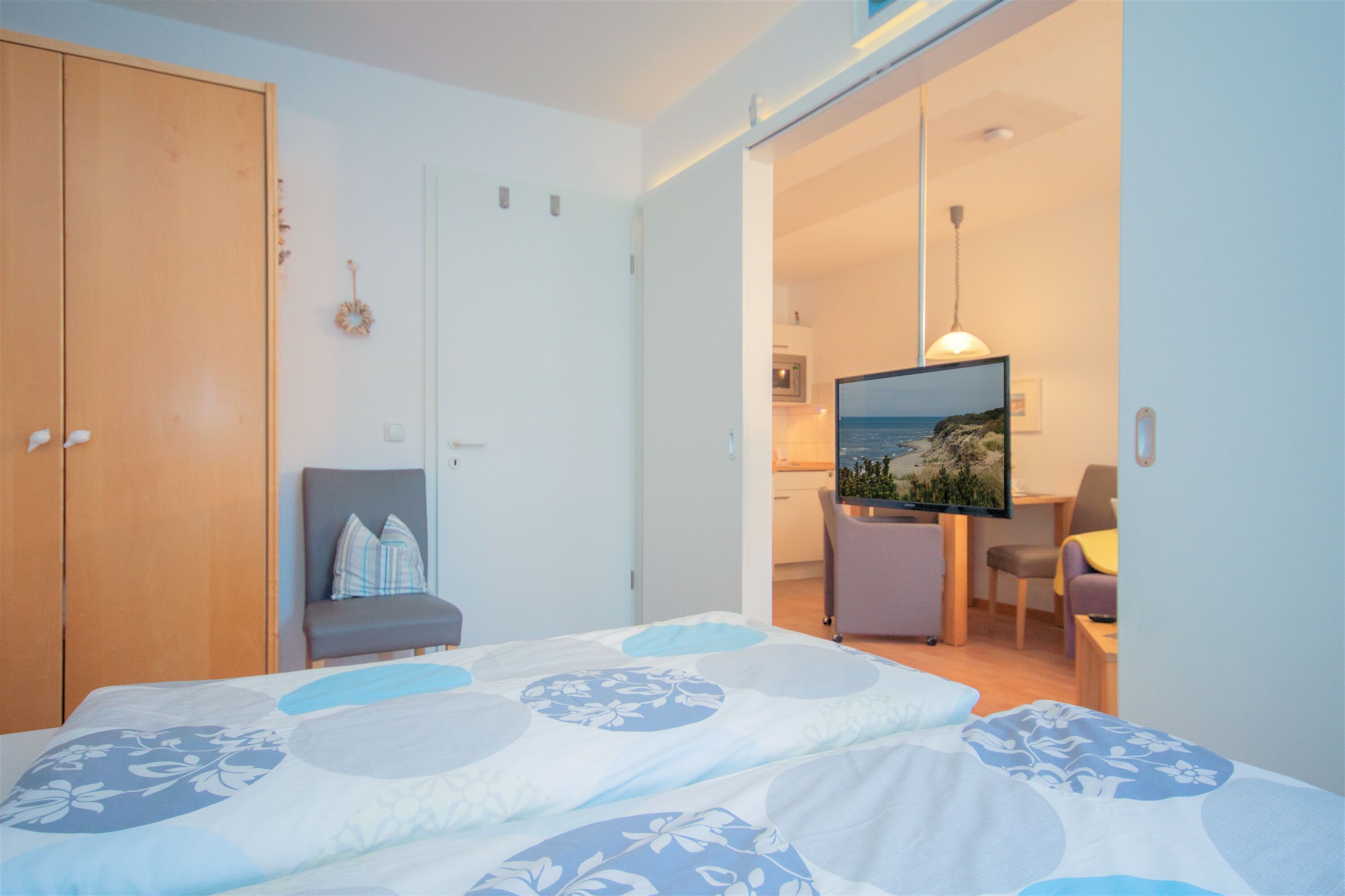 Der freundliche Wohn- und Essbereich lädt nicht nur, dank der offenen, integrierten Küche, zu kulinarischen Kochabenden ein, sondern bietet auch genügend Platz, um einfach mal die Seele baumeln zu lassen. Ausgestattet mit einer hochwertigen Couchgarnitur und einem kleinen Essbereich findet man hier alles, was man zum Glücklichsein braucht. Der einmalige Flachbildfernseher lässt sich dank einem eigens dafür konzipierten Schalter drehen und bewegen sodass Sie auch im angrenzenden Schlafraum Fernsehen können. Zusätzlich befindet sich im Wohnbereich eine USB-Steckdose. Das dort stehende gemütliche Doppelbett mit LED-Beleuchtung garantiert erholsame Schlafstunden. Über den freundlichen Wohn- und auch über den Schlafbereich erreicht man den überdachten, hellen Balkon.